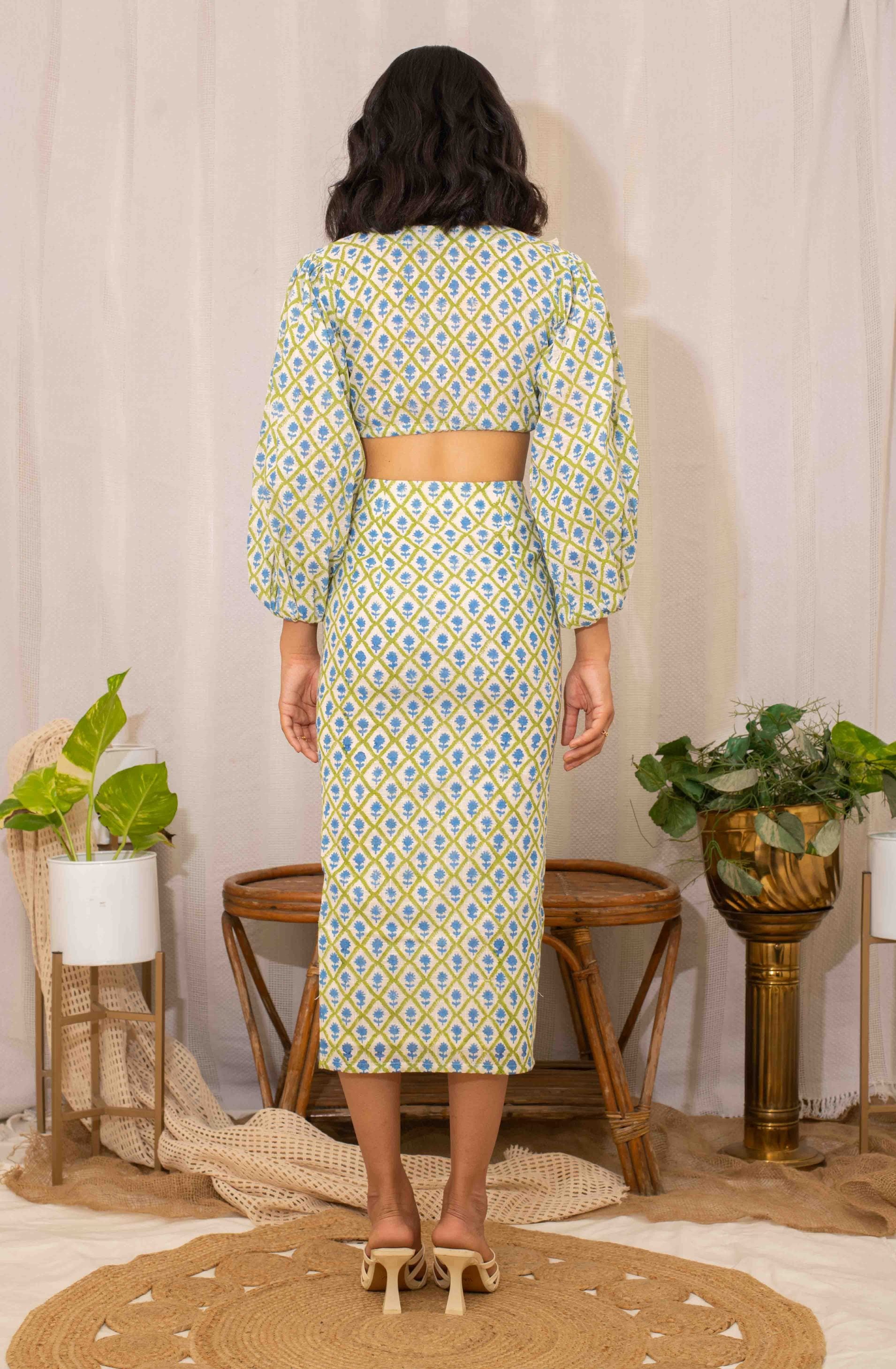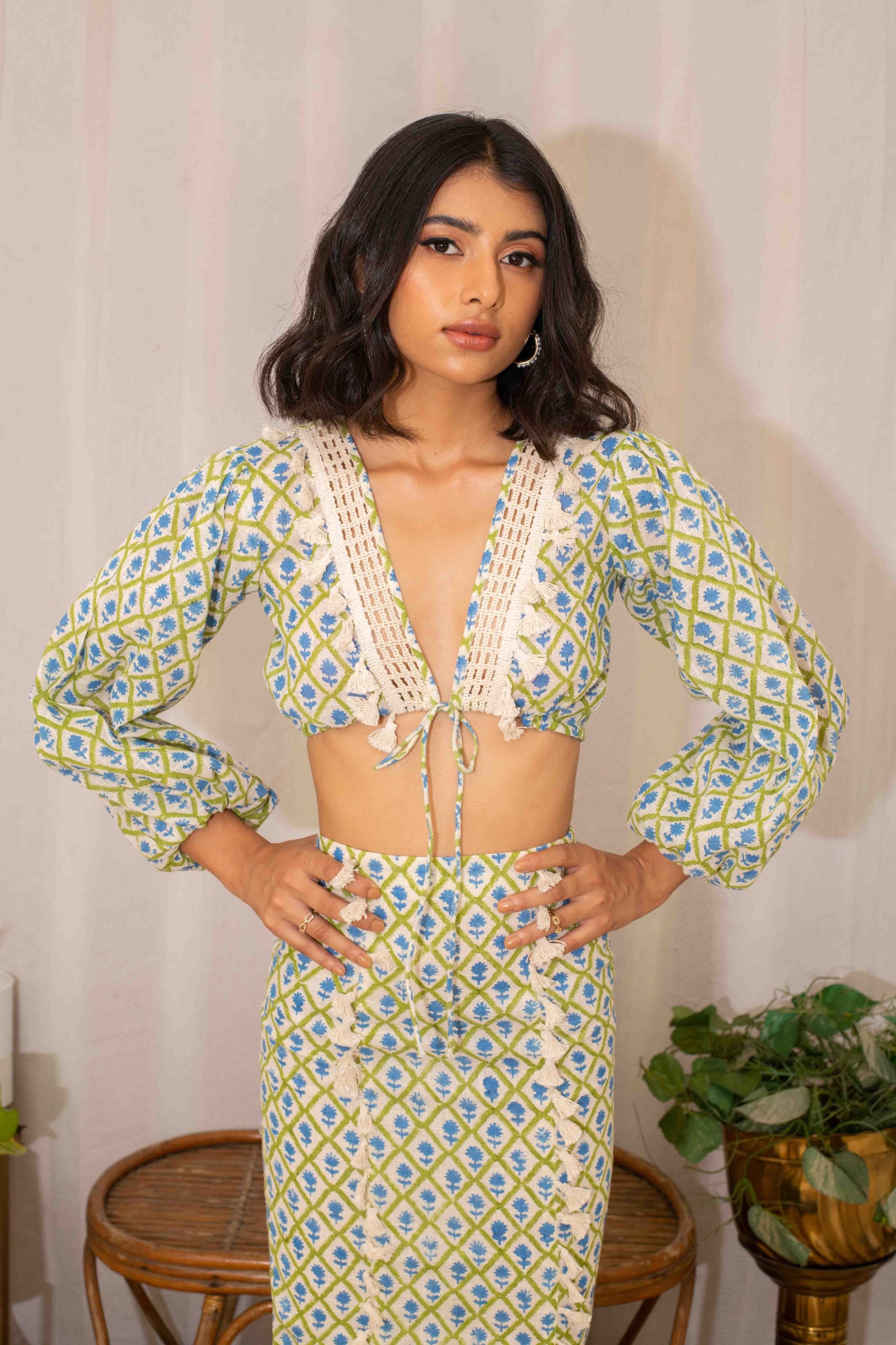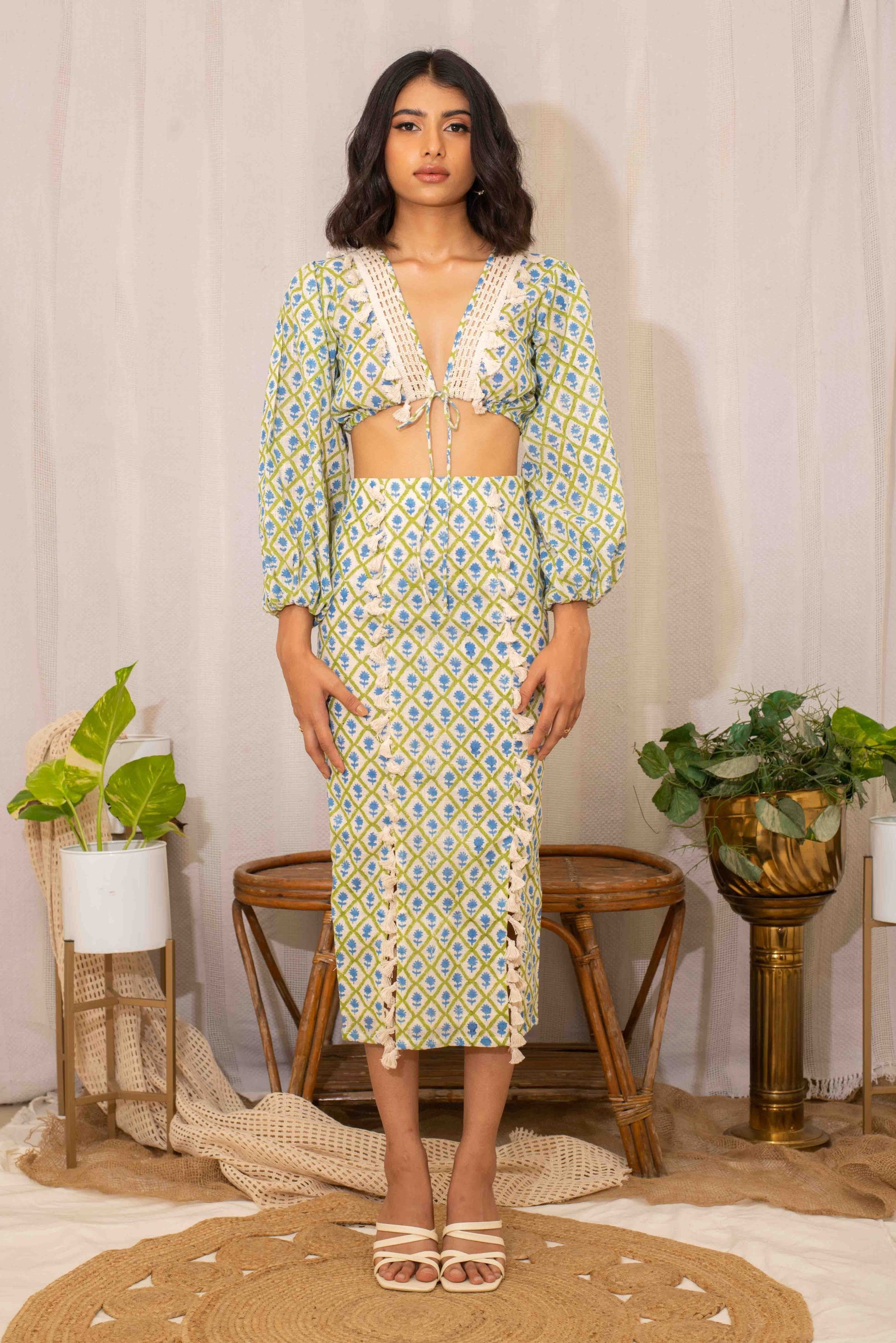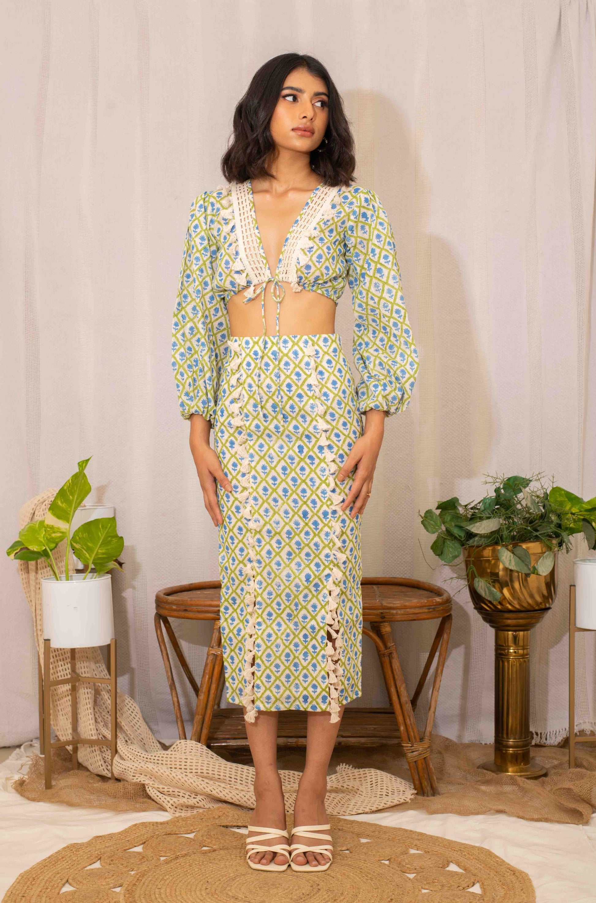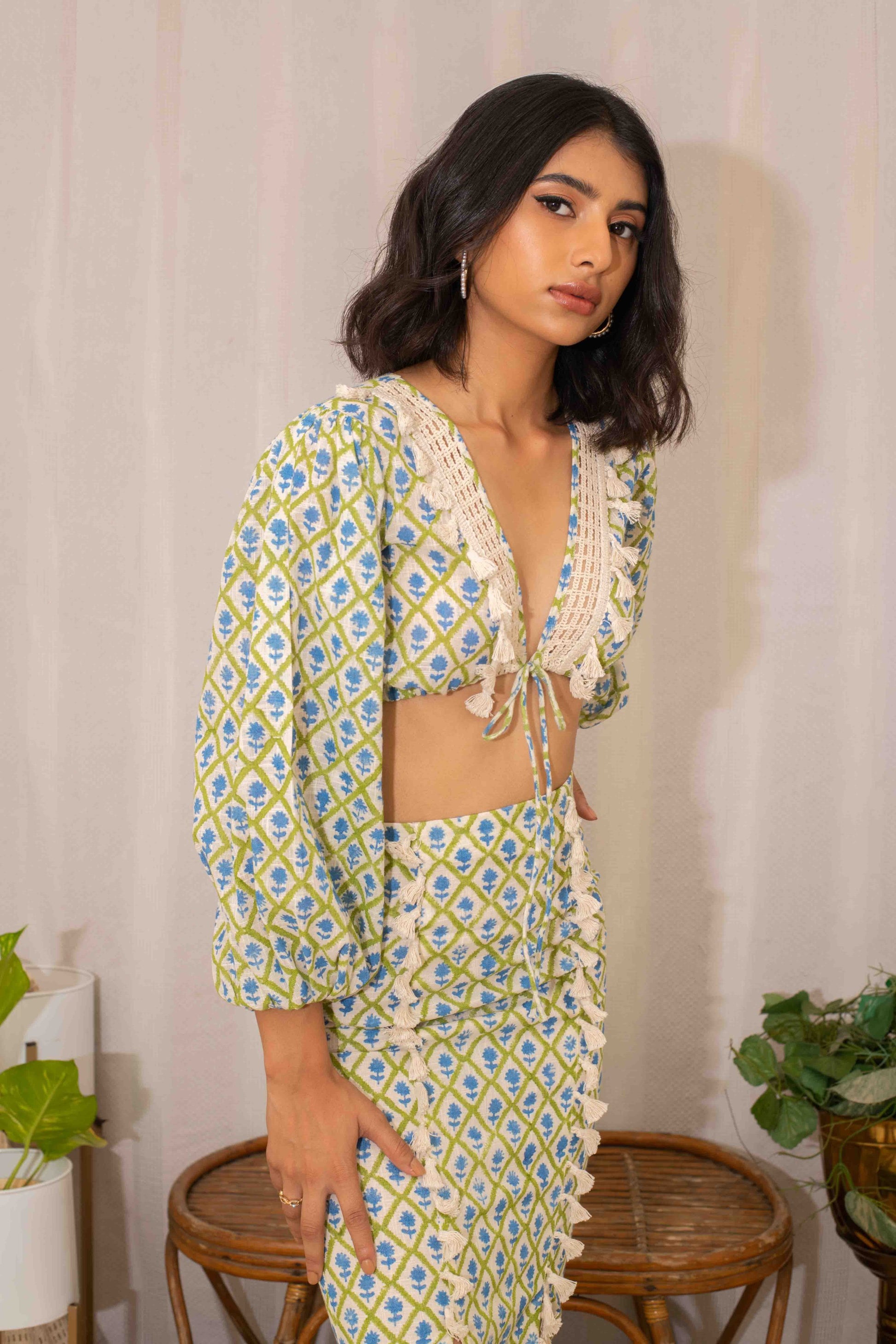 This cotton handblock printed blouse with lace work is paired with a pencil skirt, creating a chic and feminine outfit. Ideal for workwear or a polished casual event.