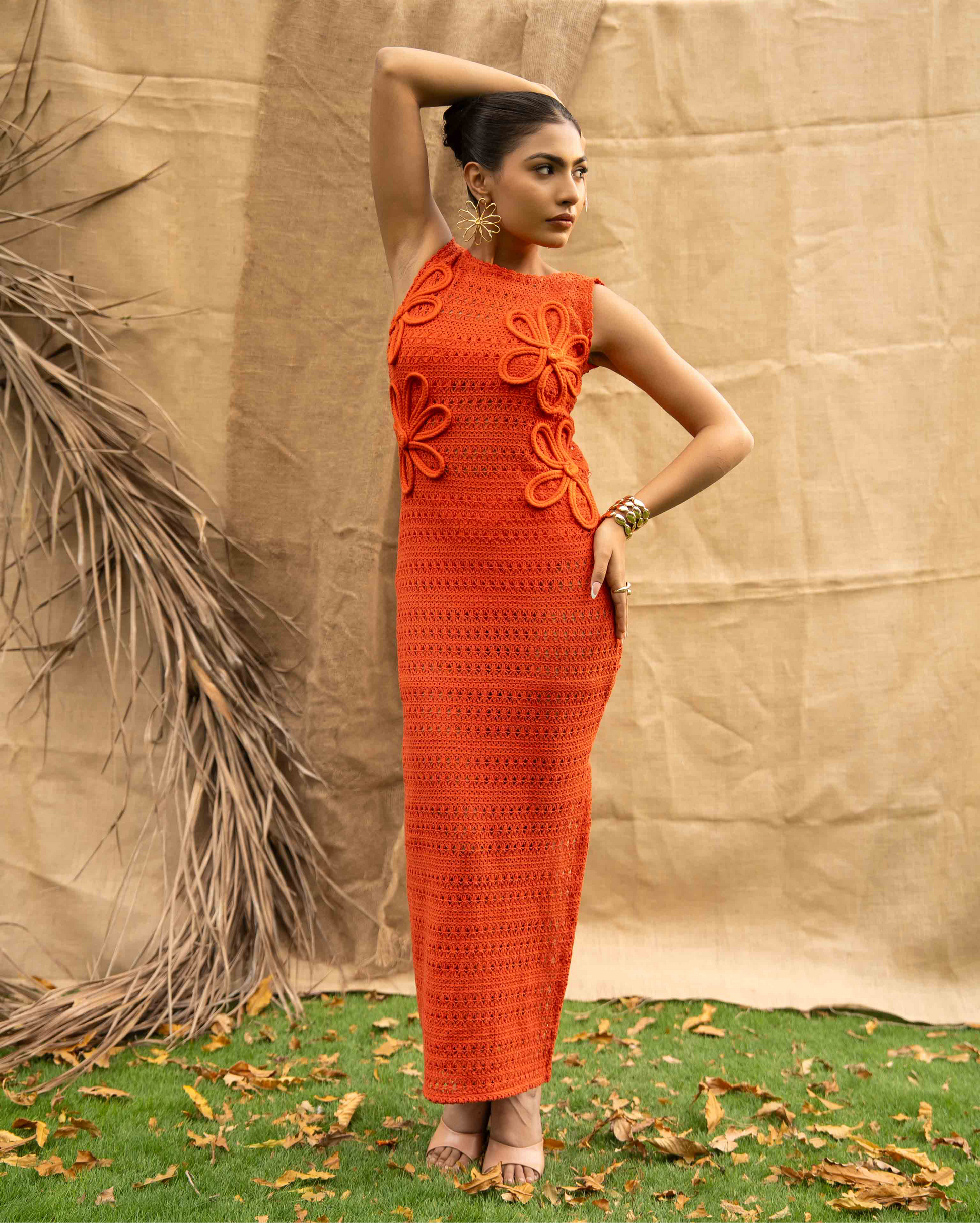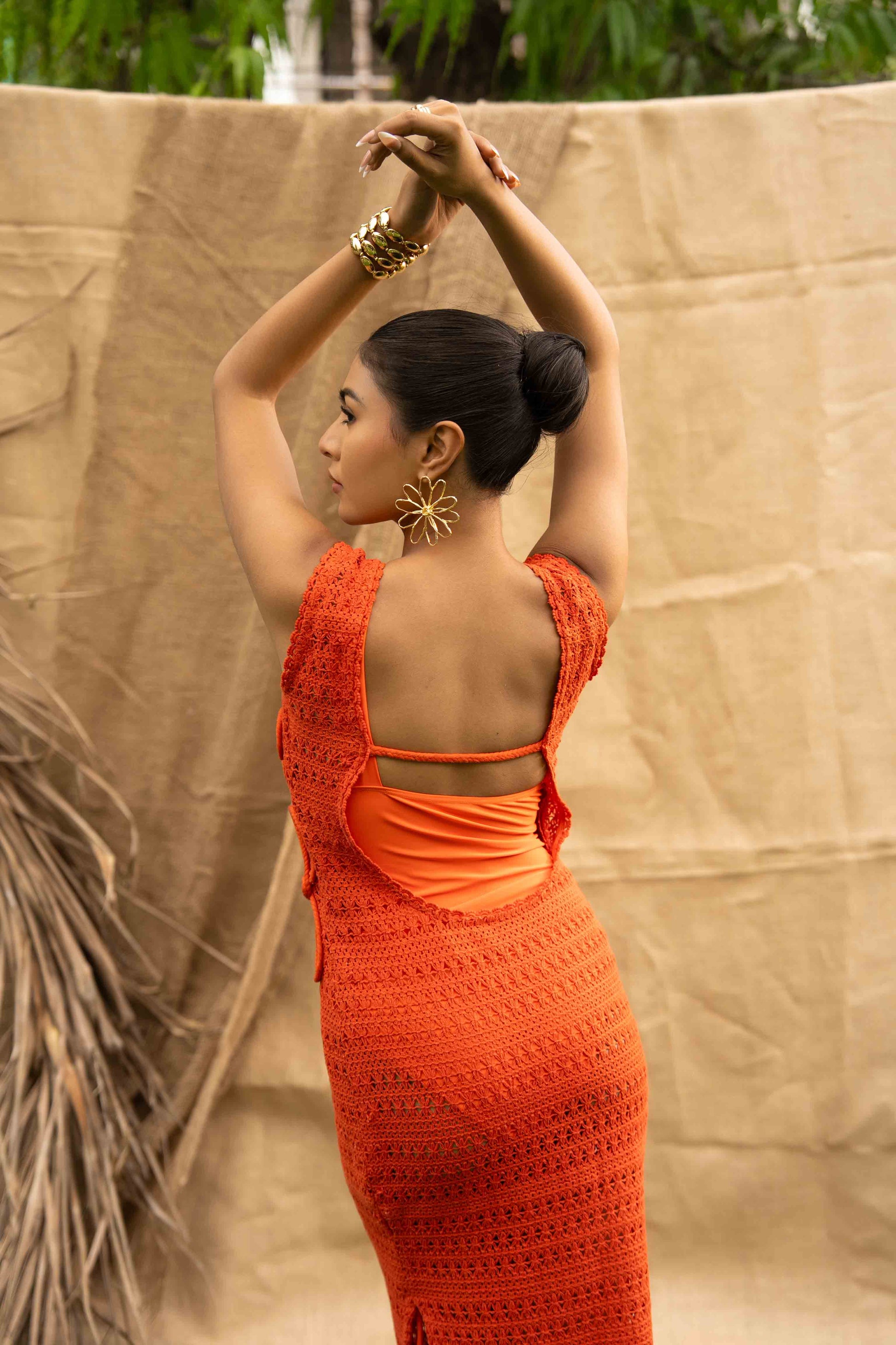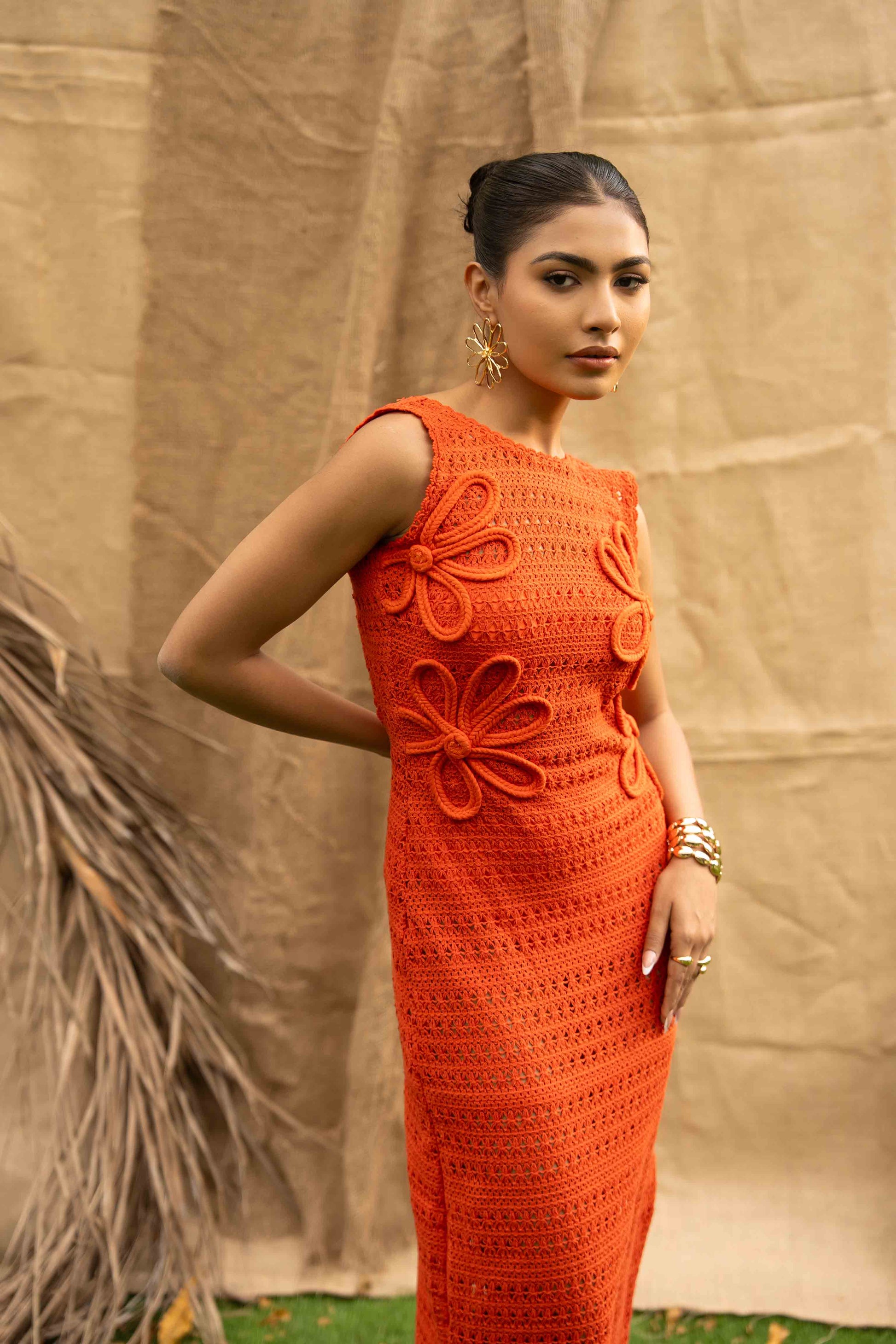 The AURELIE Dress is a striking full-length crochet maxi with intricate floral cutouts and lace details in a vibrant orange hue. Designed as a versatile daywear cover-up, its fitted silhouette adds elegance while keeping comfort at the forefront—perfect for summer days and beach outings.