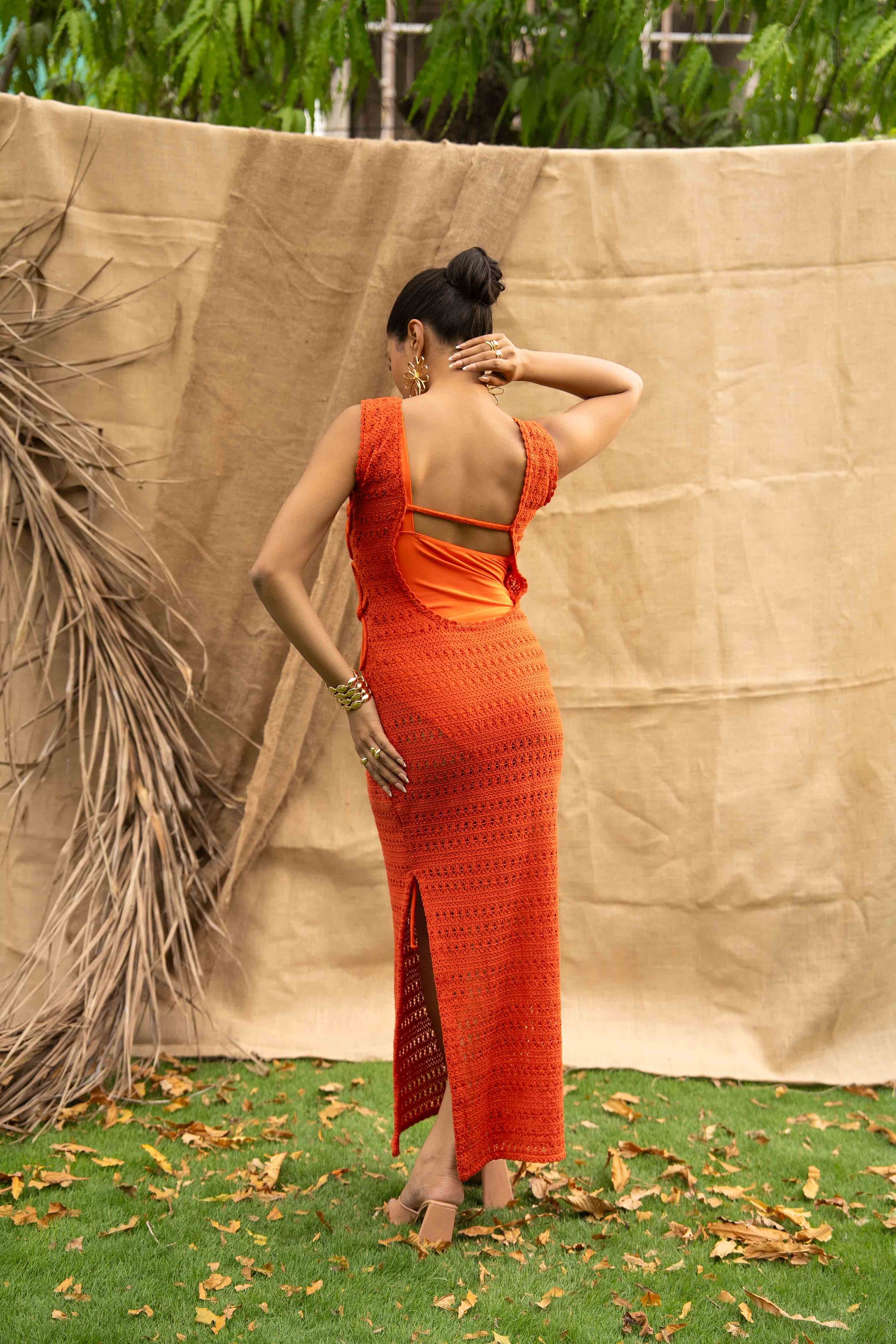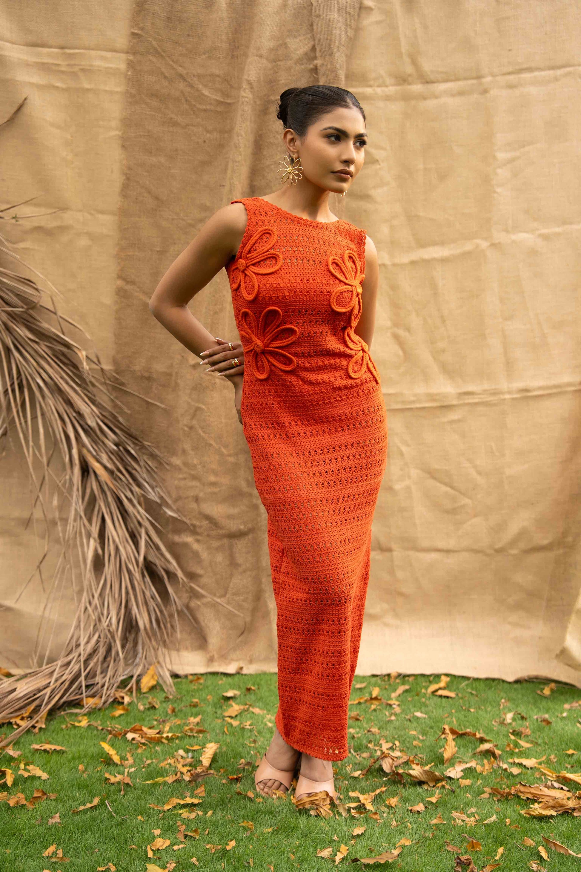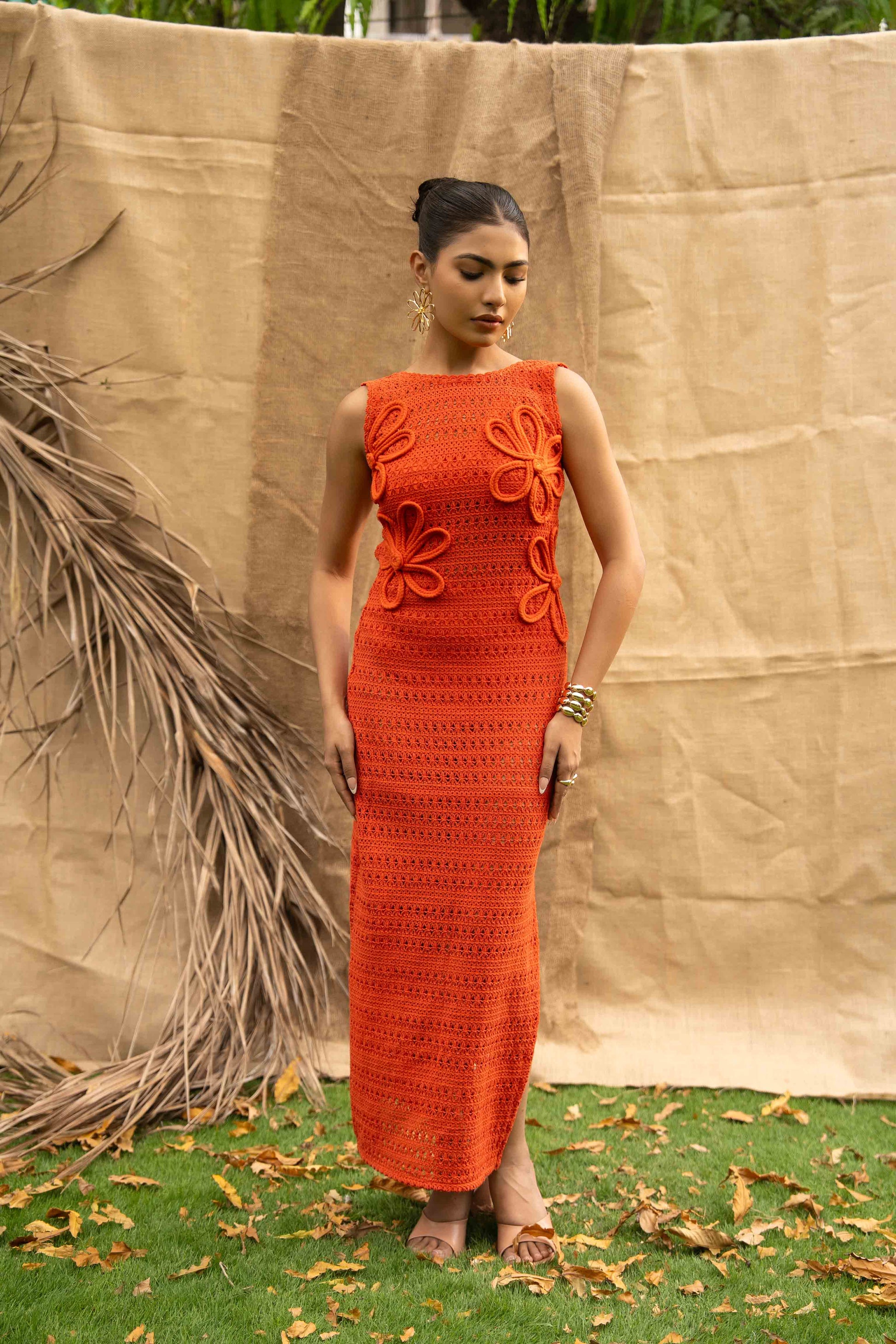 The AURELIE Dress is a striking full-length crochet maxi with intricate floral cutouts and lace details in a vibrant orange hue. Designed as a versatile daywear cover-up, its fitted silhouette adds elegance while keeping comfort at the forefront—perfect for summer days and beach outings.