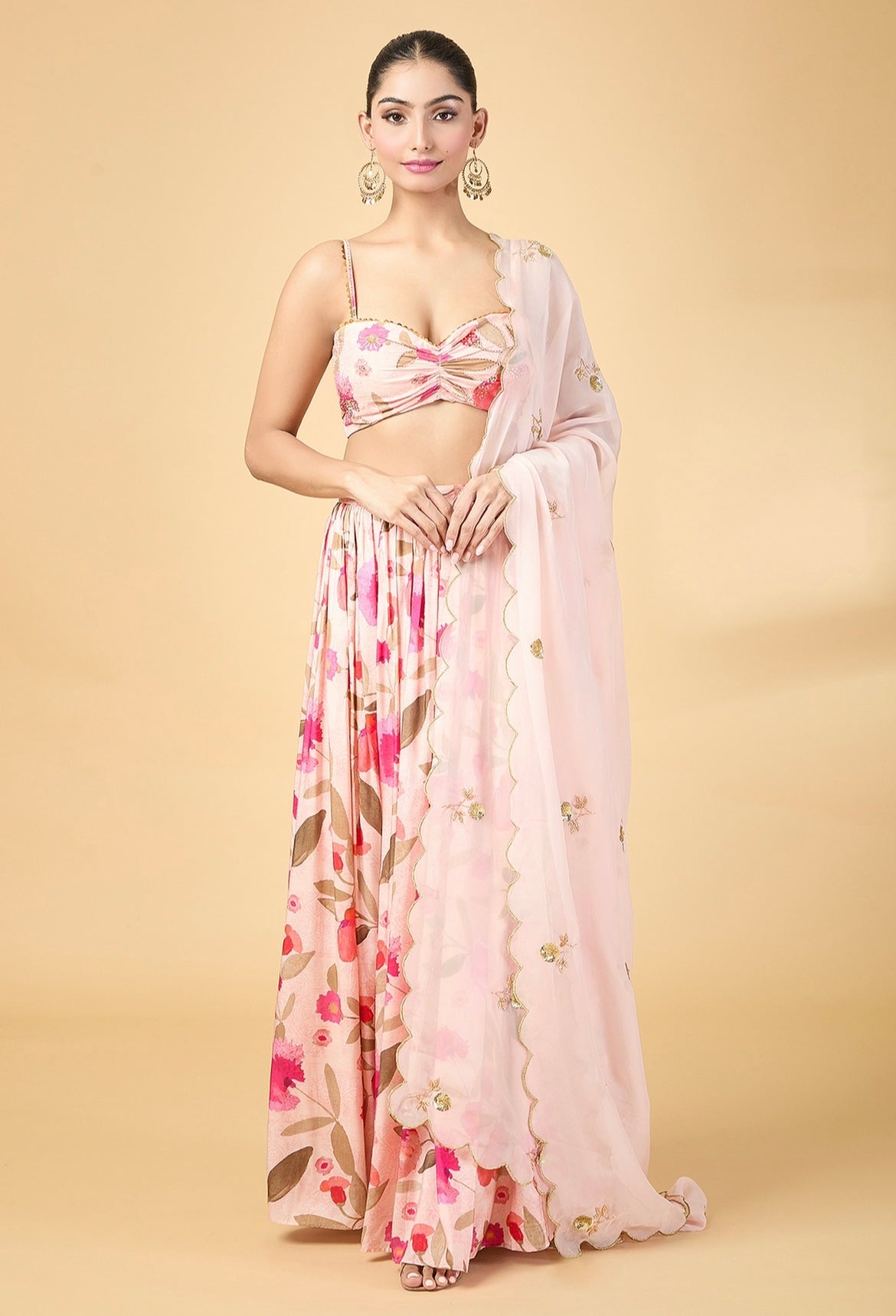 This BABY PINK FLORAL PRINTED LEHENGA set features a sweetheart silk muslin blouse adorned with floral prints, sequins, and intricate aari and zardosi embroidery. Paired with a matching lehenga and a scalloped-hem organza dupatta, beautifully embellished with aari zardosi embroidered buttis, perfect for festive occasions.