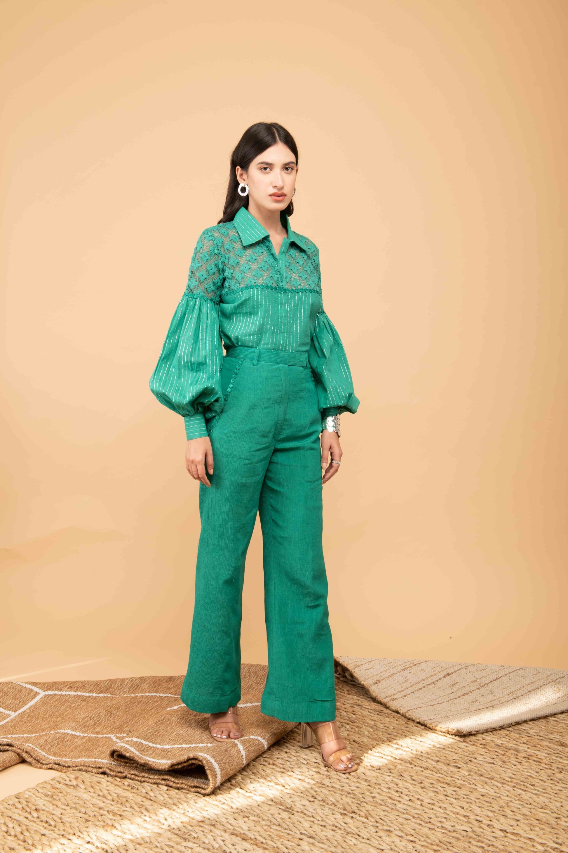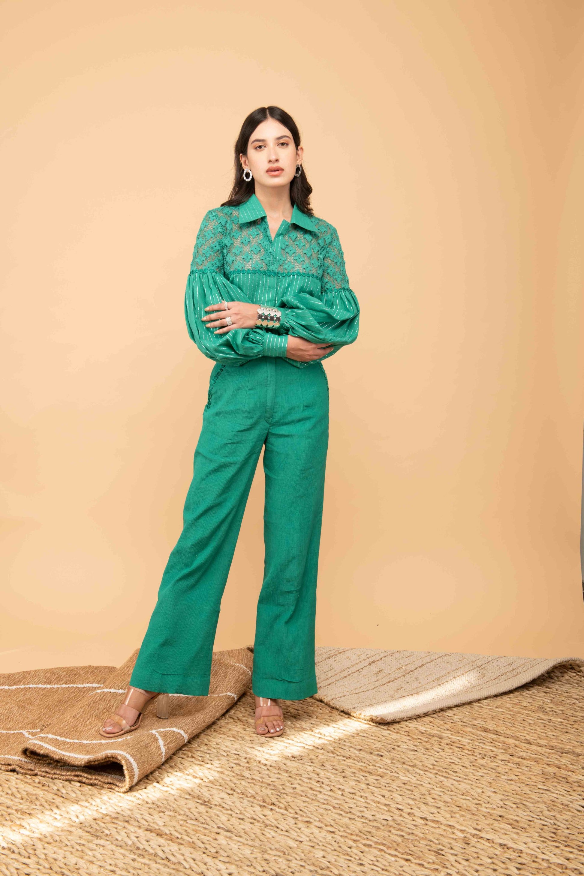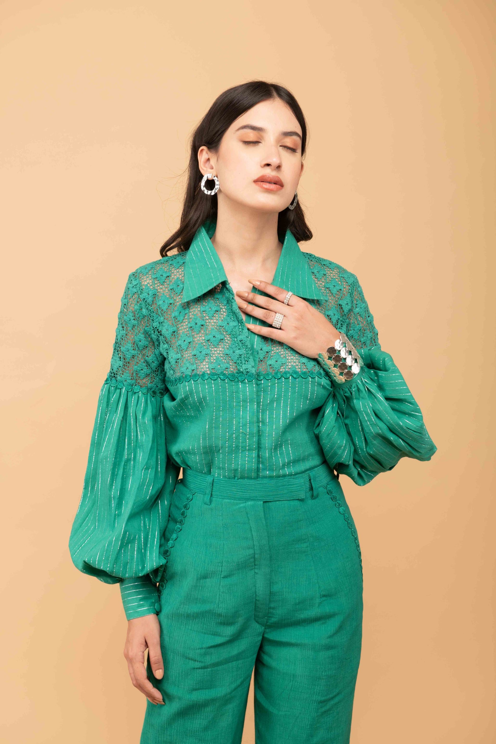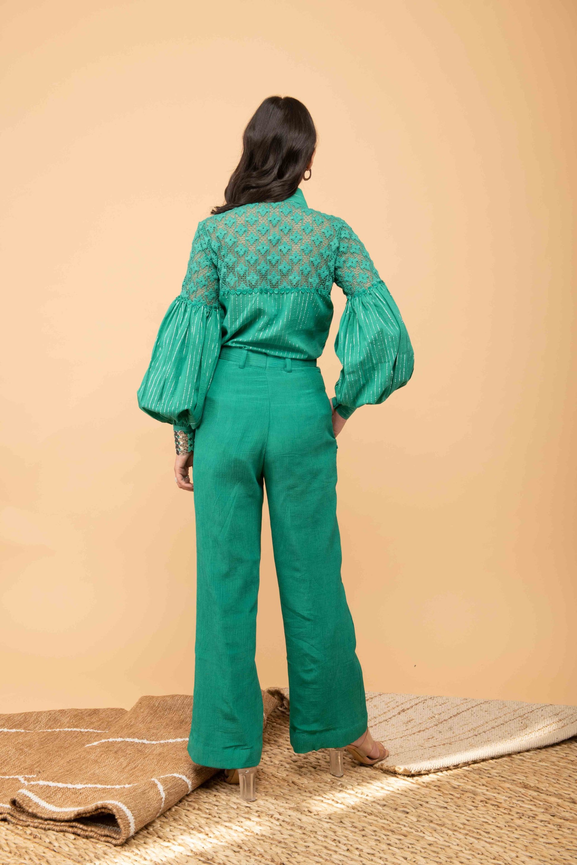 This bottle green lurex lace shirt is paired with crinkle crepe pants adorned with lace details. The shimmering fabric adds a touch of glamour, making this set perfect for a chic evening out.