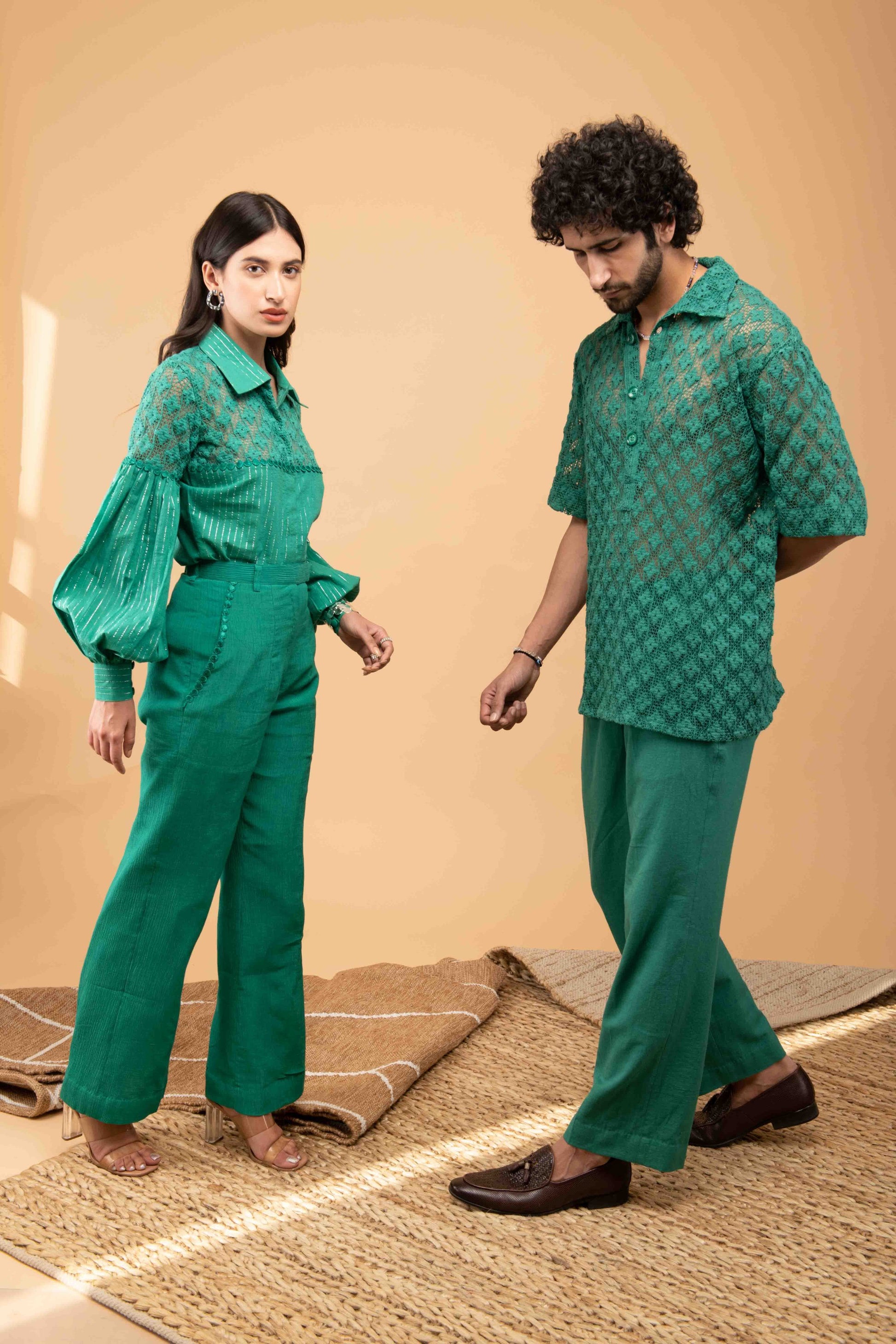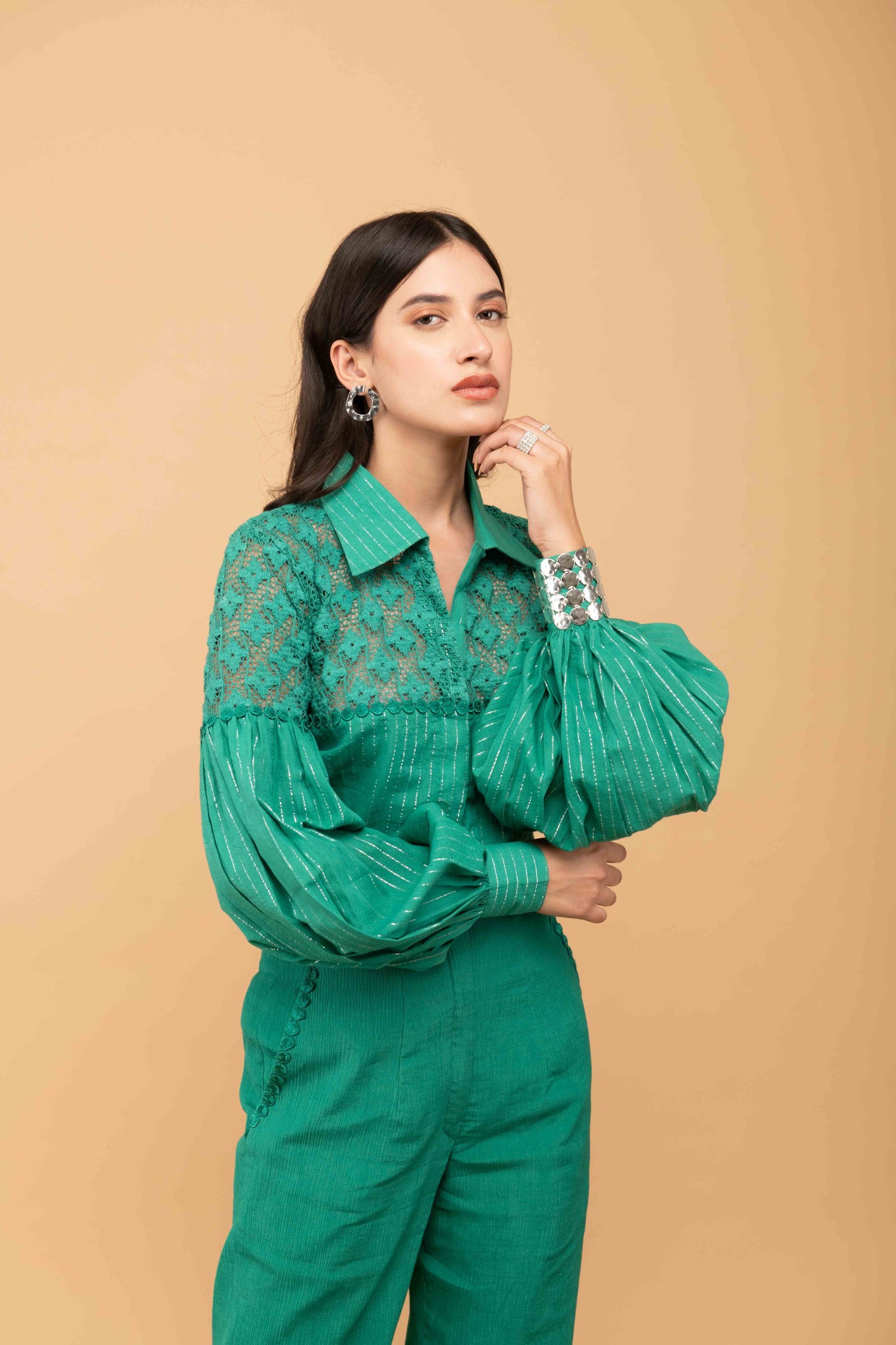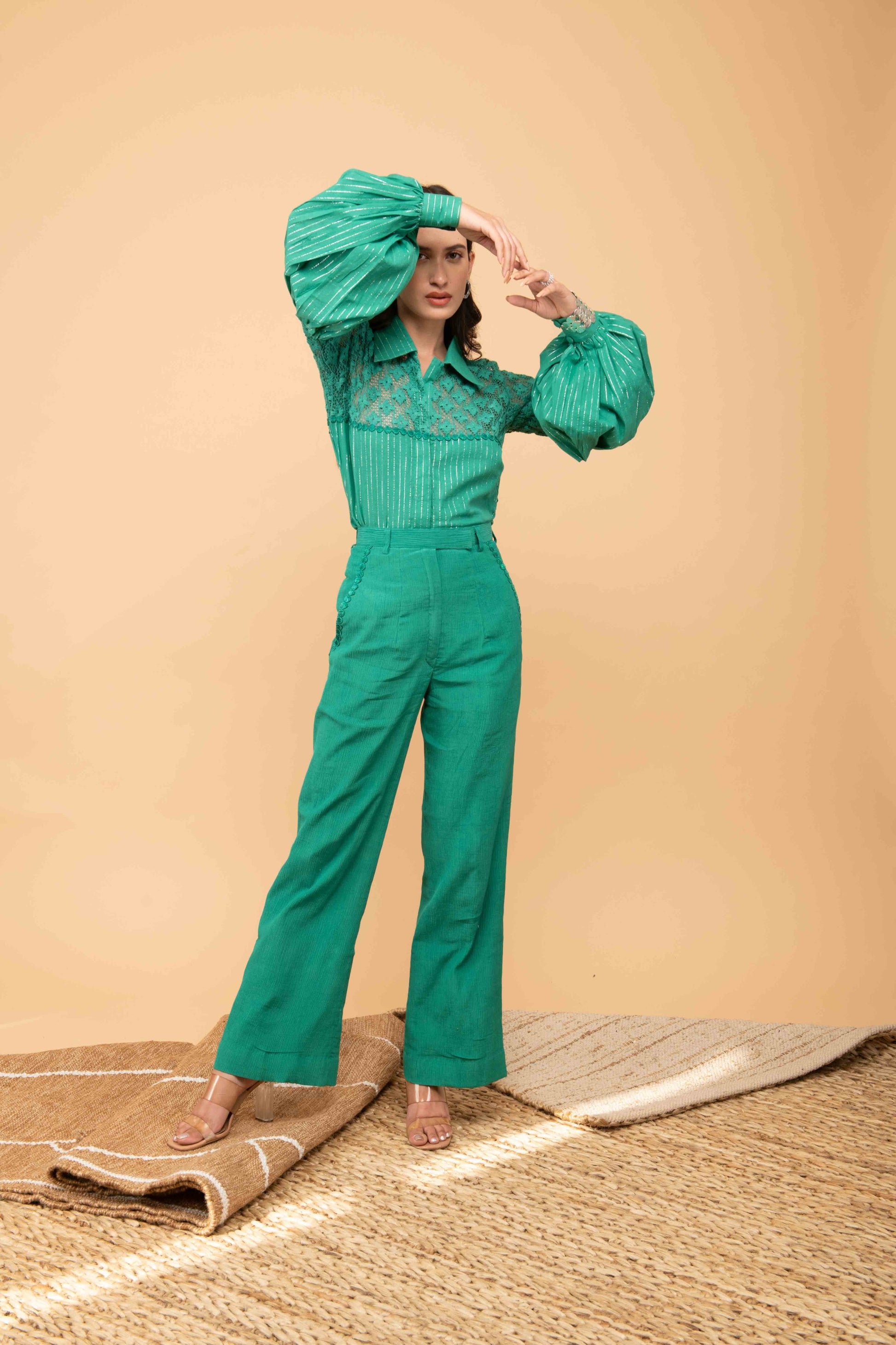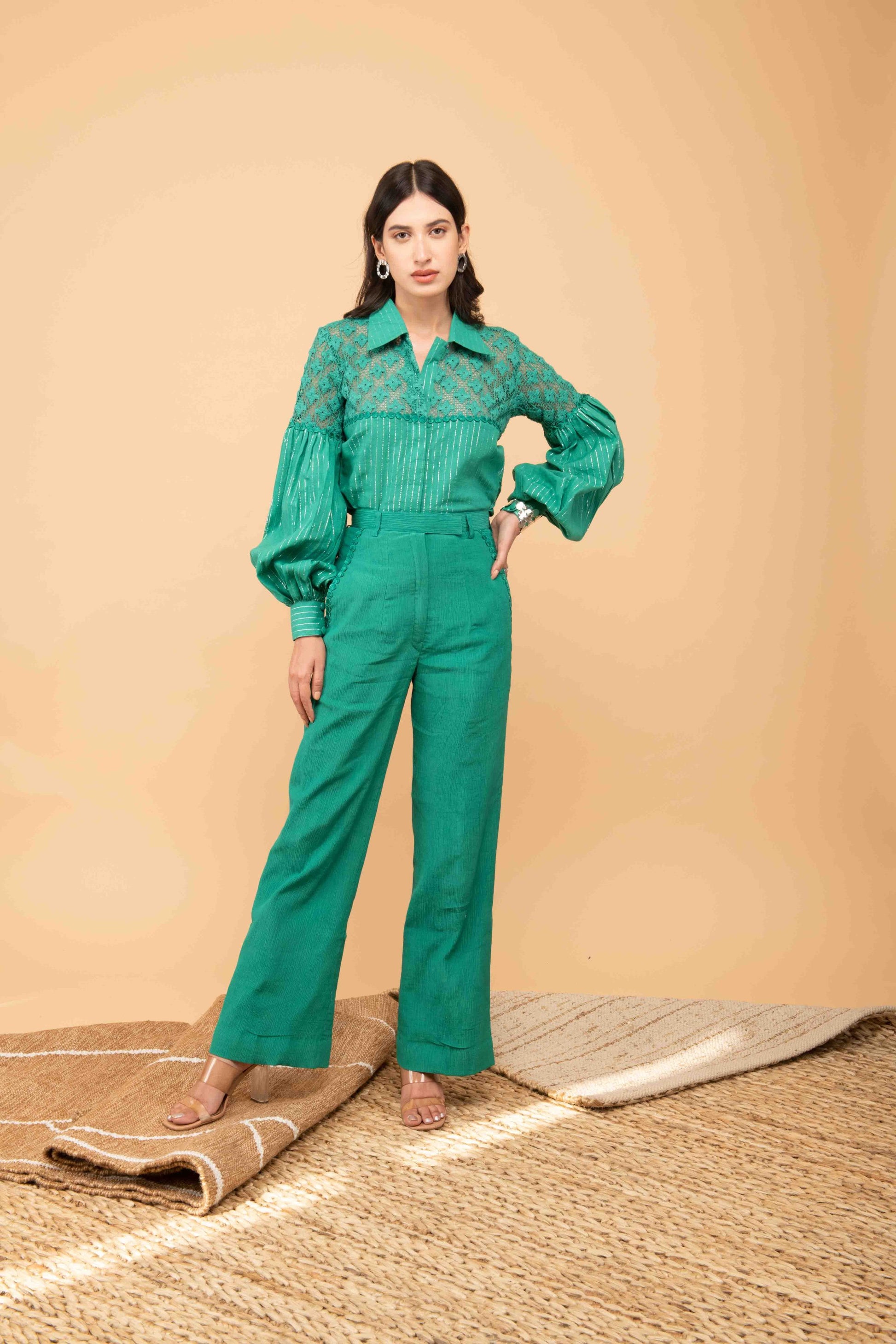 This bottle green lurex lace shirt is paired with crinkle crepe pants adorned with lace details. The shimmering fabric adds a touch of glamour, making this set perfect for a chic evening out.
