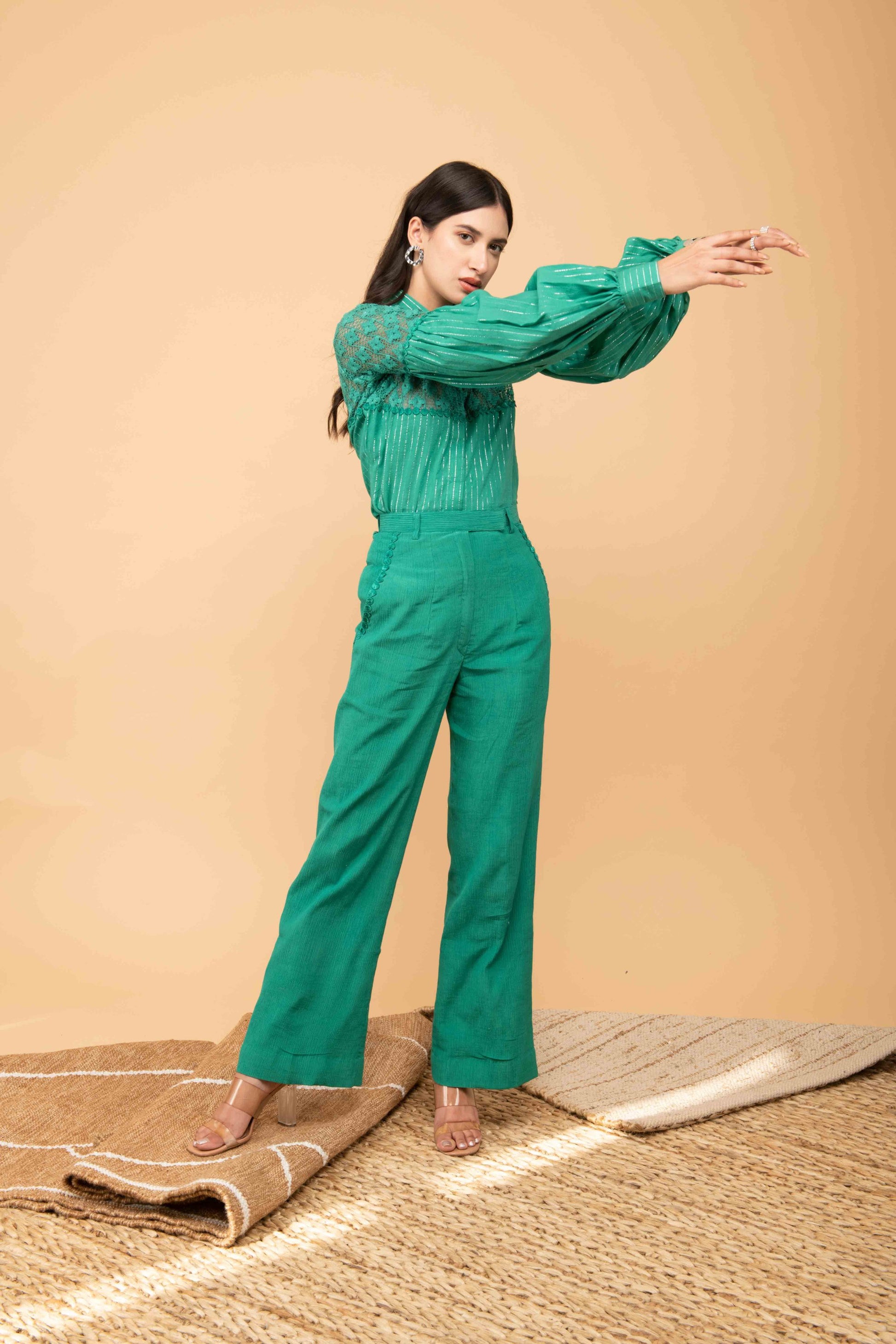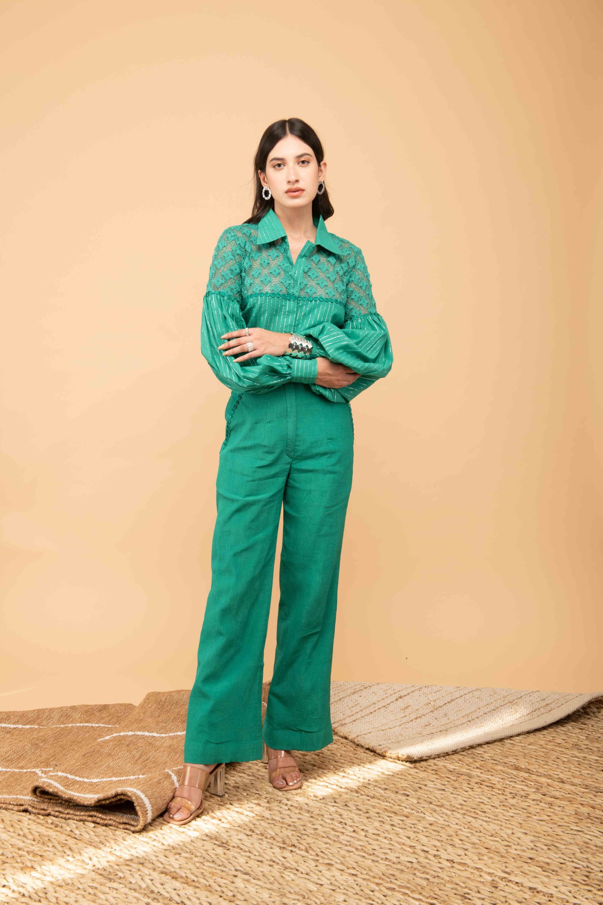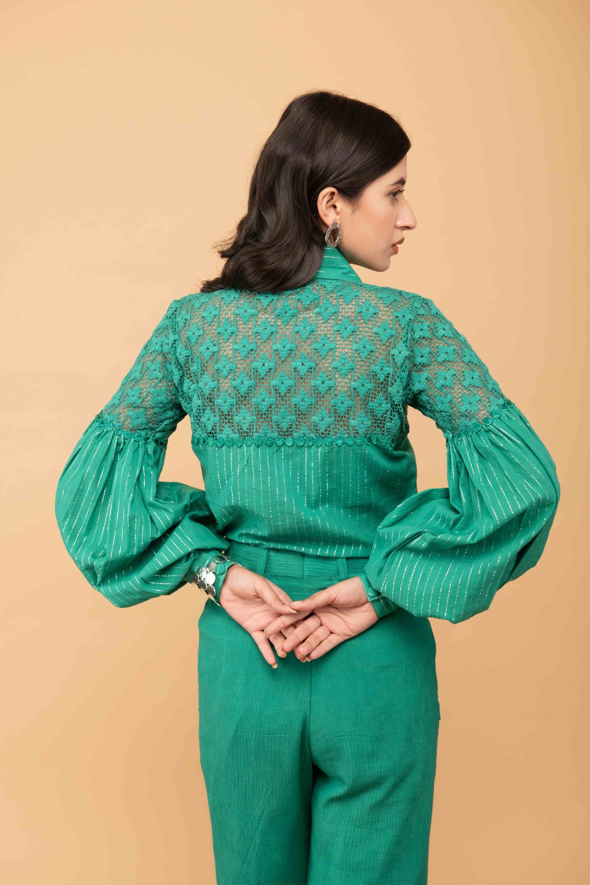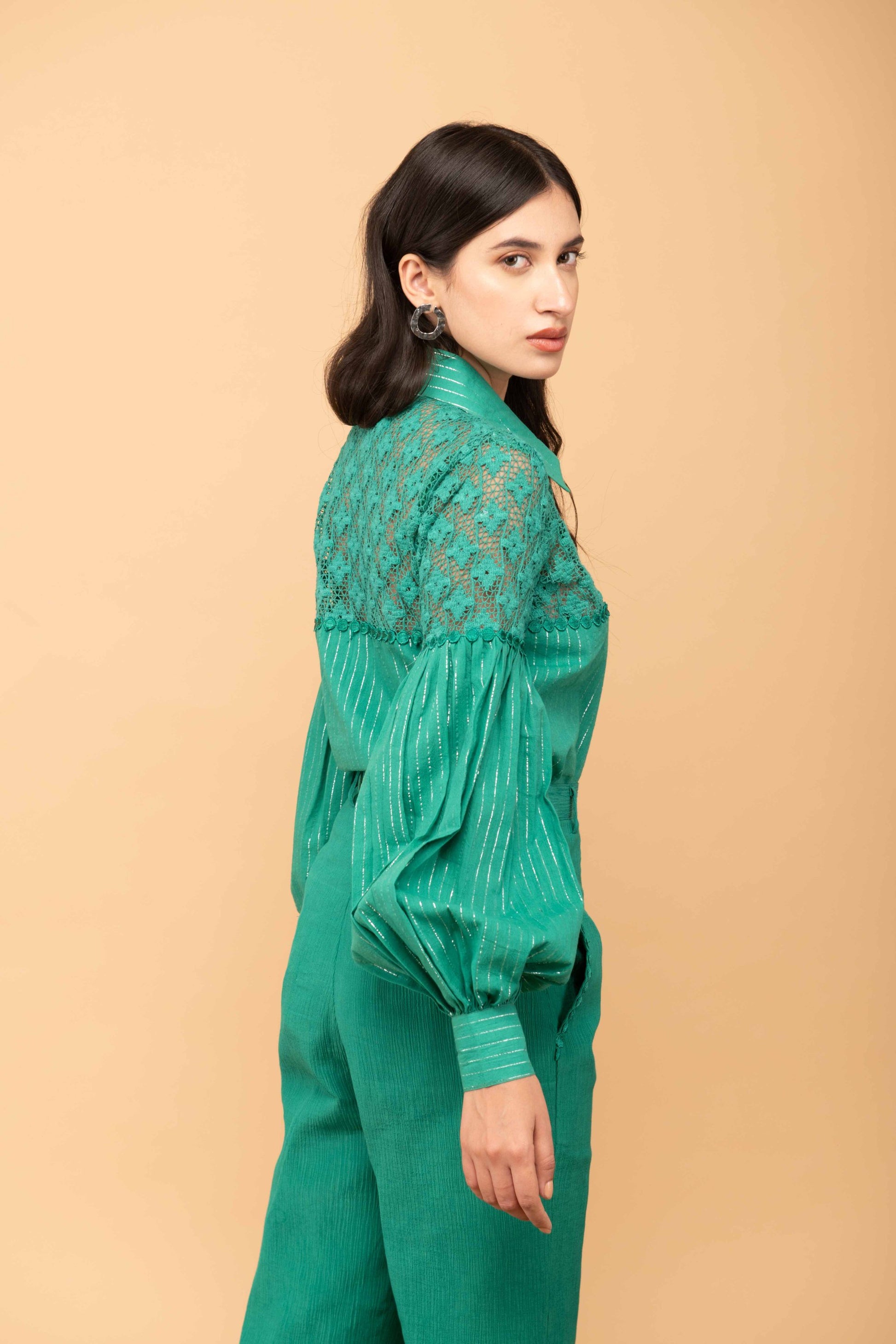 This bottle green lurex lace shirt is paired with crinkle crepe pants adorned with lace details. The shimmering fabric adds a touch of glamour, making this set perfect for a chic evening out.