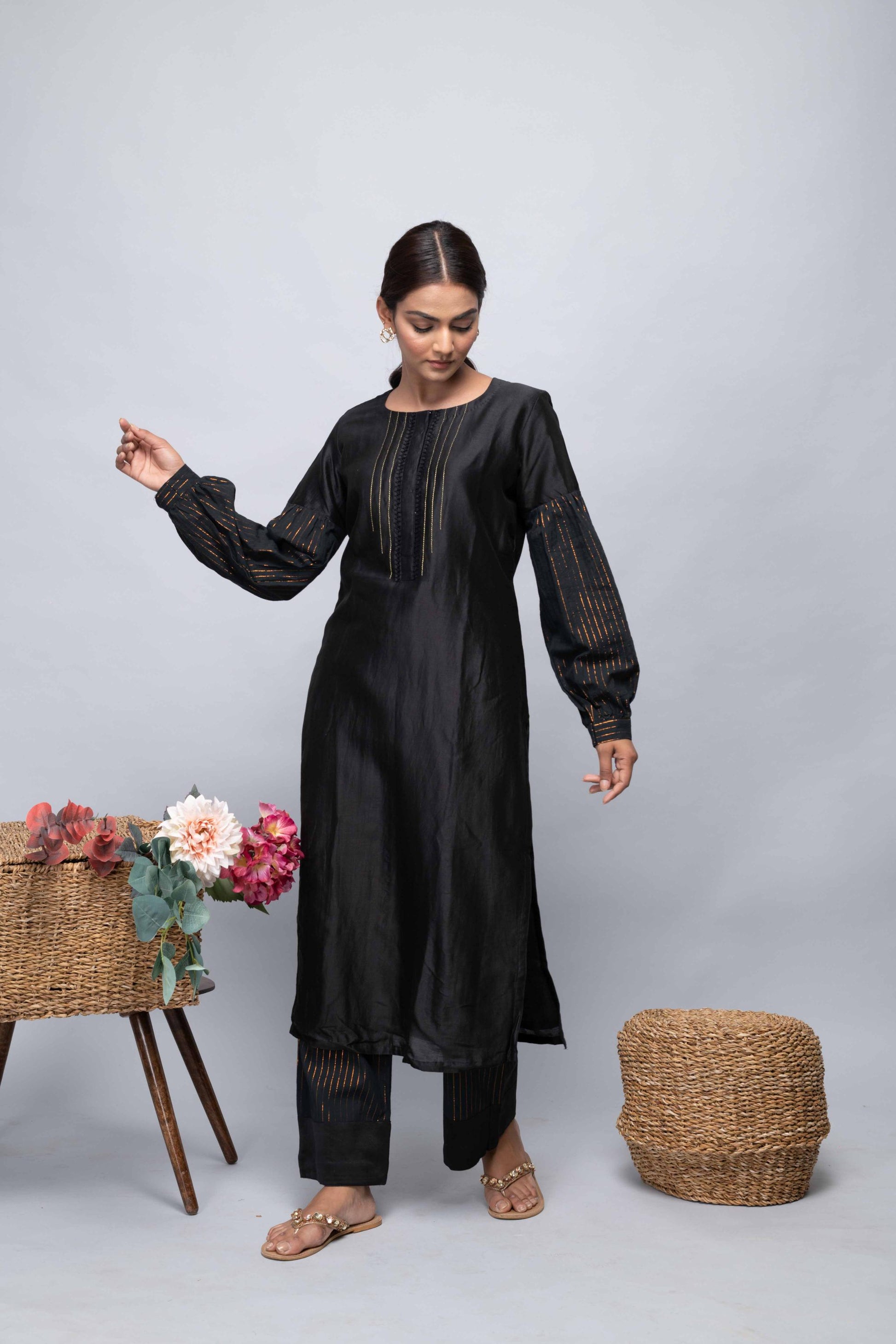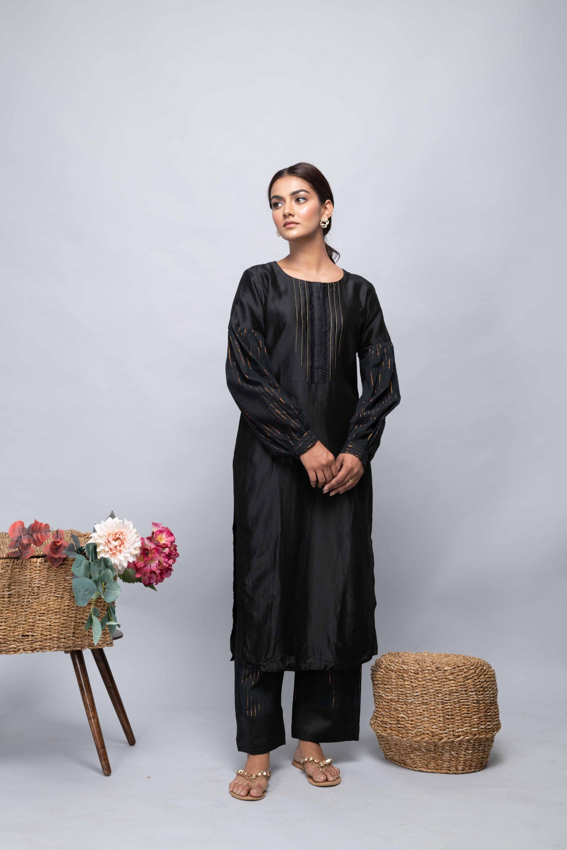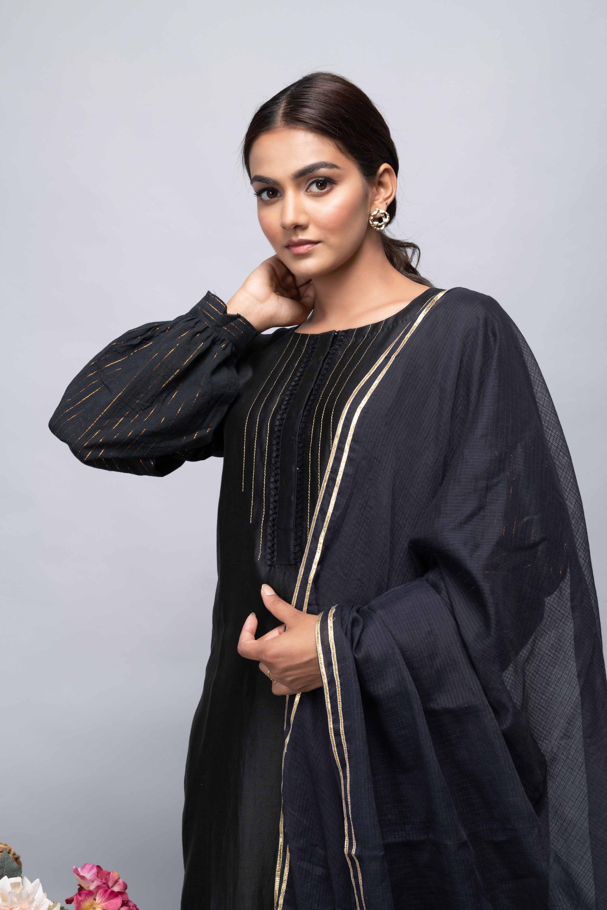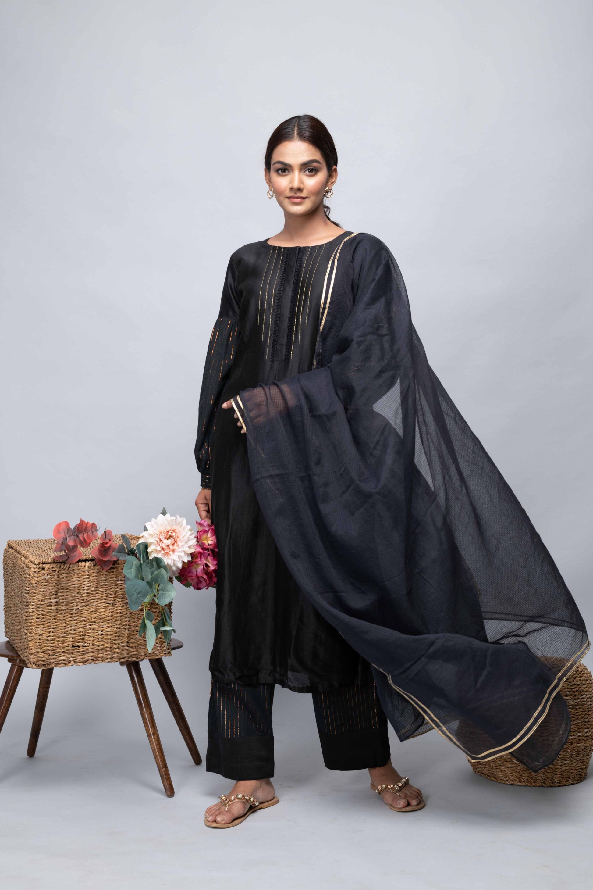 This black chanderi suit set features a kurta with lurex lines and handwork, paired with luxe cotton pants and a kota doria dupatta with gota on the borders. A bold and refined choice for any occasion.