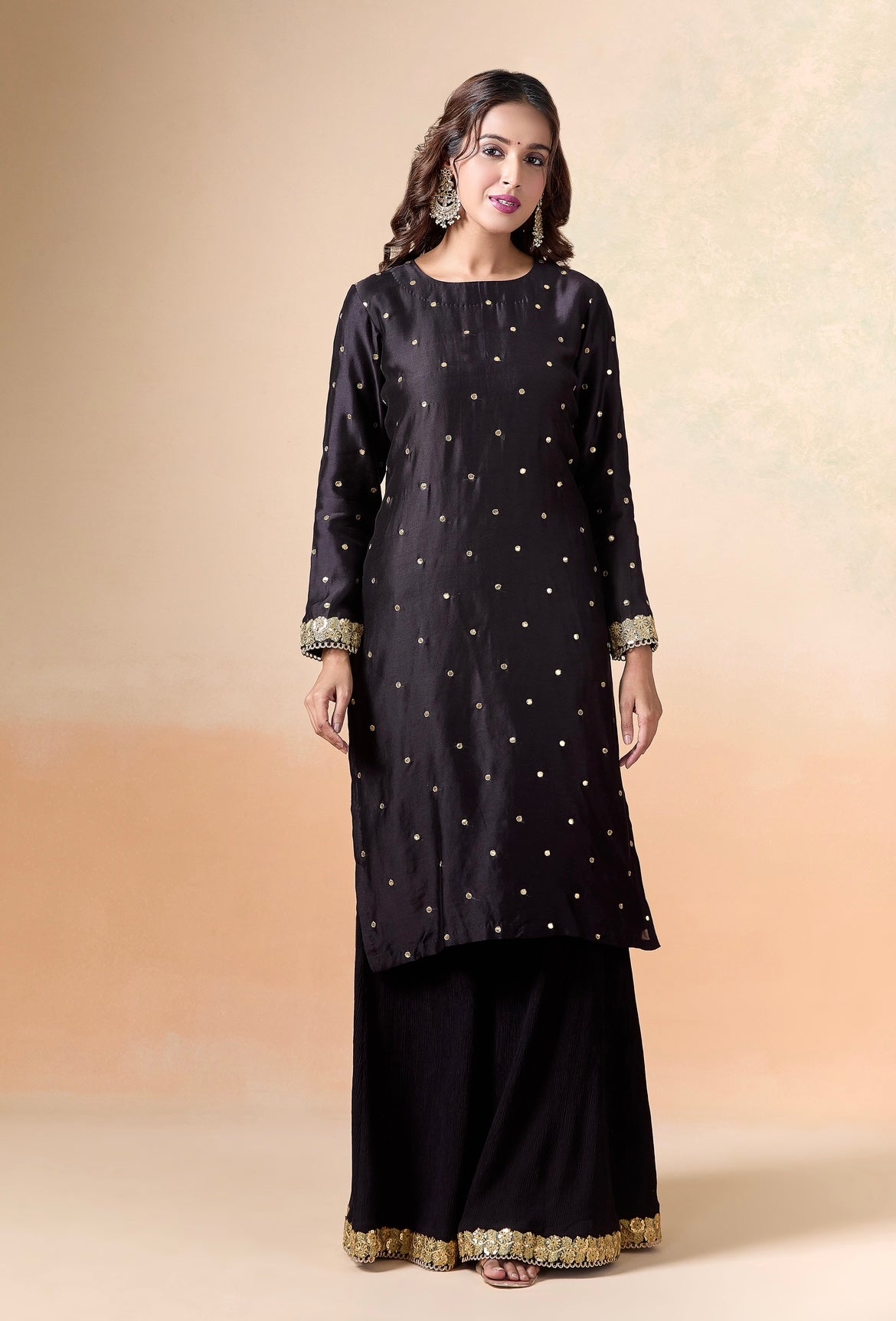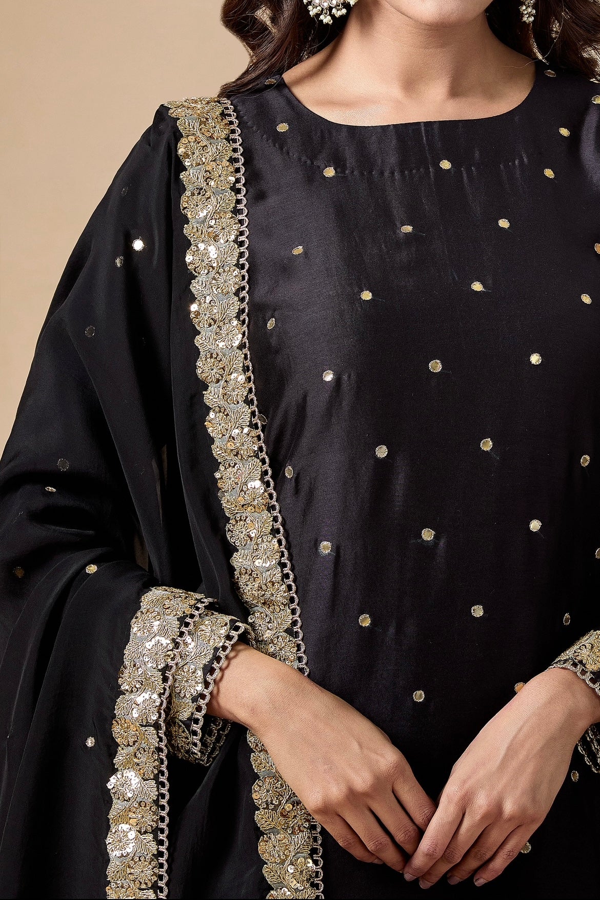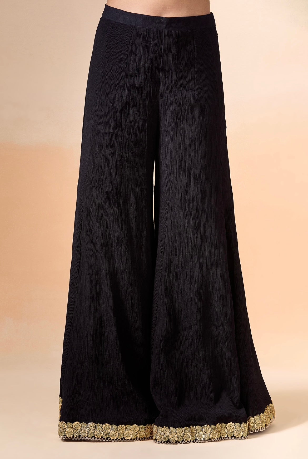 This black chanderi kurta features intricate hand embroidery, gota work, and is paired with crinkle crepe palazzo pants adorned with a golden border. The matching black organza dupatta is embellished with gota work and a golden border.