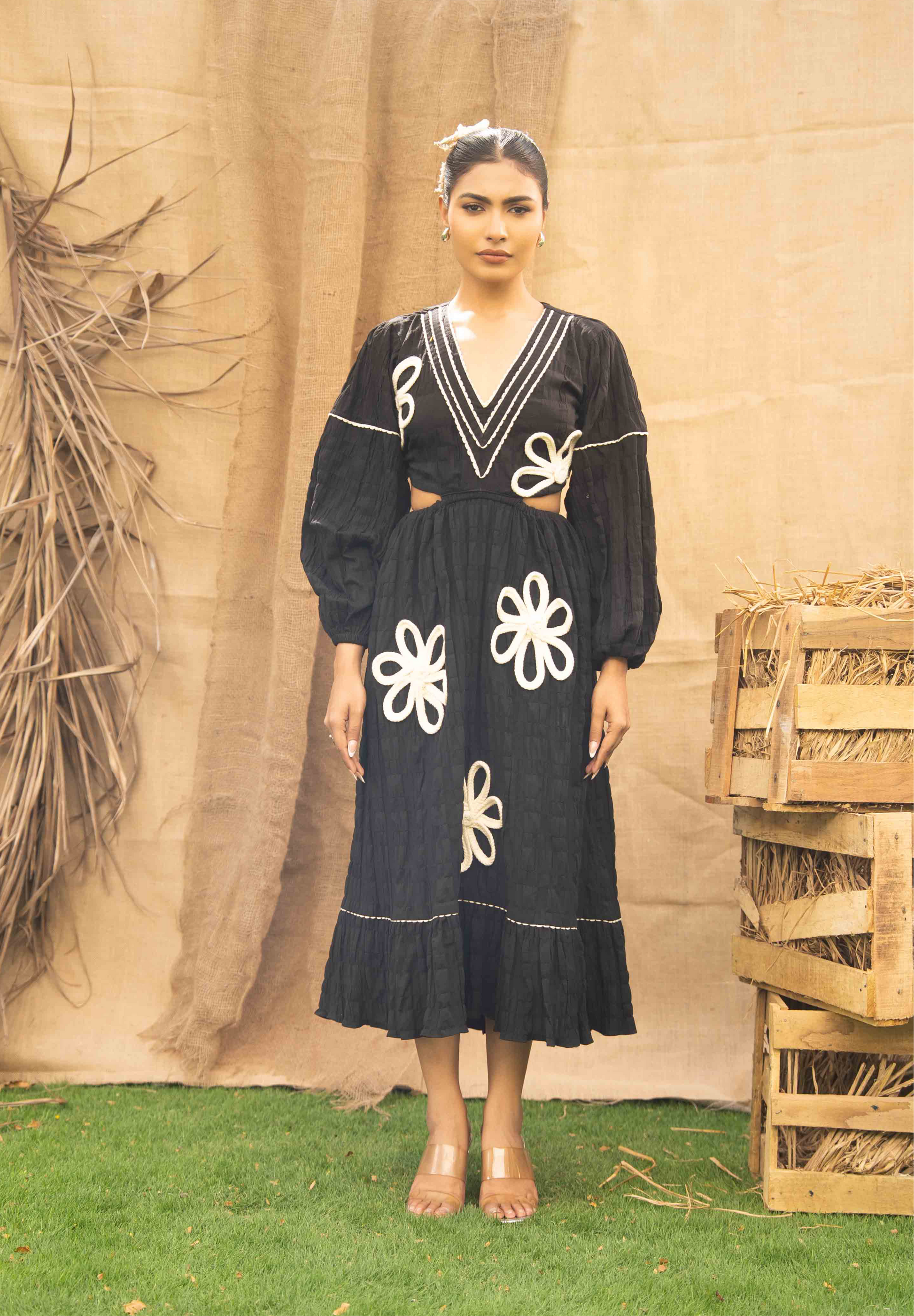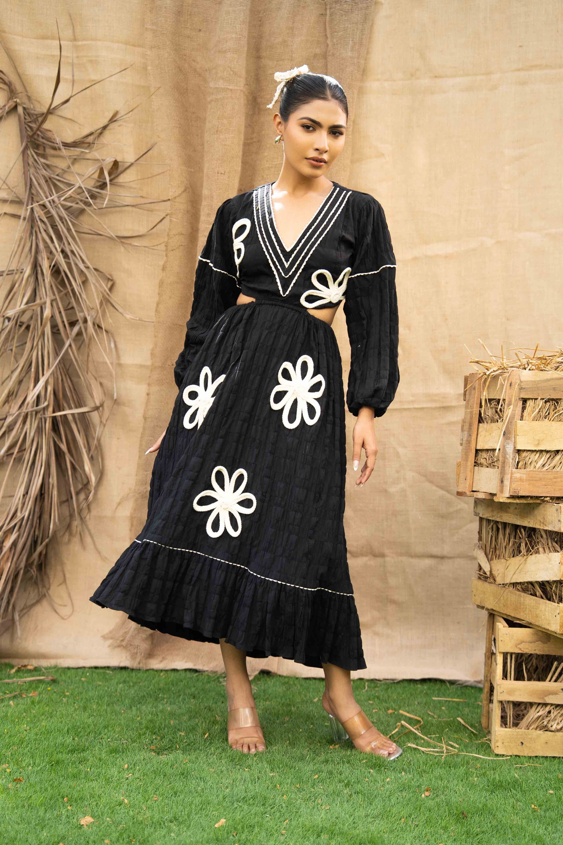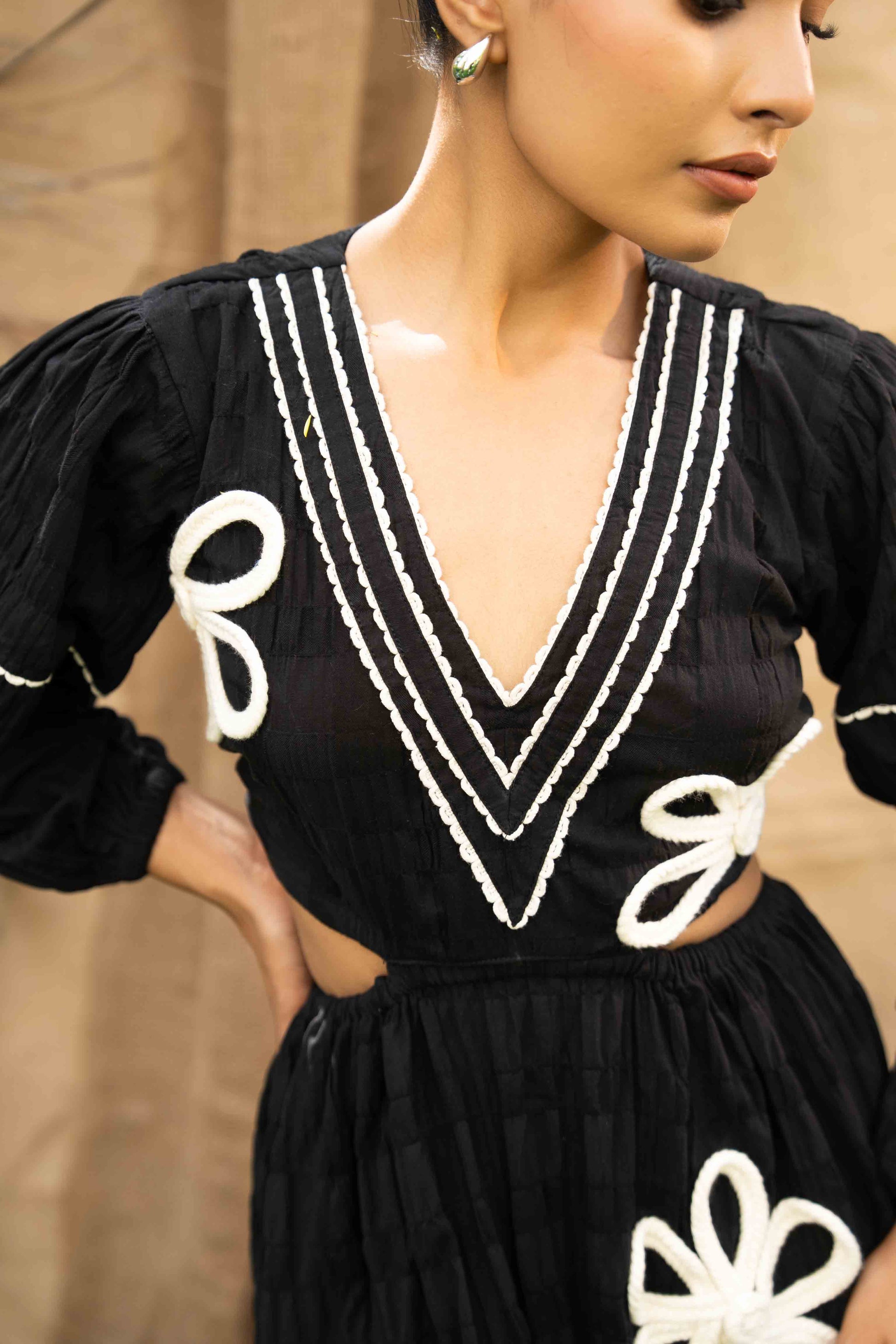 The CHARLENE Dress is a captivating black midi featuring braided details and elegant hand-embroidered floral cutouts. Its scalloped edges and flowing silhouette make it ideal for both sophisticated daywear and chic evening outings. The subtle cutouts add a contemporary edge to this artisanal piece.