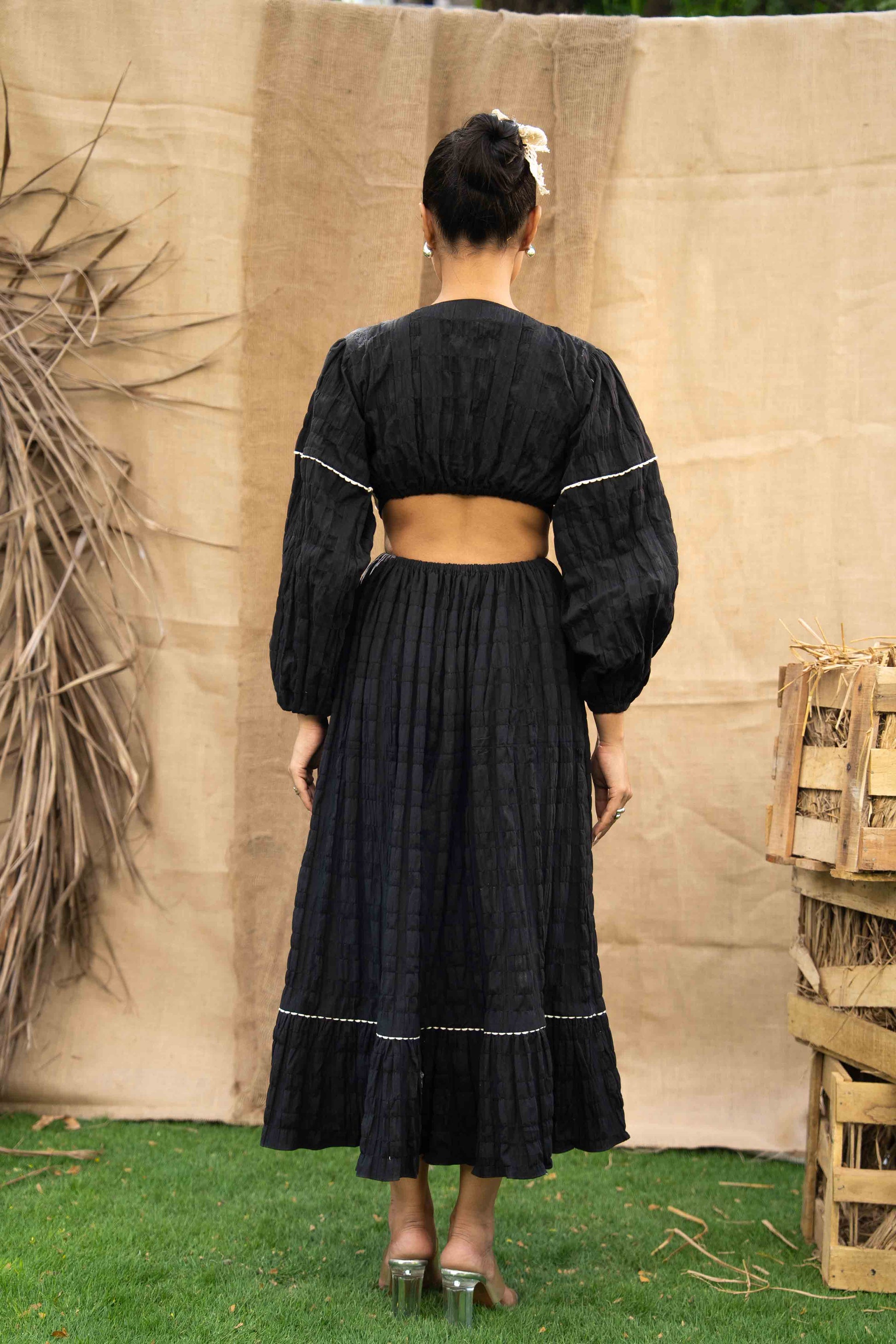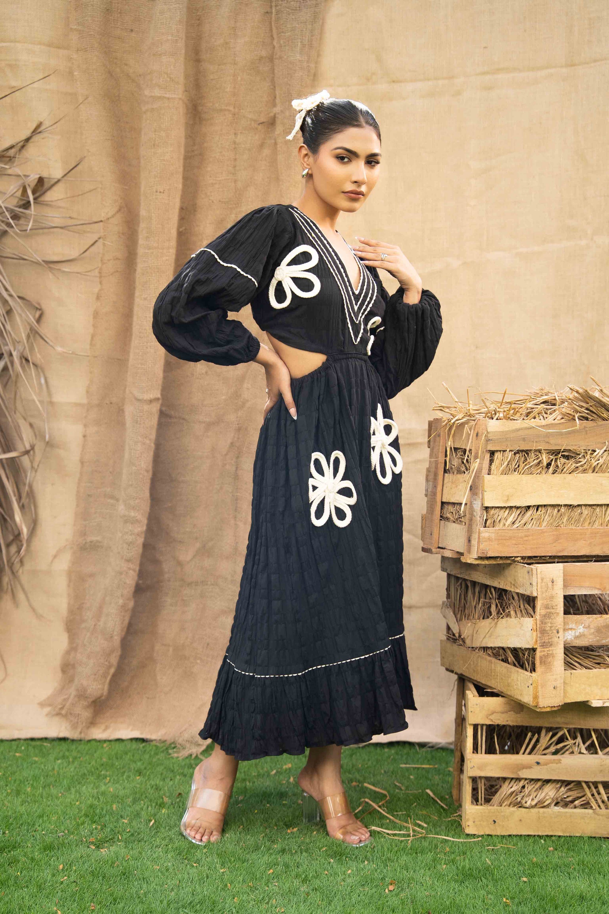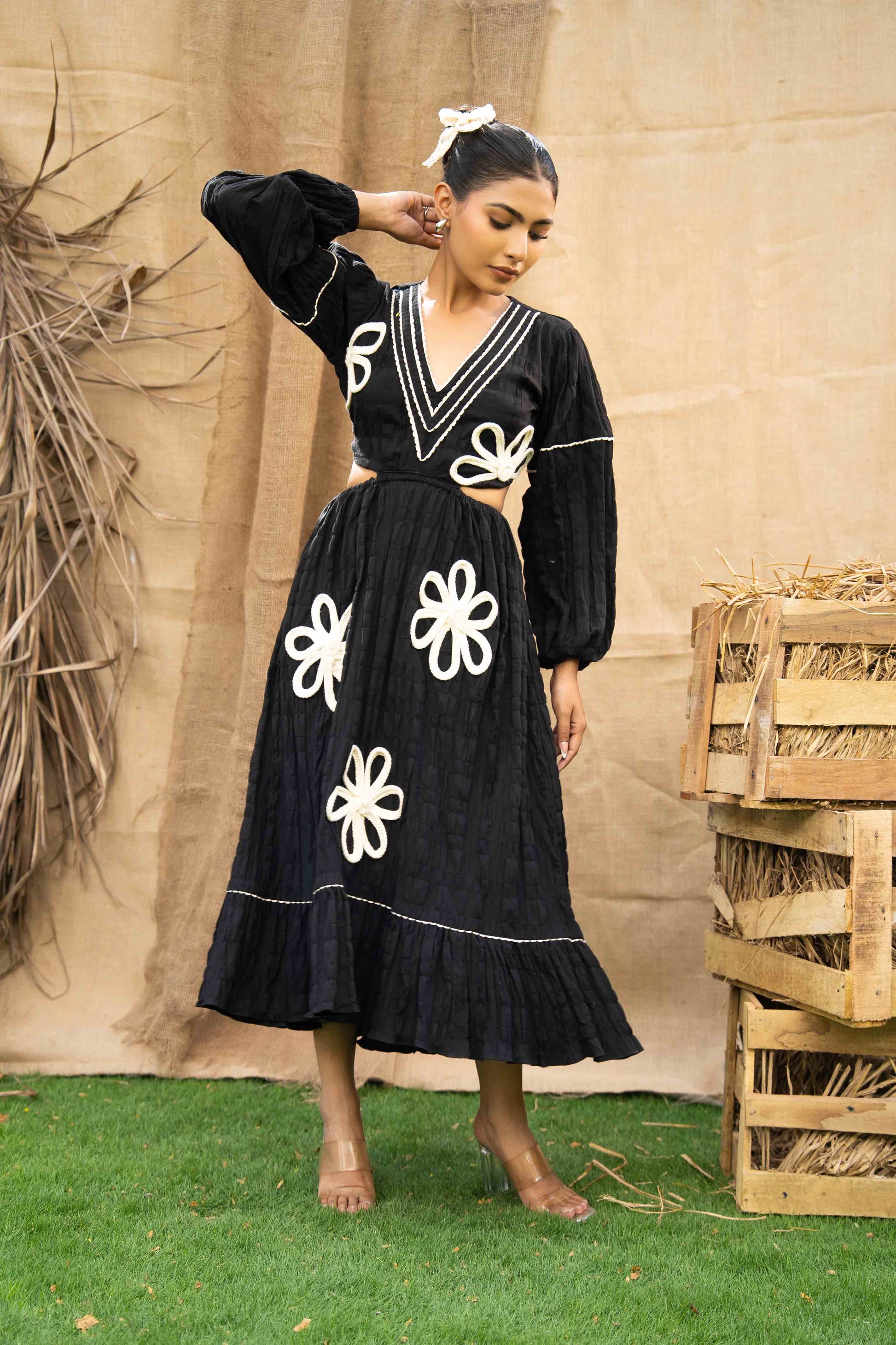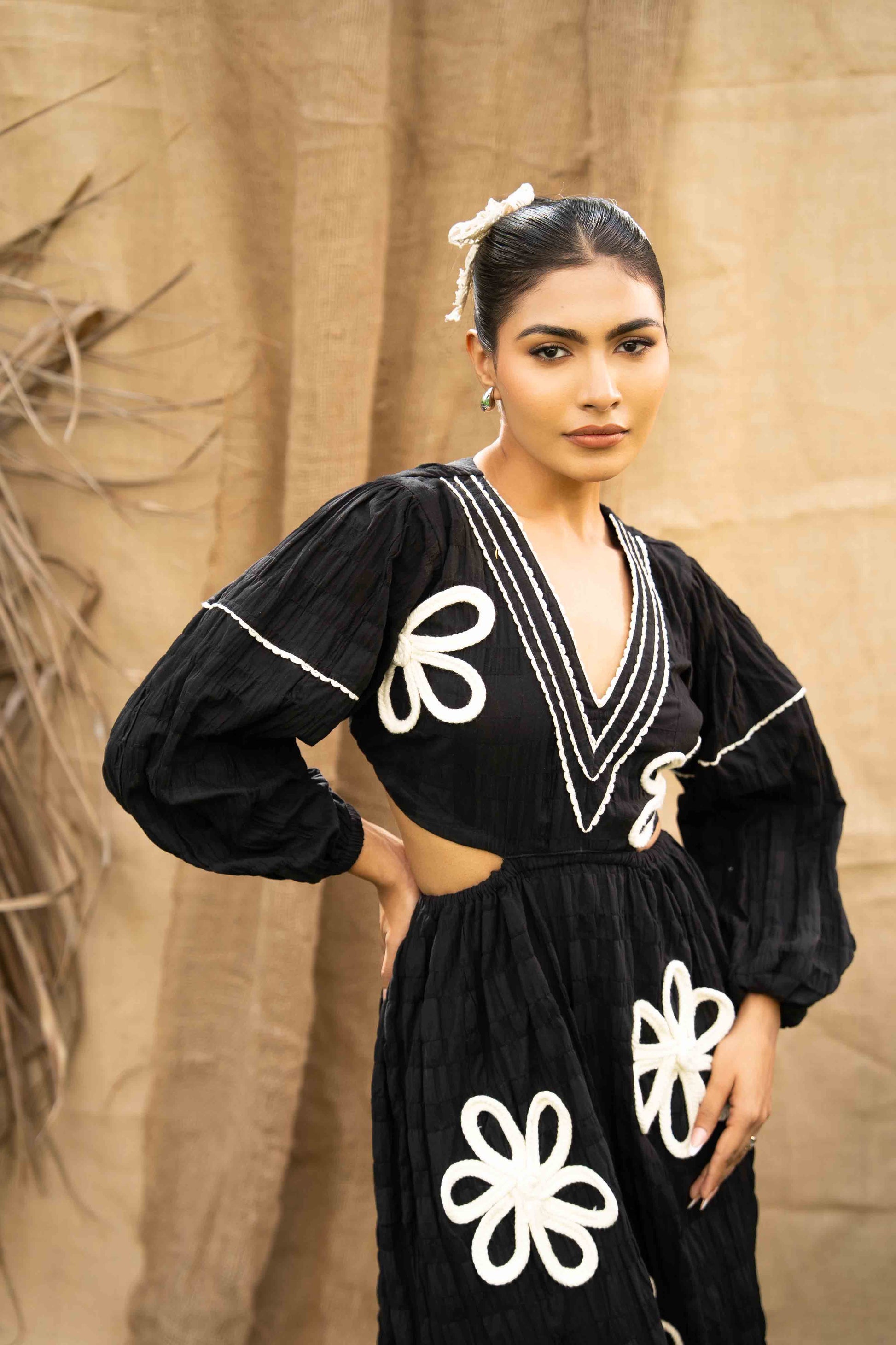 The CHARLENE Dress is a captivating black midi featuring braided details and elegant hand-embroidered floral cutouts. Its scalloped edges and flowing silhouette make it ideal for both sophisticated daywear and chic evening outings. The subtle cutouts add a contemporary edge to this artisanal piece.