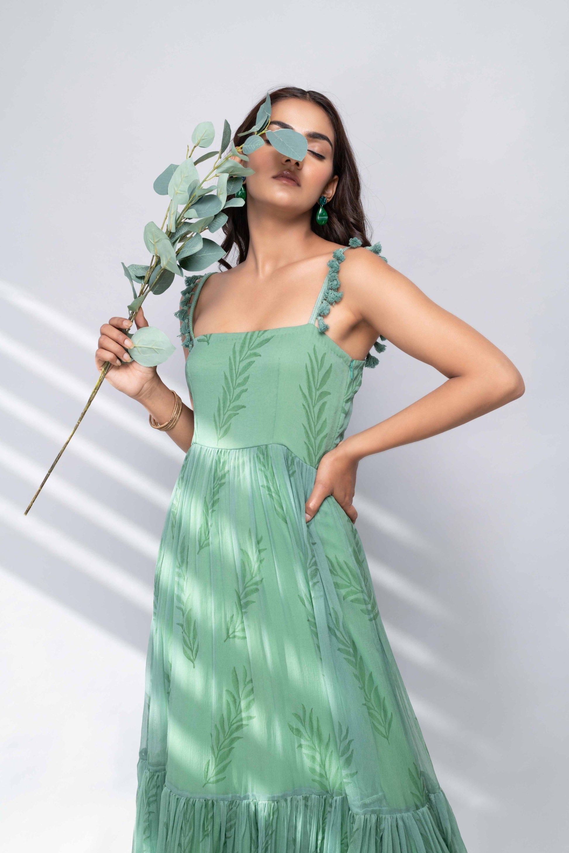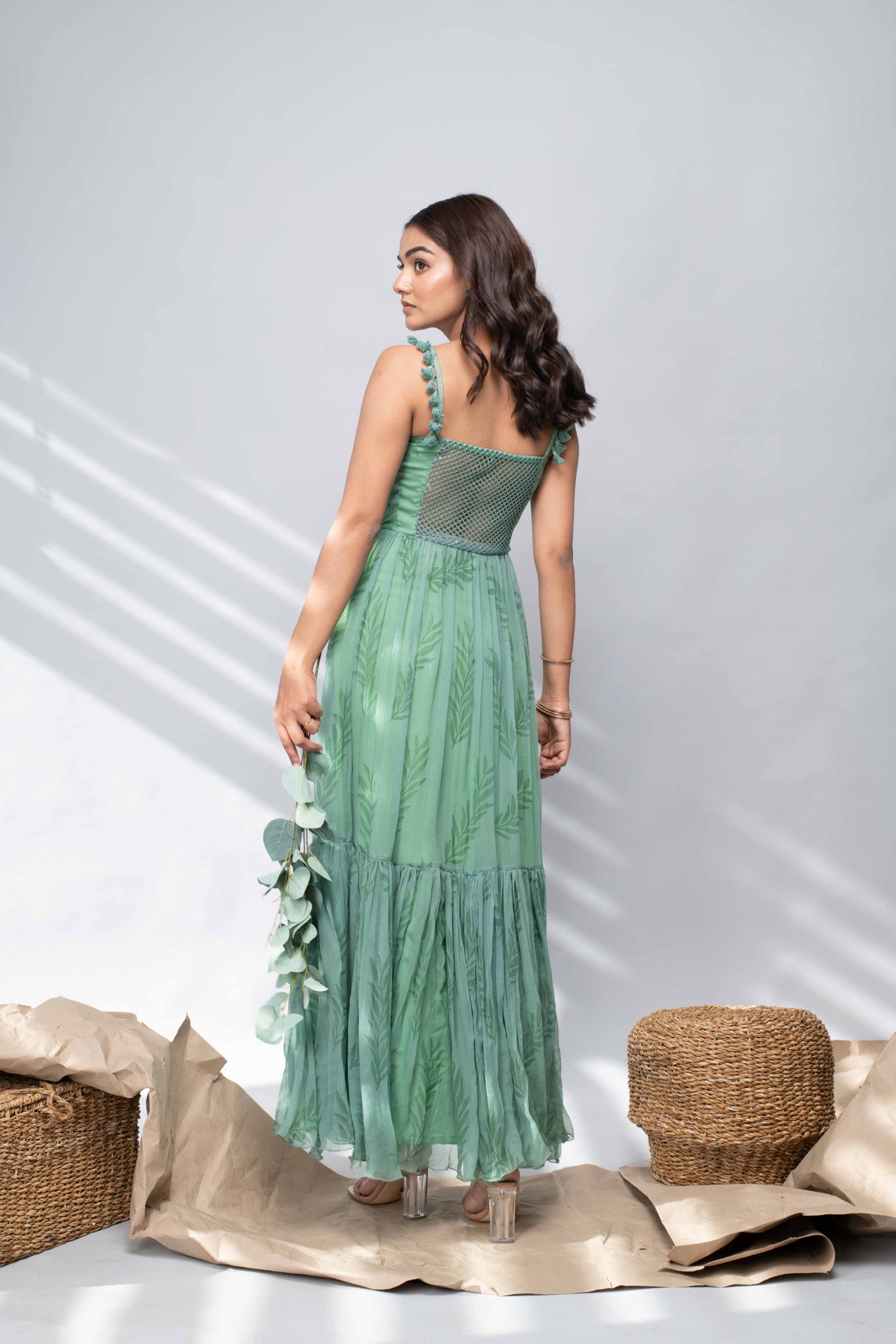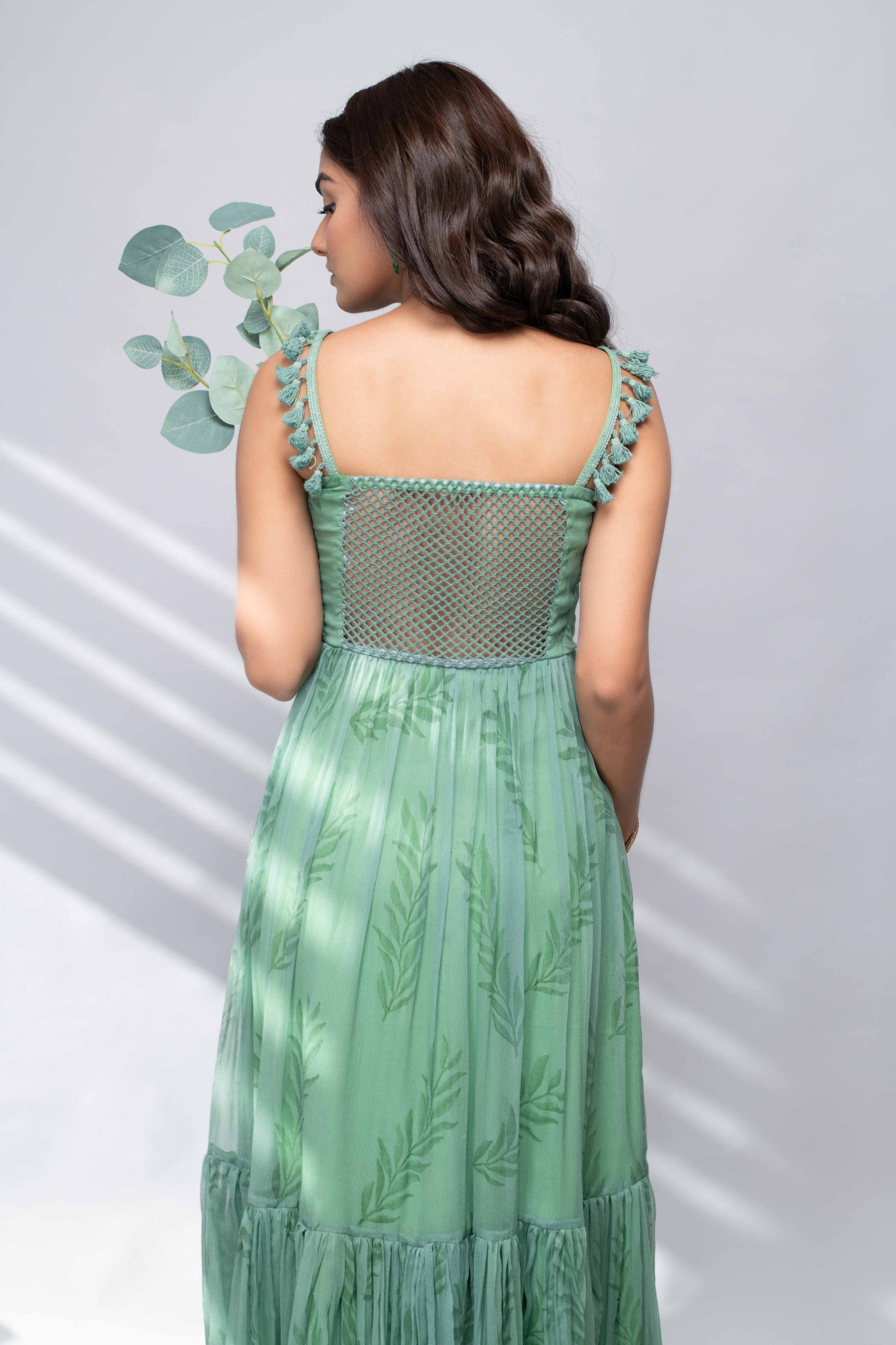 This green leaf print chiffon maxi dress with tassels and fishnet detailing at the back offers an elegant and breezy silhouette. Perfect for a semi-formal summer event or a garden party.