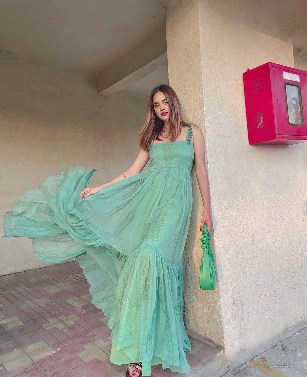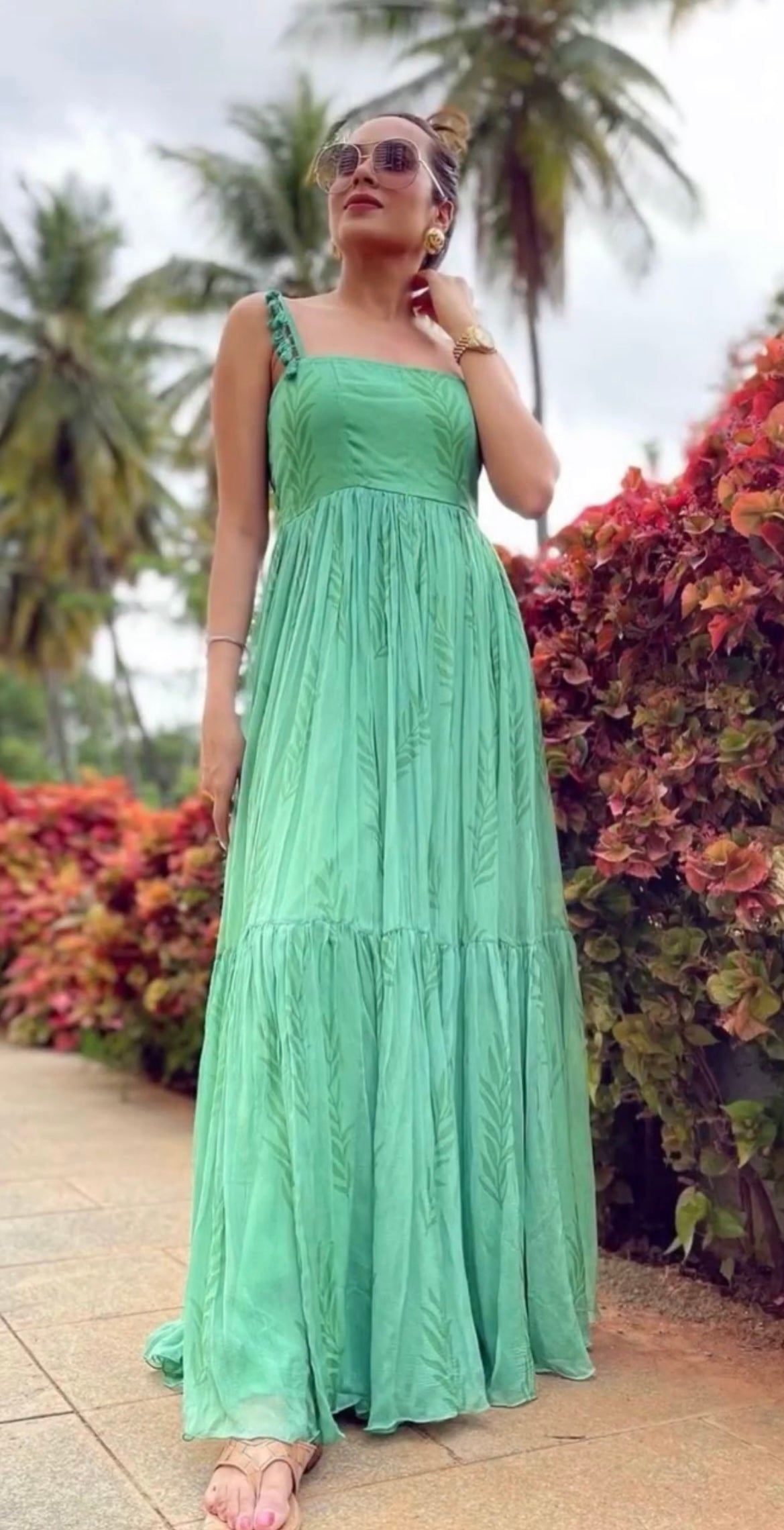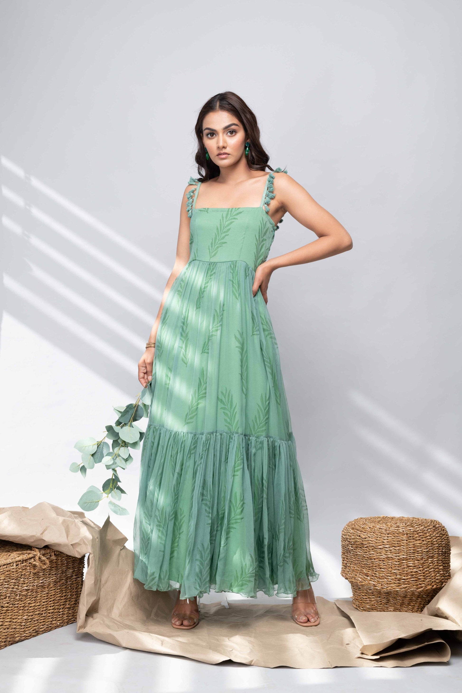 This green leaf print chiffon maxi dress with tassels and fishnet detailing at the back offers an elegant and breezy silhouette. Perfect for a semi-formal summer event or a garden party.