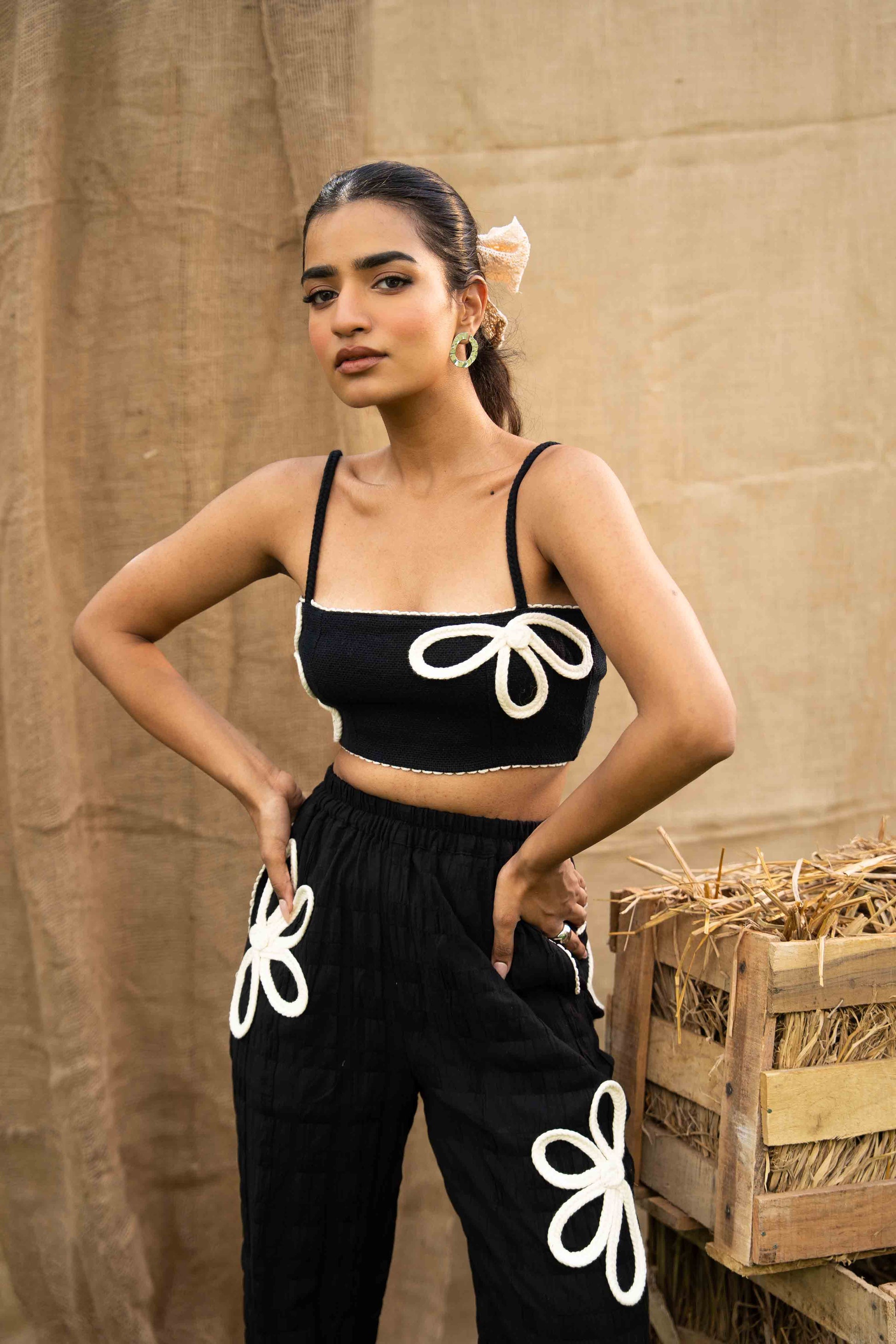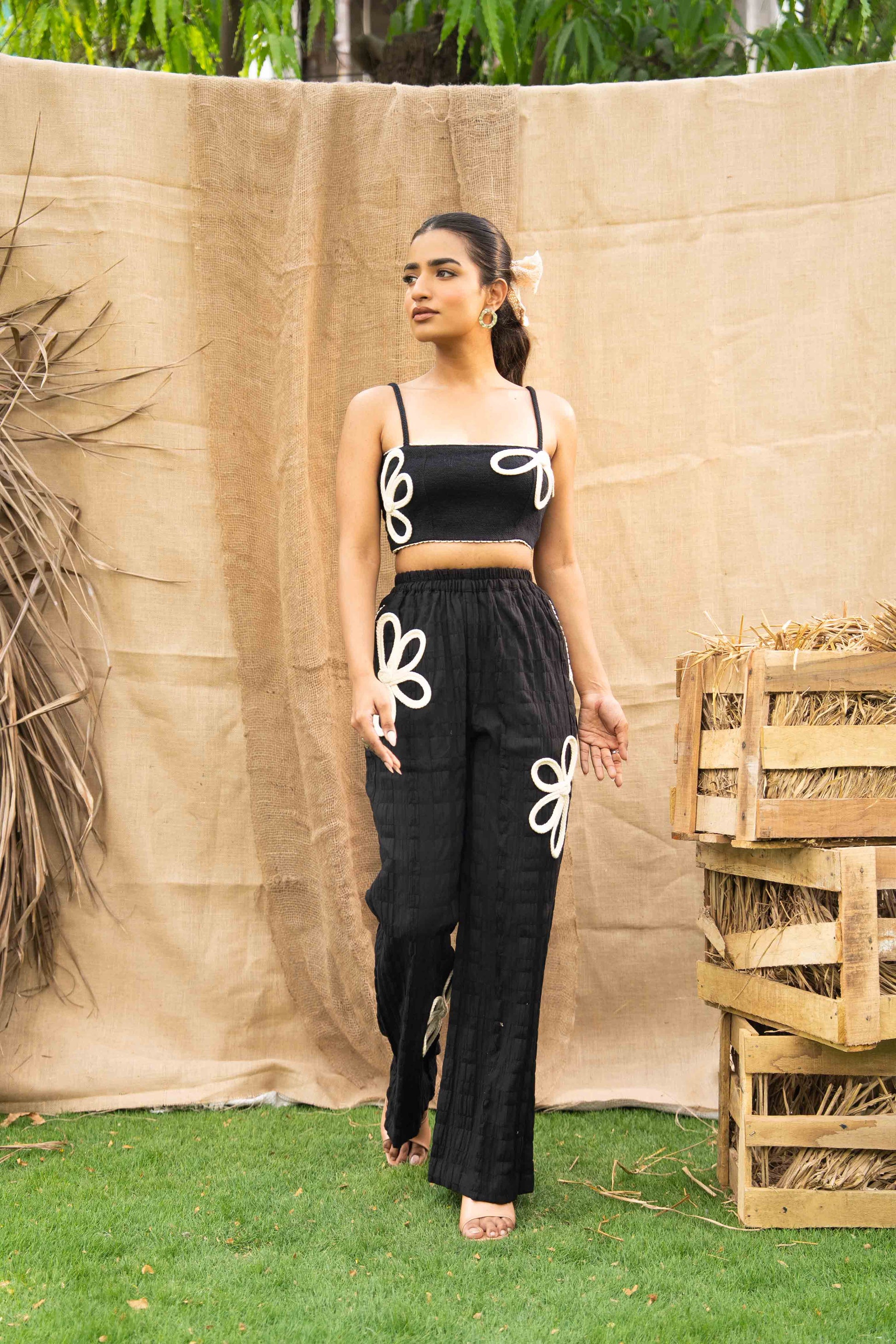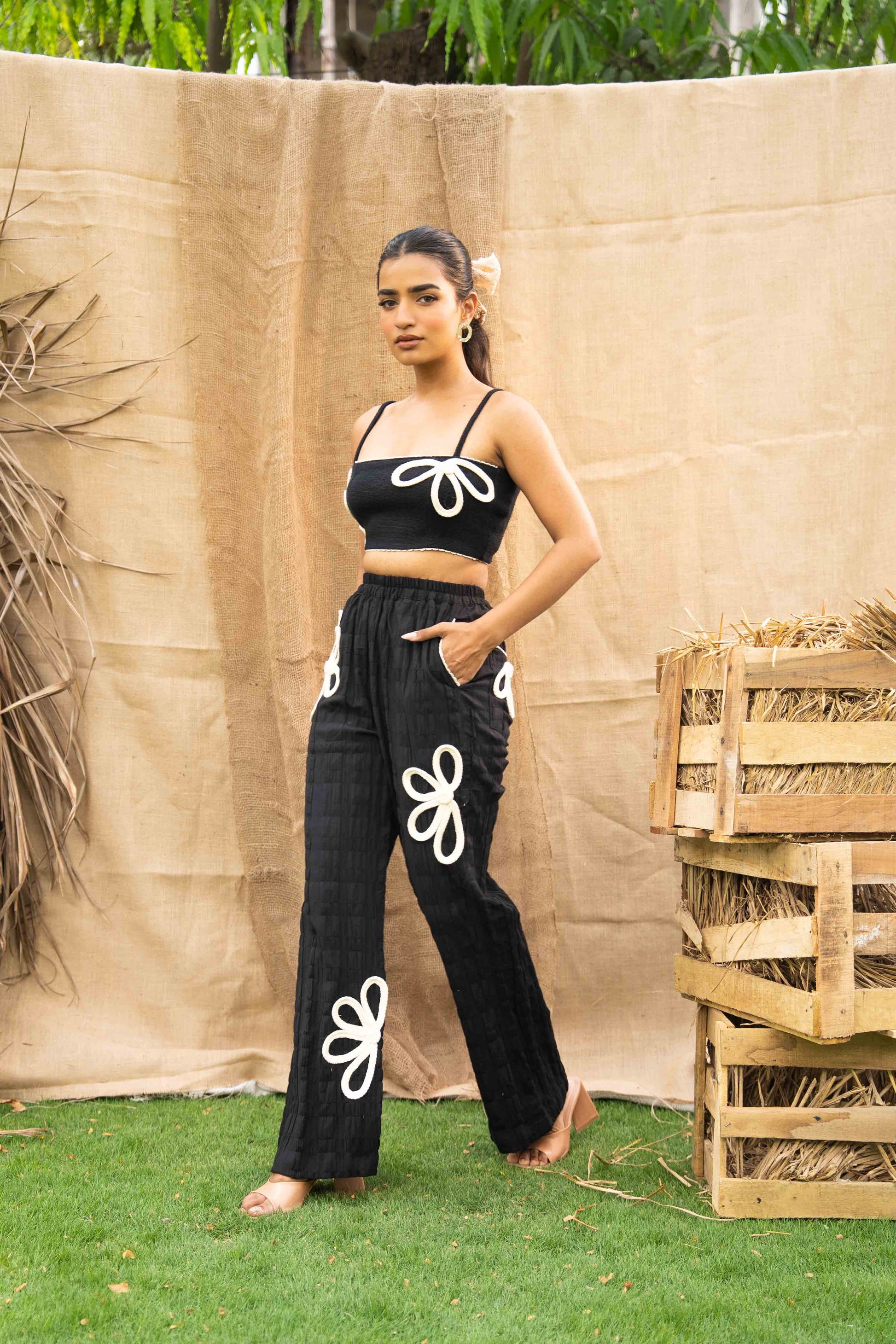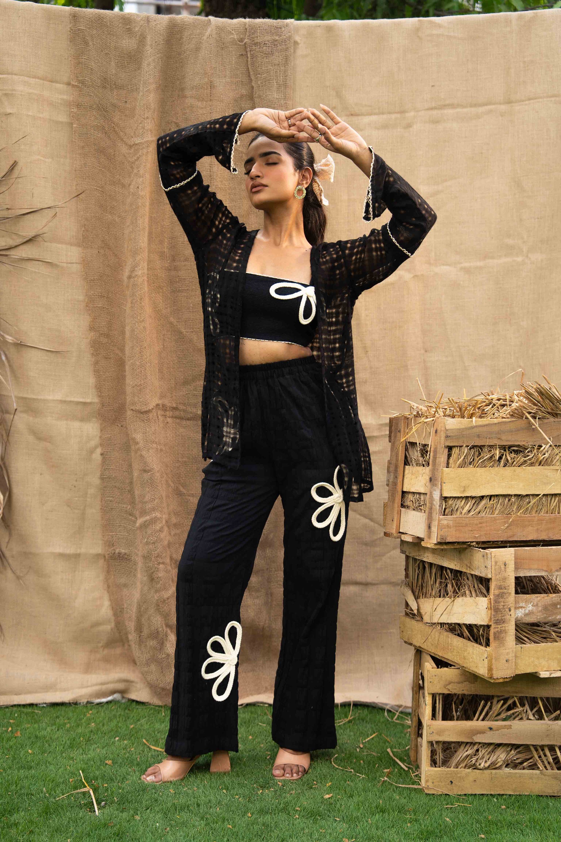 The GISELE Coord Set combines lightweight cotton with intricate hand-embroidered floral cutouts and braided detailing. Featuring a breathable crop top, relaxed pants, and a sheer shrug, this black checked set offers versatile style for both daywear and evening occasions. The scalloped edges add a subtle touch of refinement to the artisanal design.