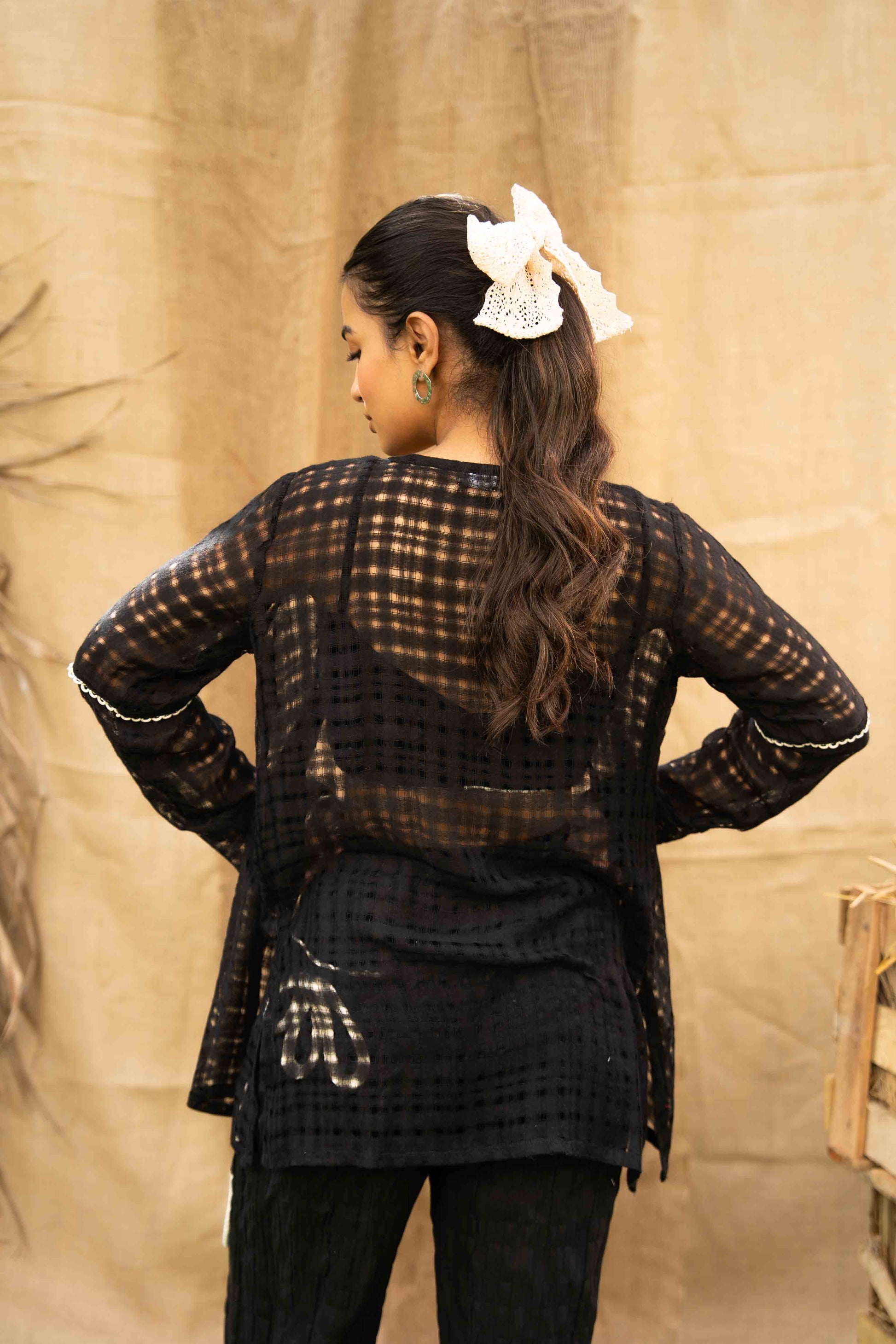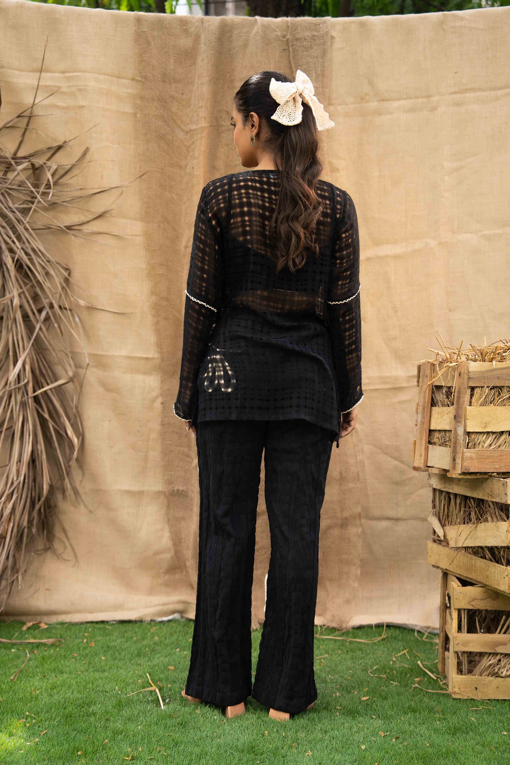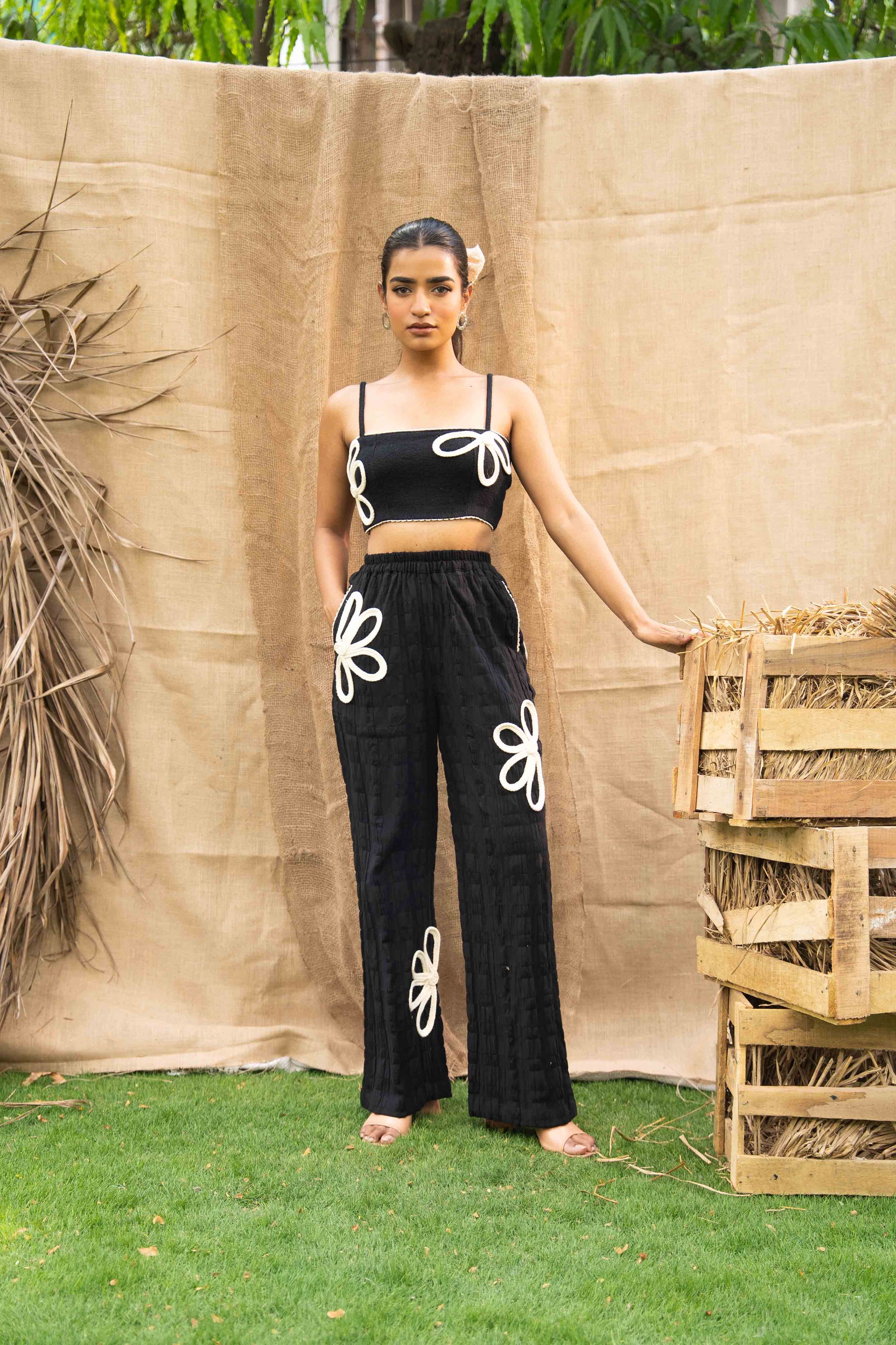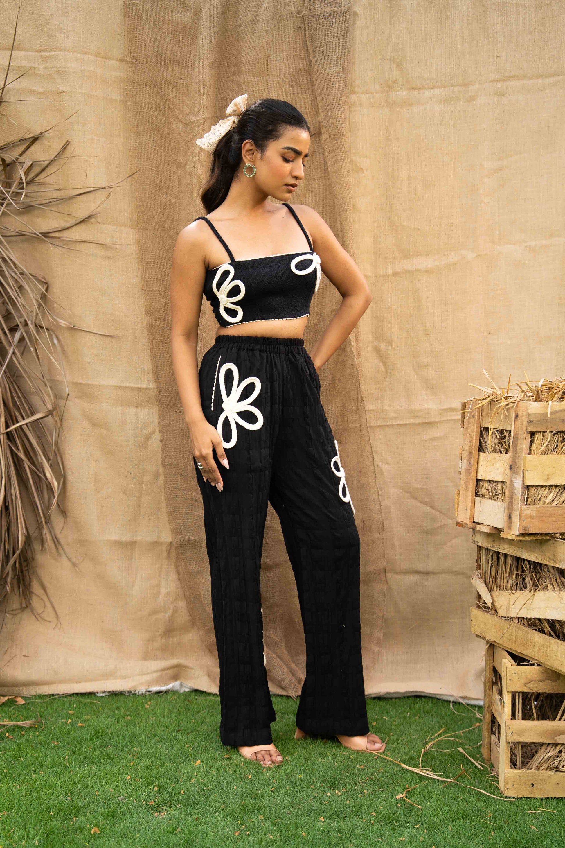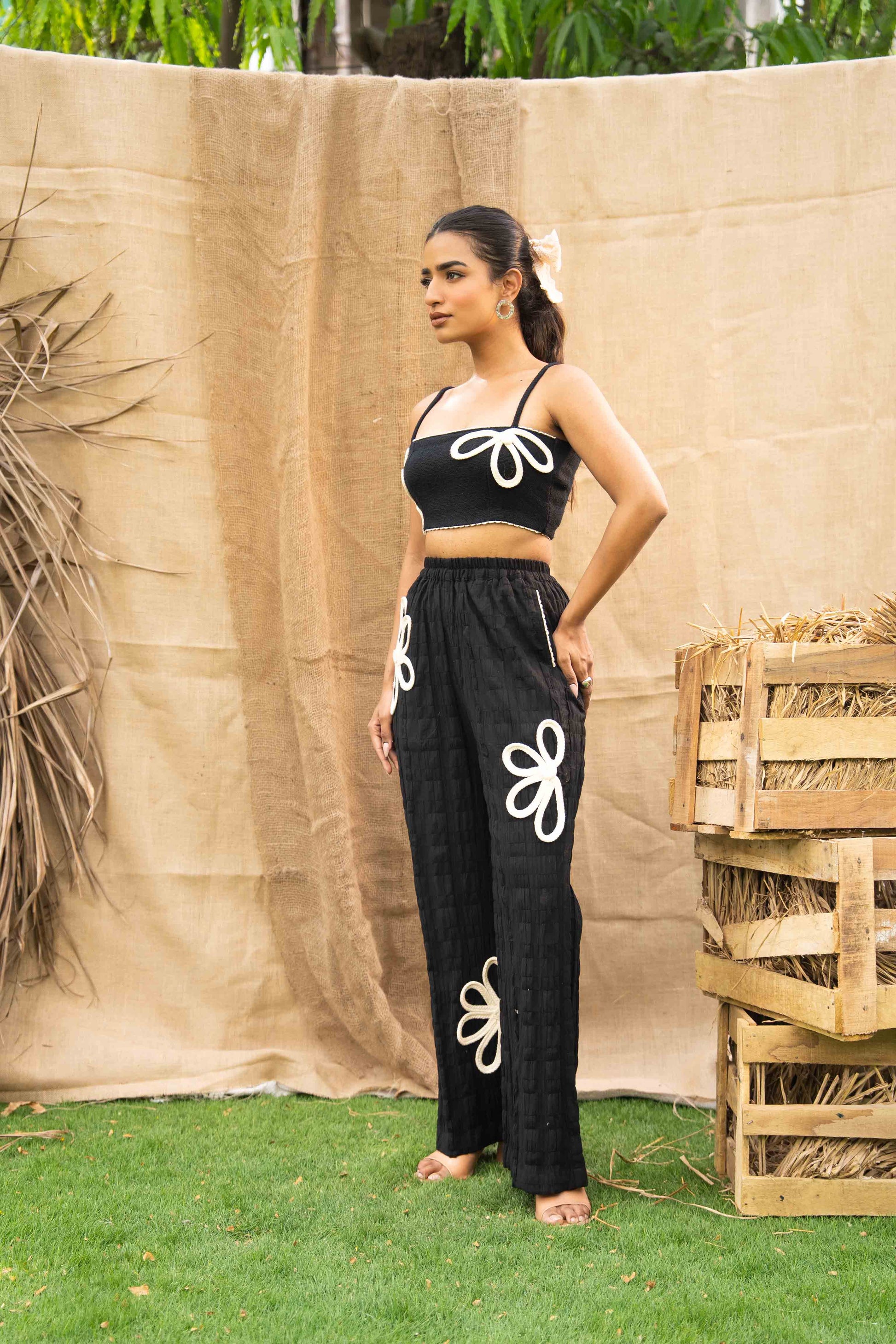 The GISELE Coord Set combines lightweight cotton with intricate hand-embroidered floral cutouts and braided detailing. Featuring a breathable crop top, relaxed pants, and a sheer shrug, this black checked set offers versatile style for both daywear and evening occasions. The scalloped edges add a subtle touch of refinement to the artisanal design.