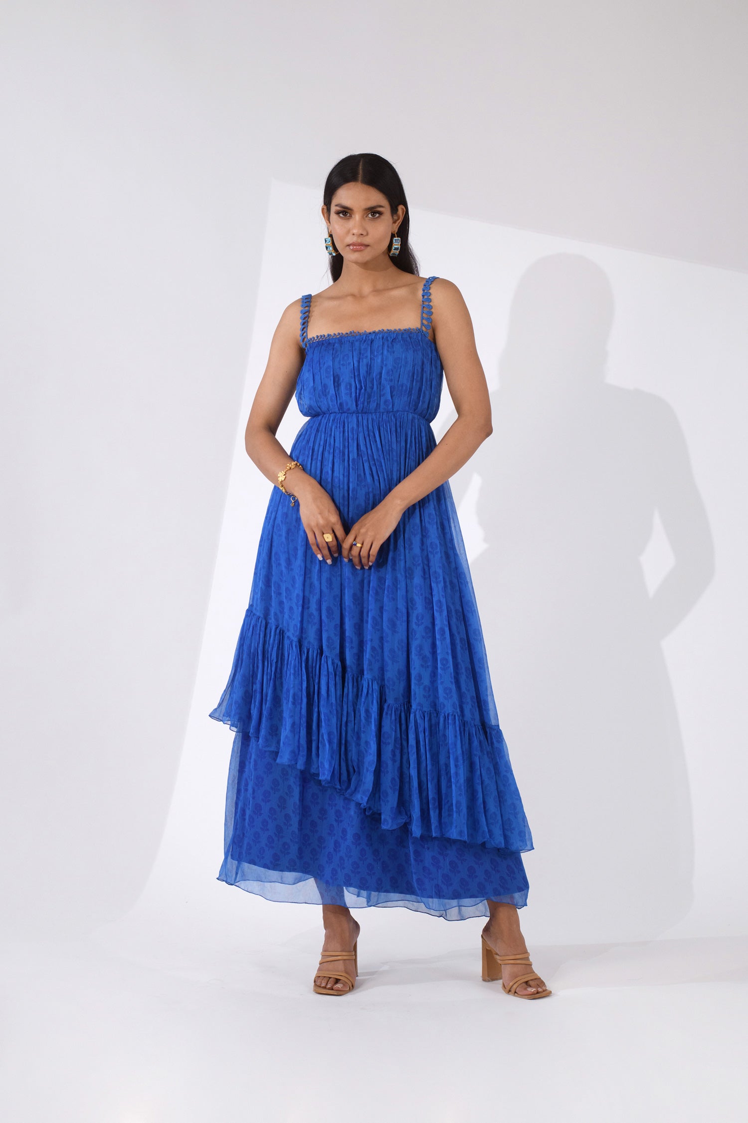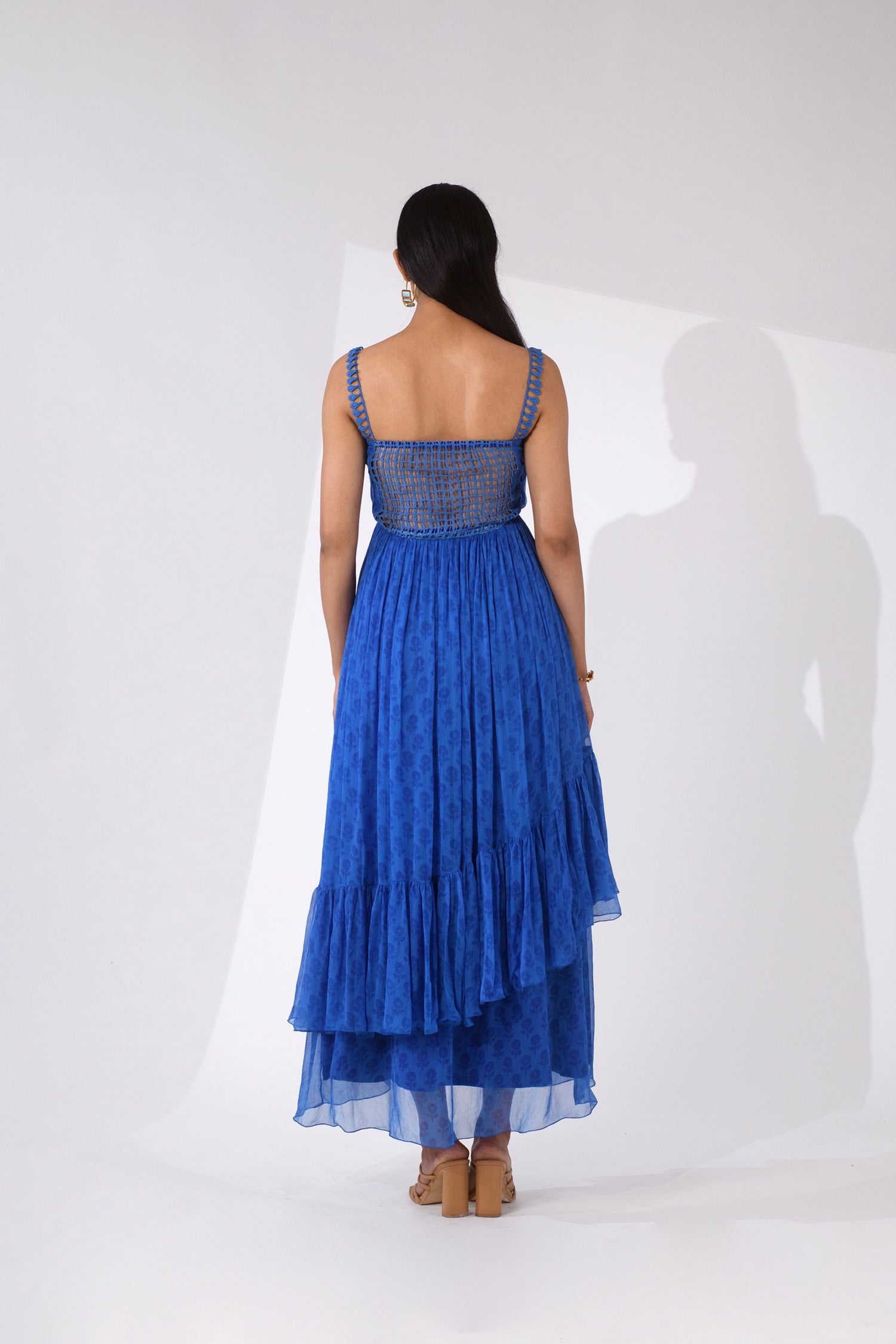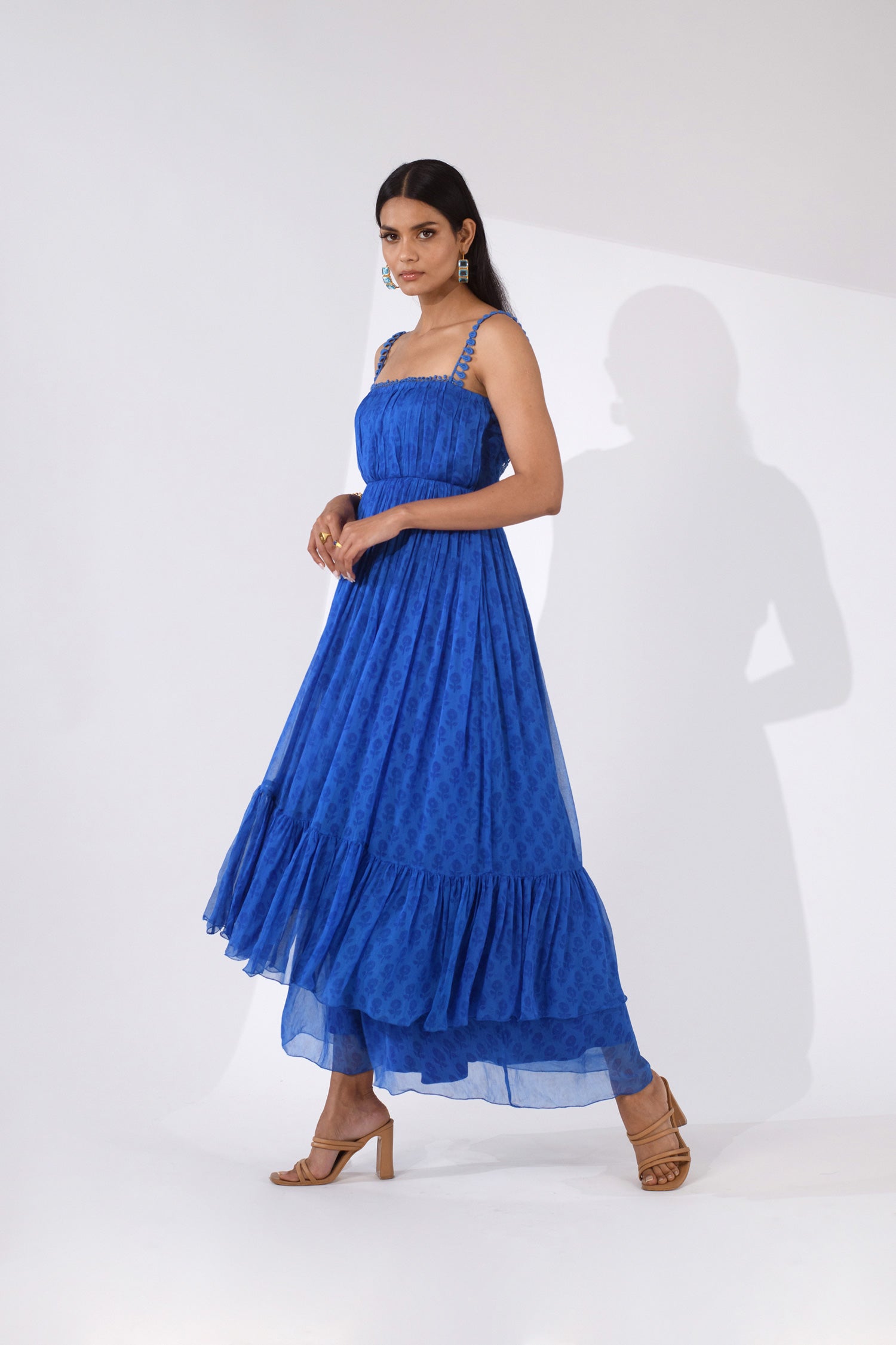 This blue printed chiffon maxi dress features lace detailing at the front and back. The soft frills and layers give it a graceful, feminine appeal, perfect for garden parties or semi-formal events.
