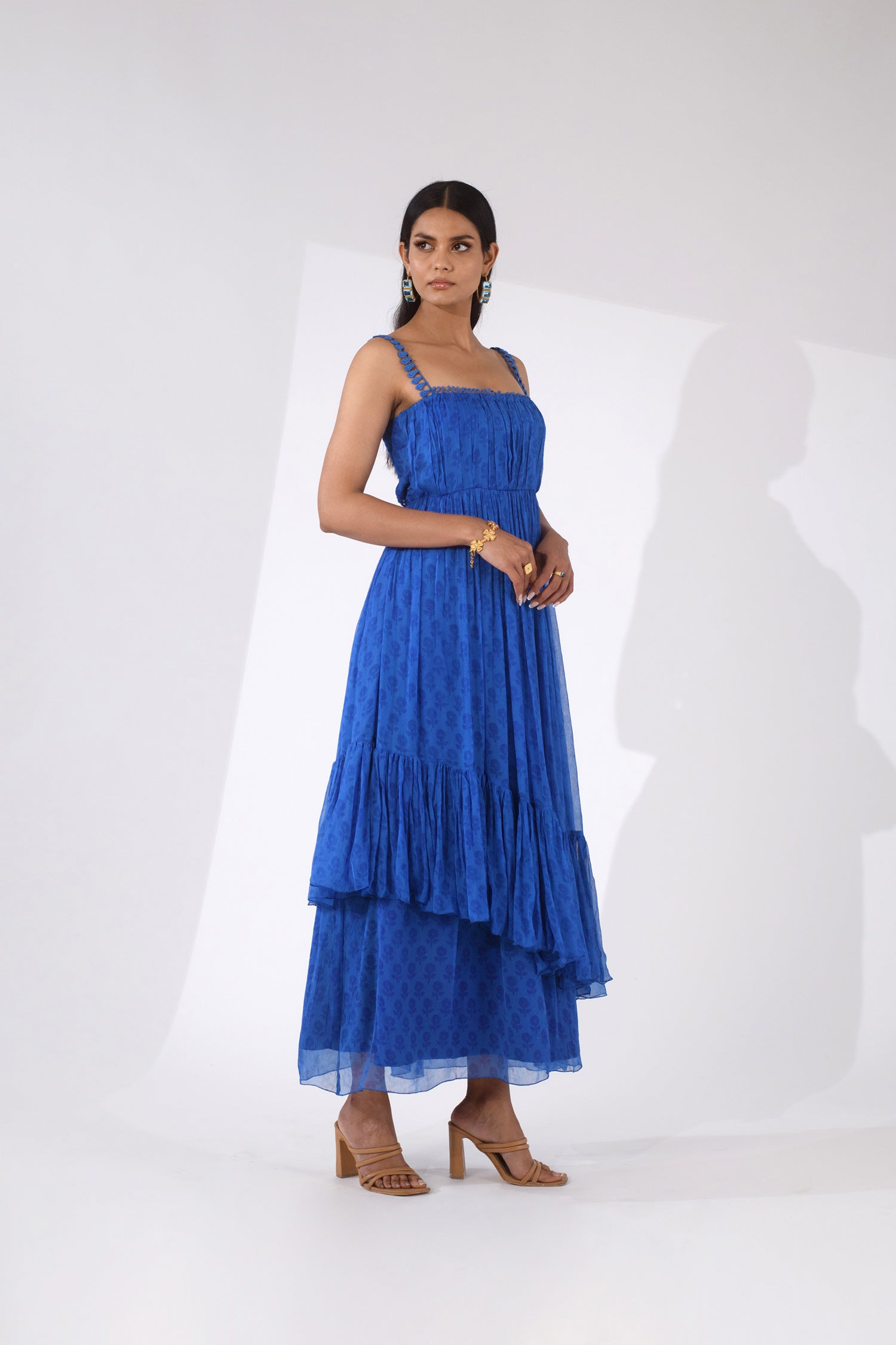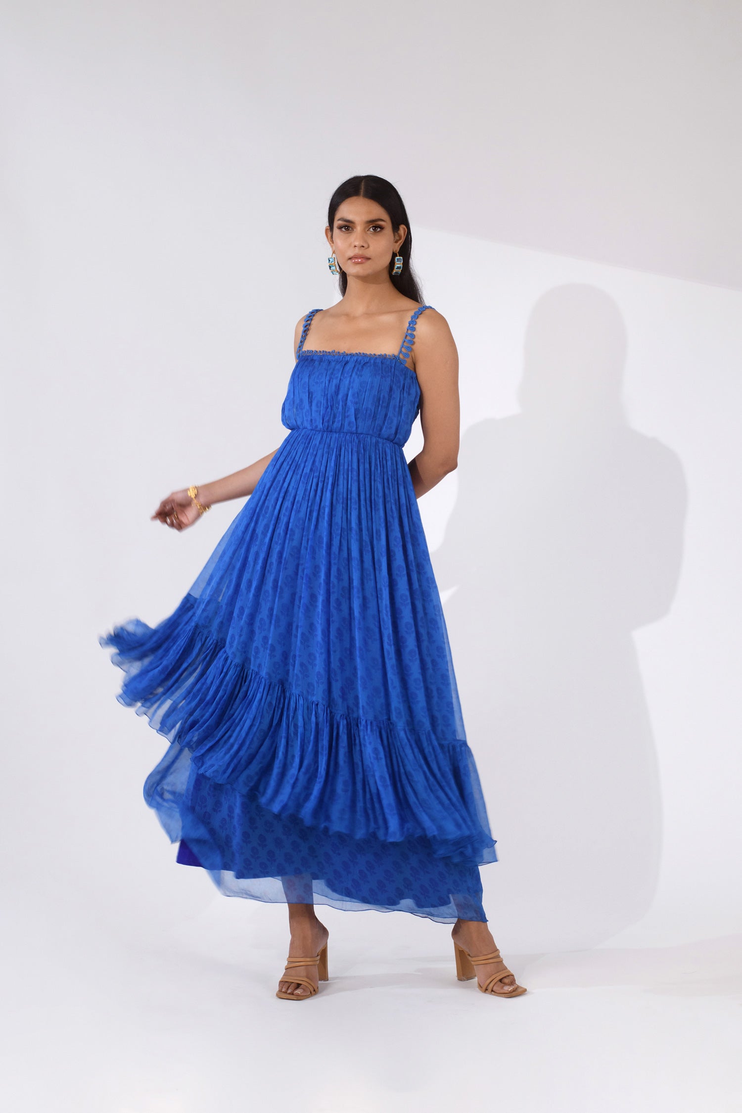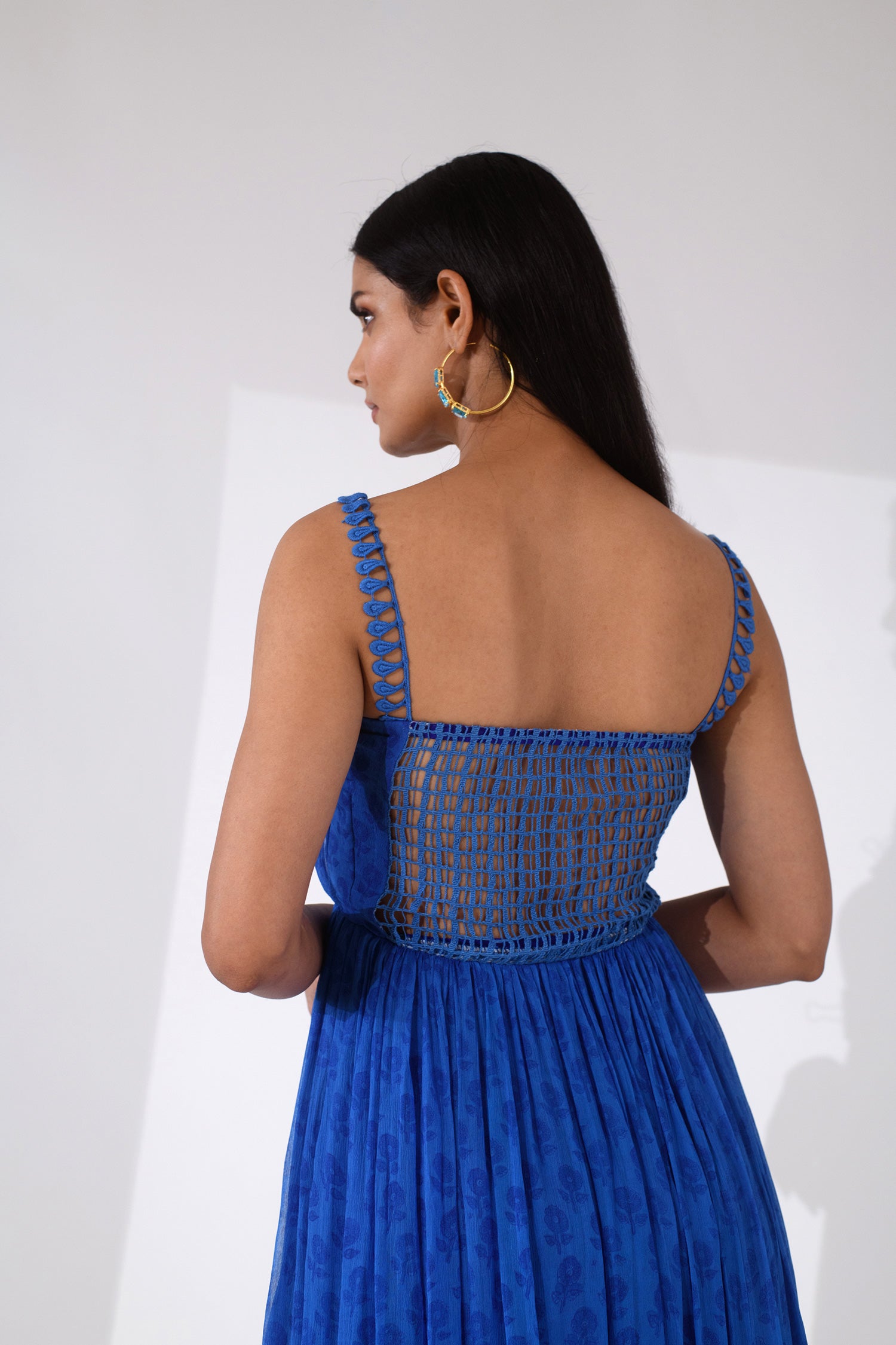 This blue printed chiffon maxi dress features lace detailing at the front and back. The soft frills and layers give it a graceful, feminine appeal, perfect for garden parties or semi-formal events.