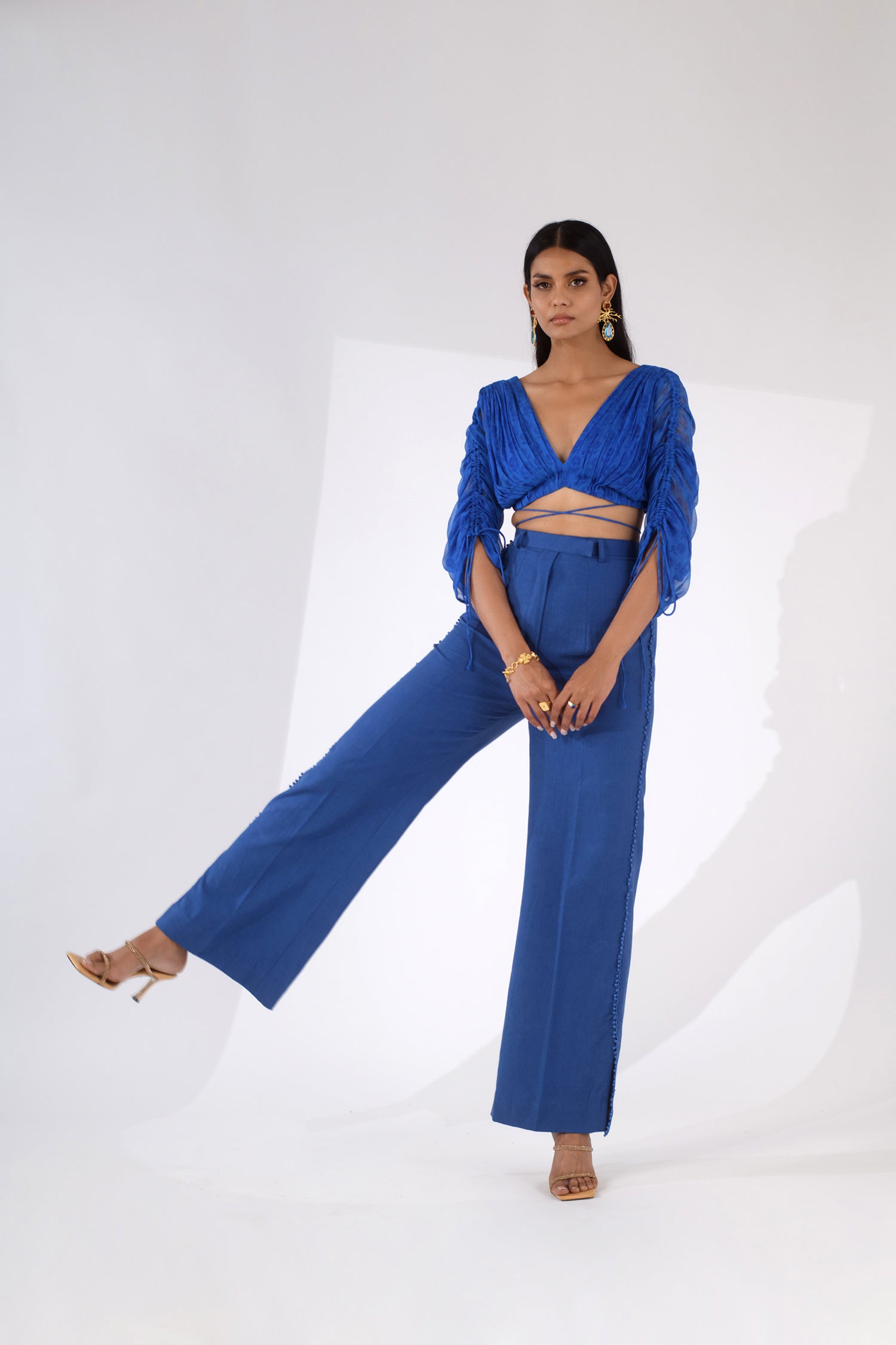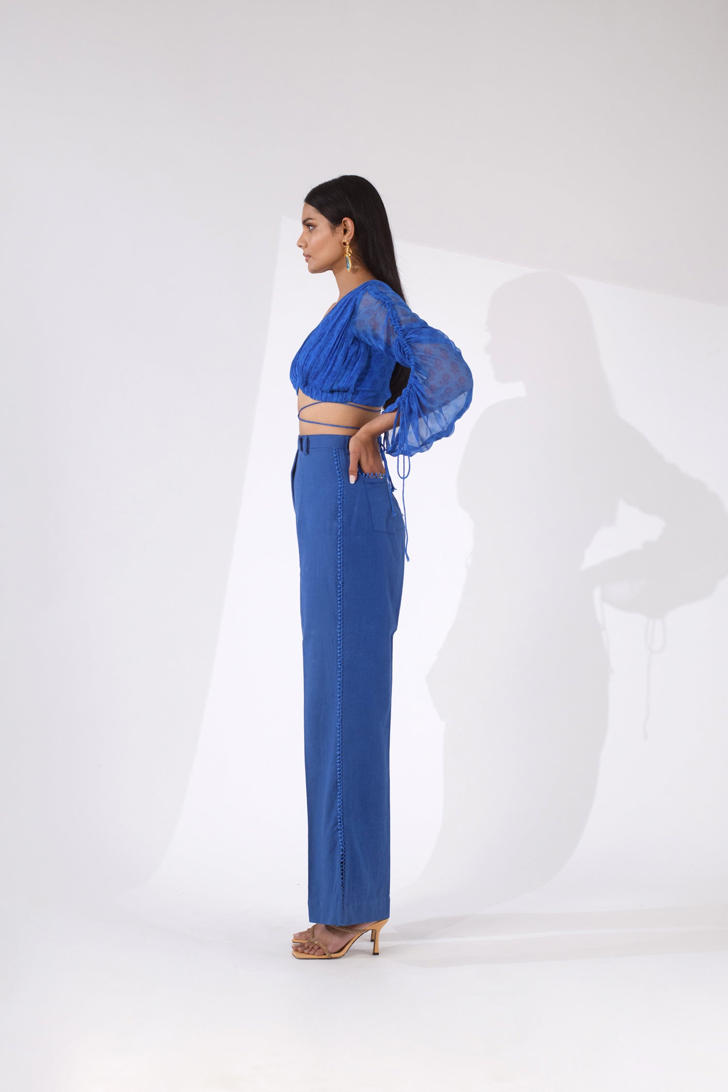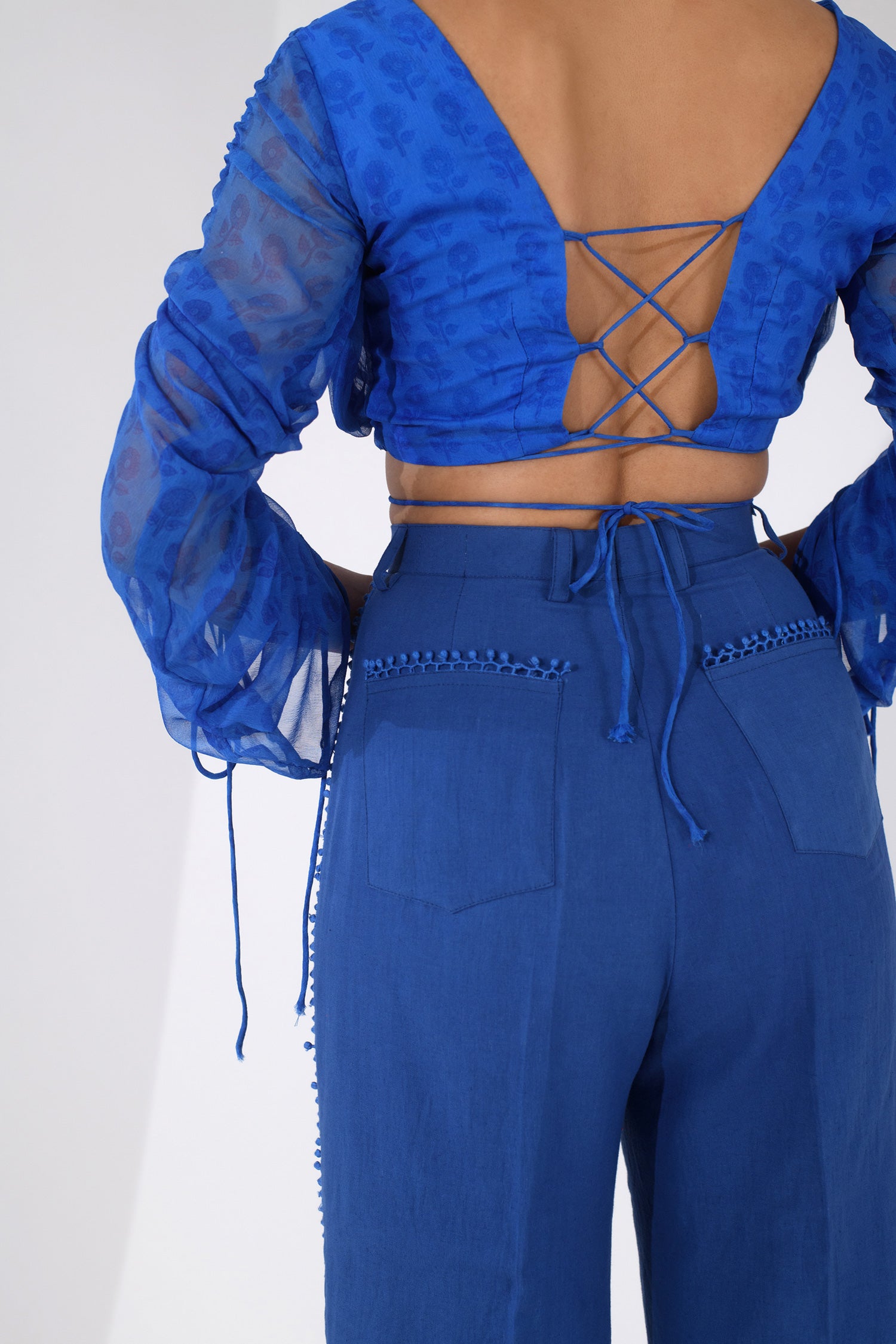 This blue chiffon printed pleated top features midriff flossing, paired with cotton bell-bottom pants with lace detailing. The combination offers a chic, retro-inspired style perfect for spring or summer.