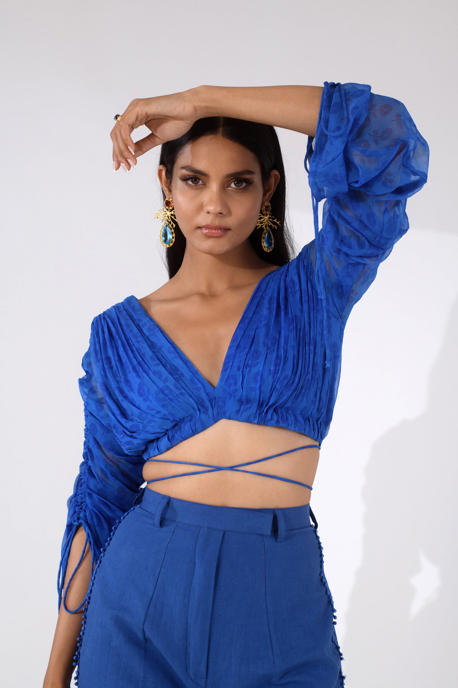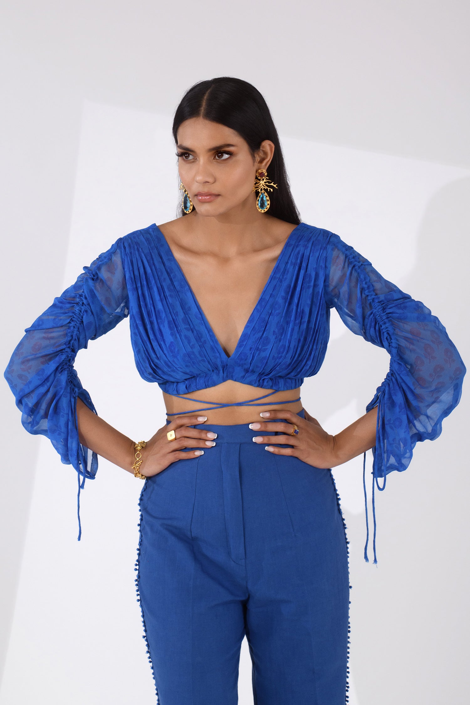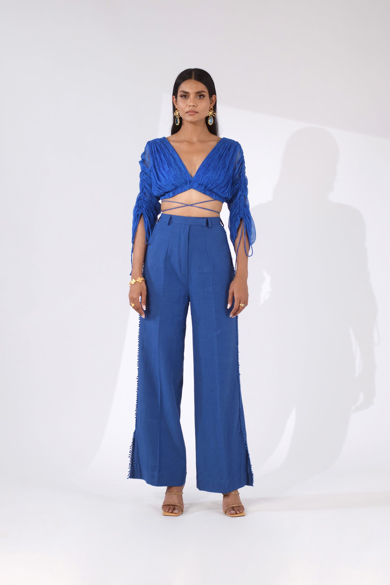 This blue chiffon printed pleated top features midriff flossing, paired with cotton bell-bottom pants with lace detailing. The combination offers a chic, retro-inspired style perfect for spring or summer.