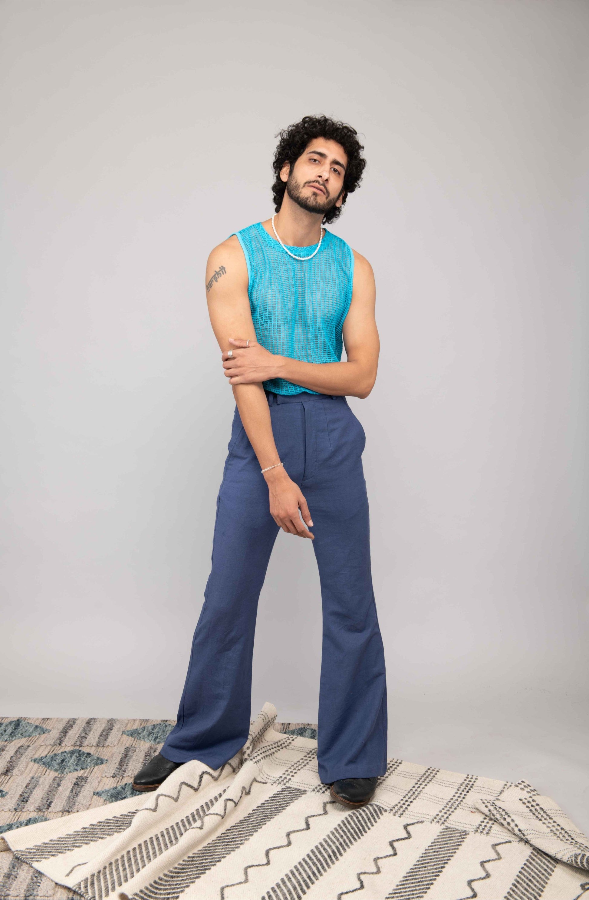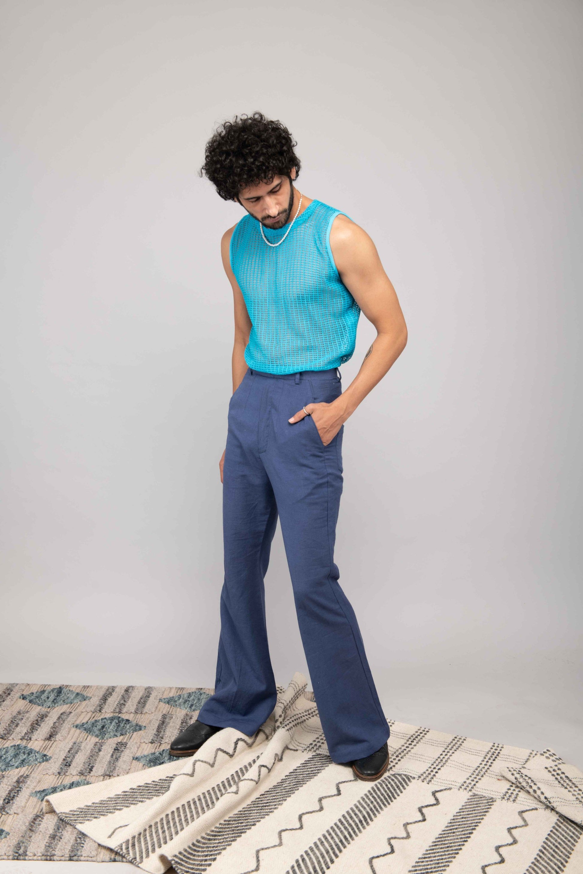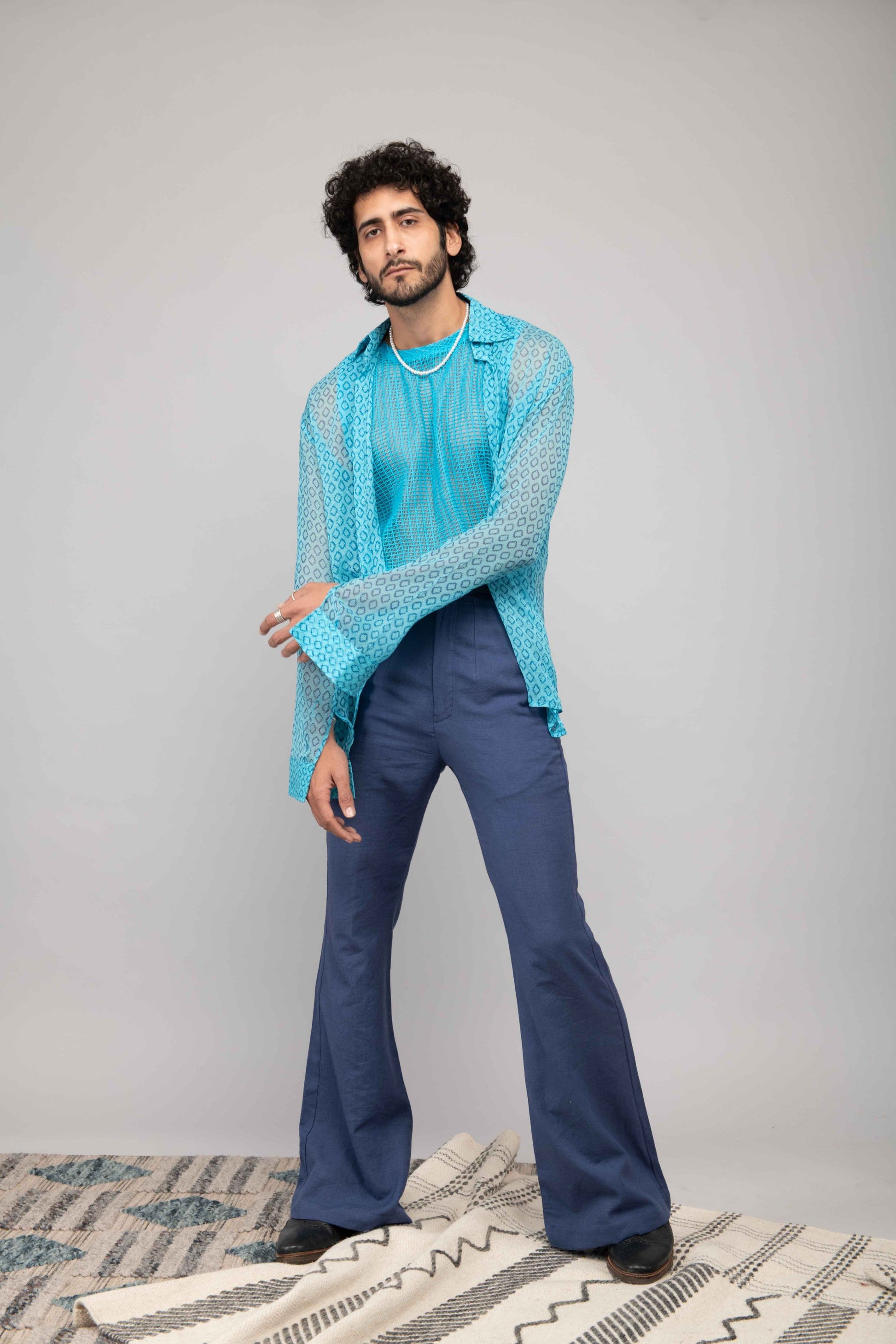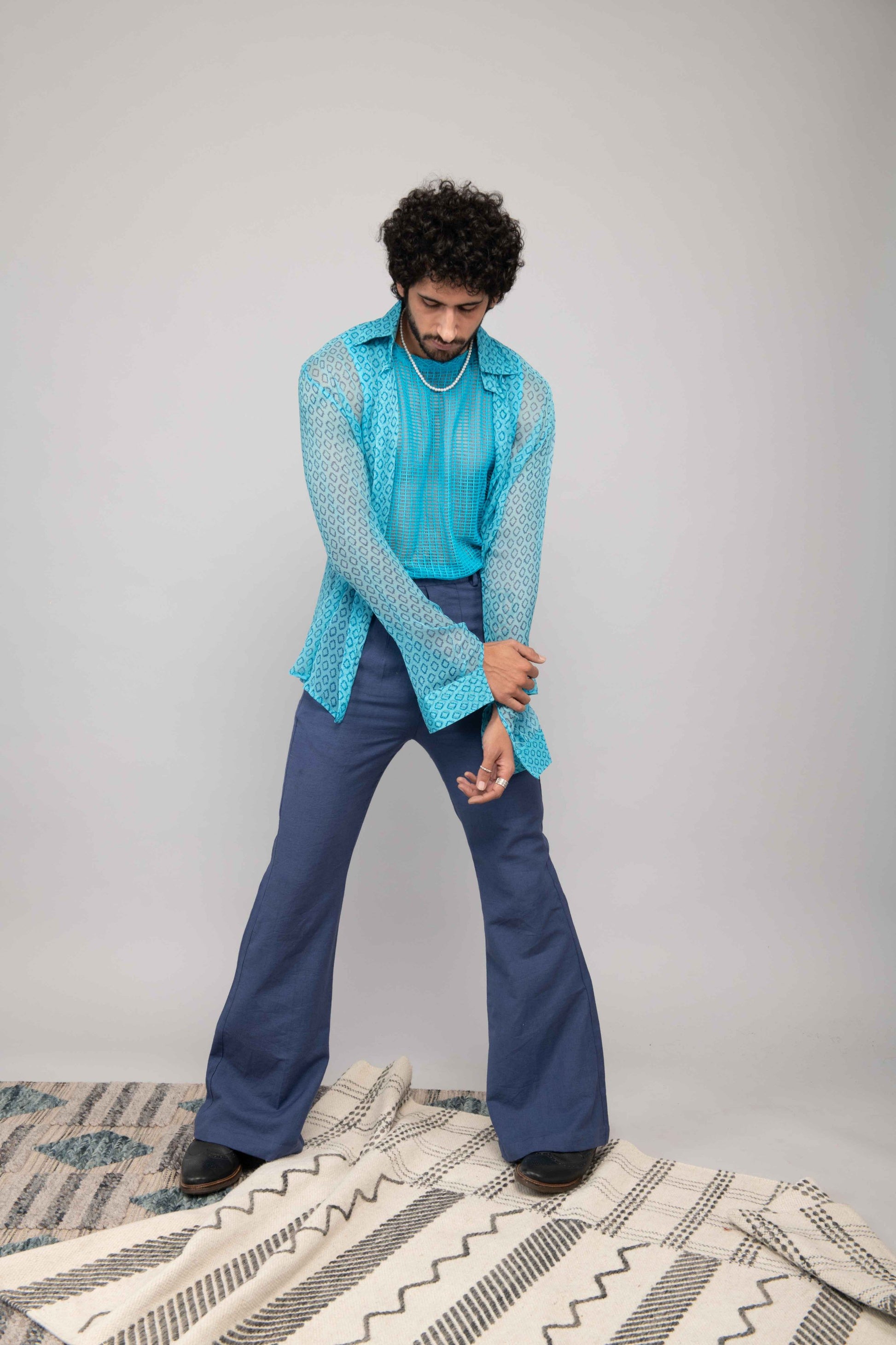 This turquoise mesh lace vest is paired with navy blue bell bottoms and a chiffon handblock printed shirt. A playful and stylish outfit perfect for daytime or casual evening outings.