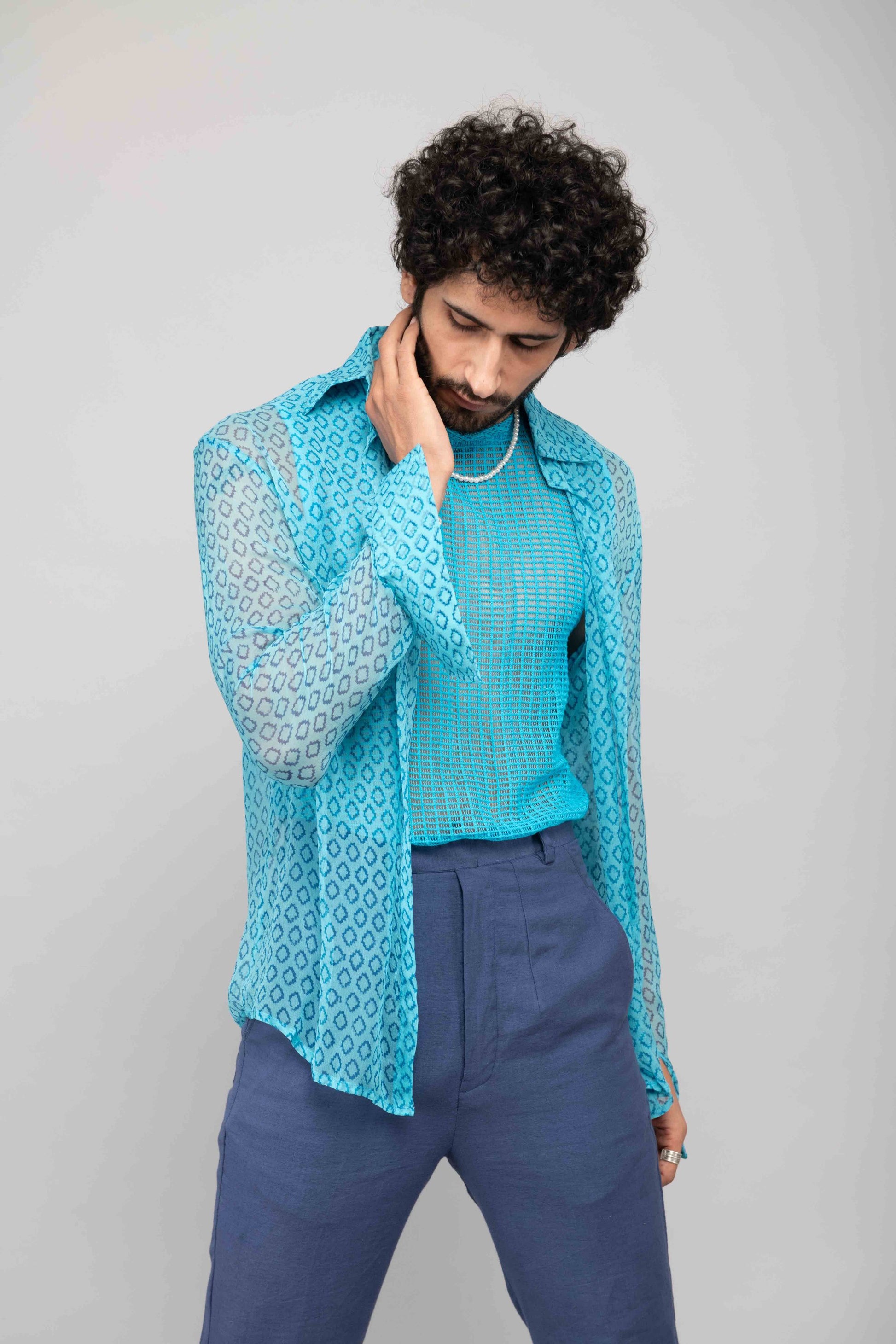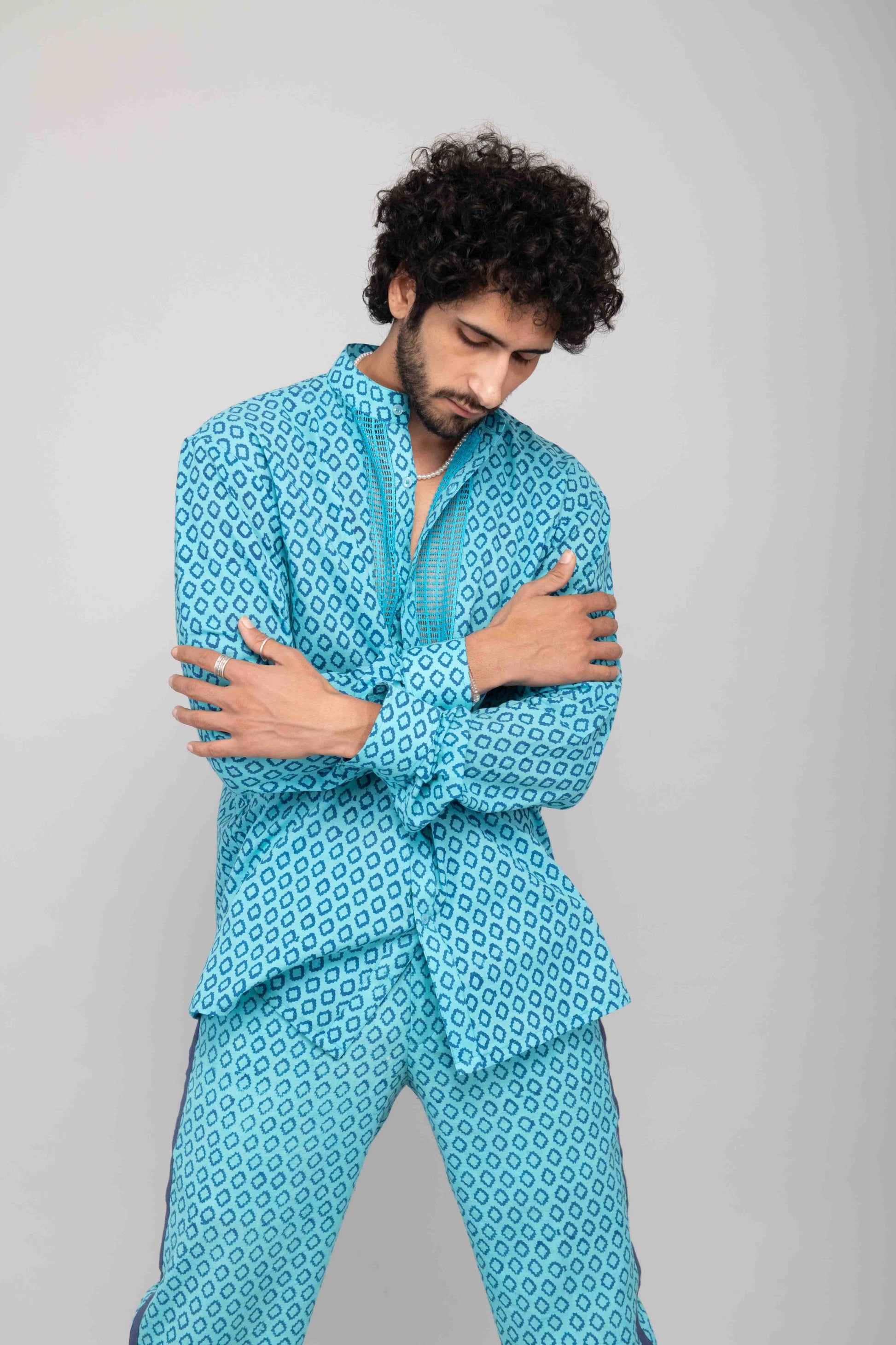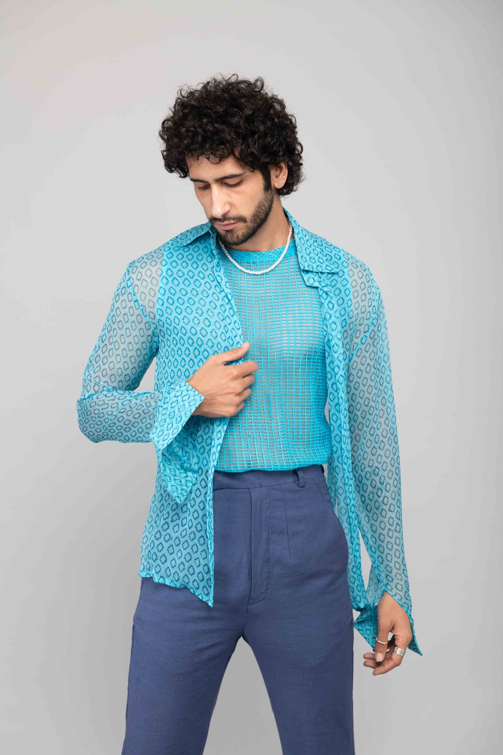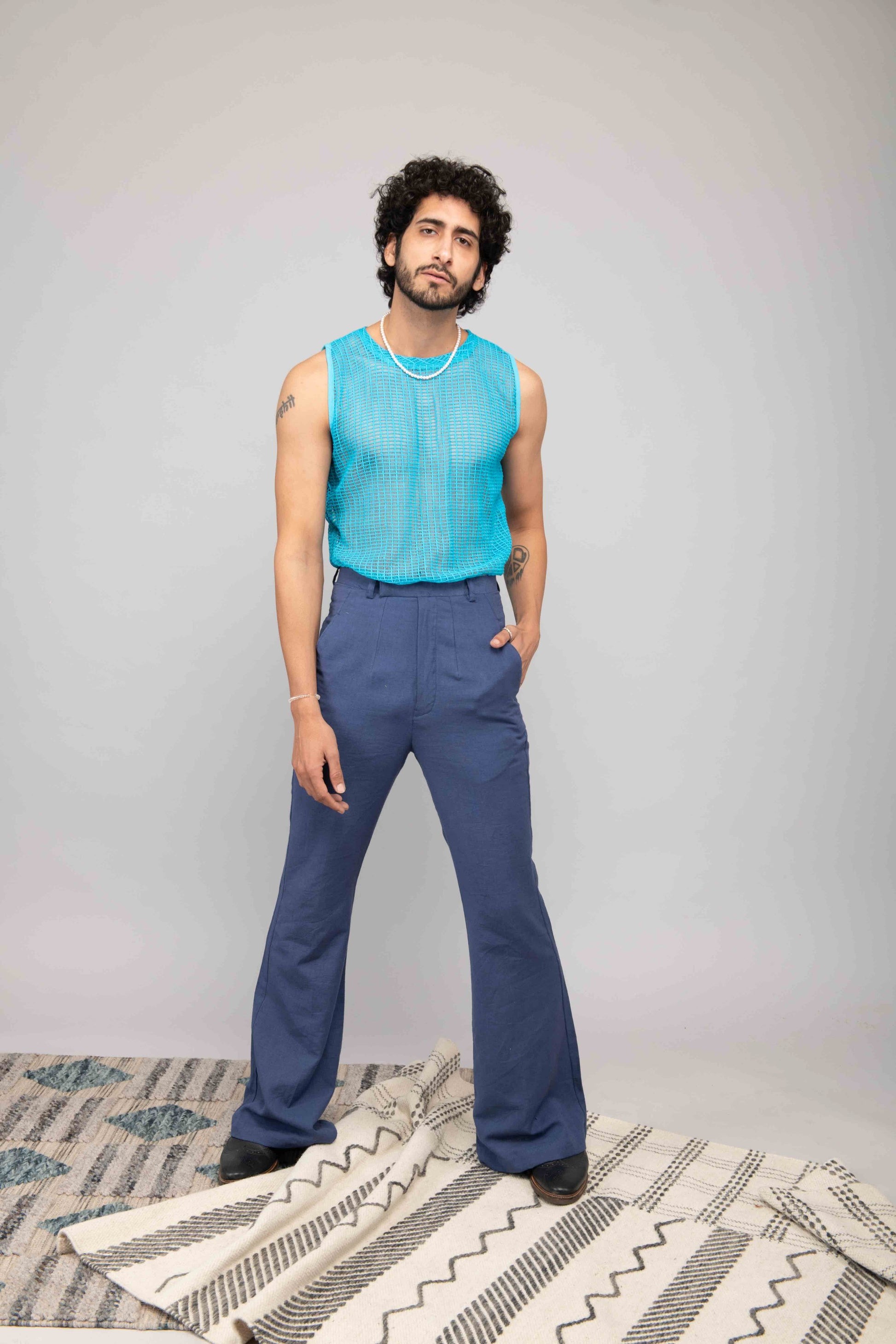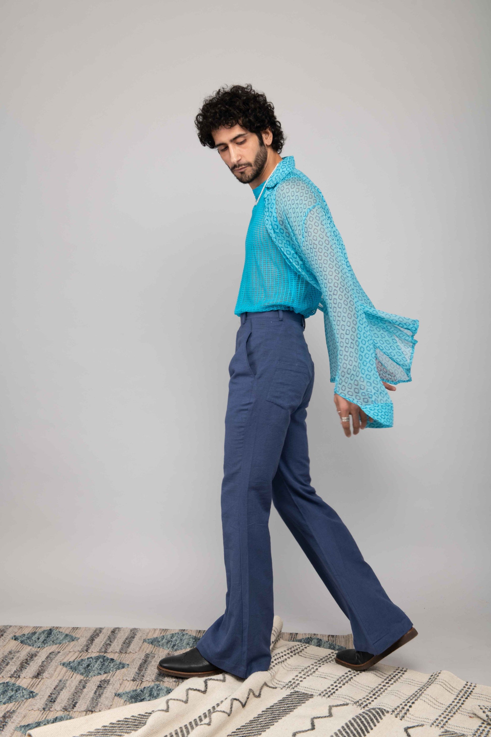 This turquoise mesh lace vest is paired with navy blue bell bottoms and a chiffon handblock printed shirt. A playful and stylish outfit perfect for daytime or casual evening outings.
