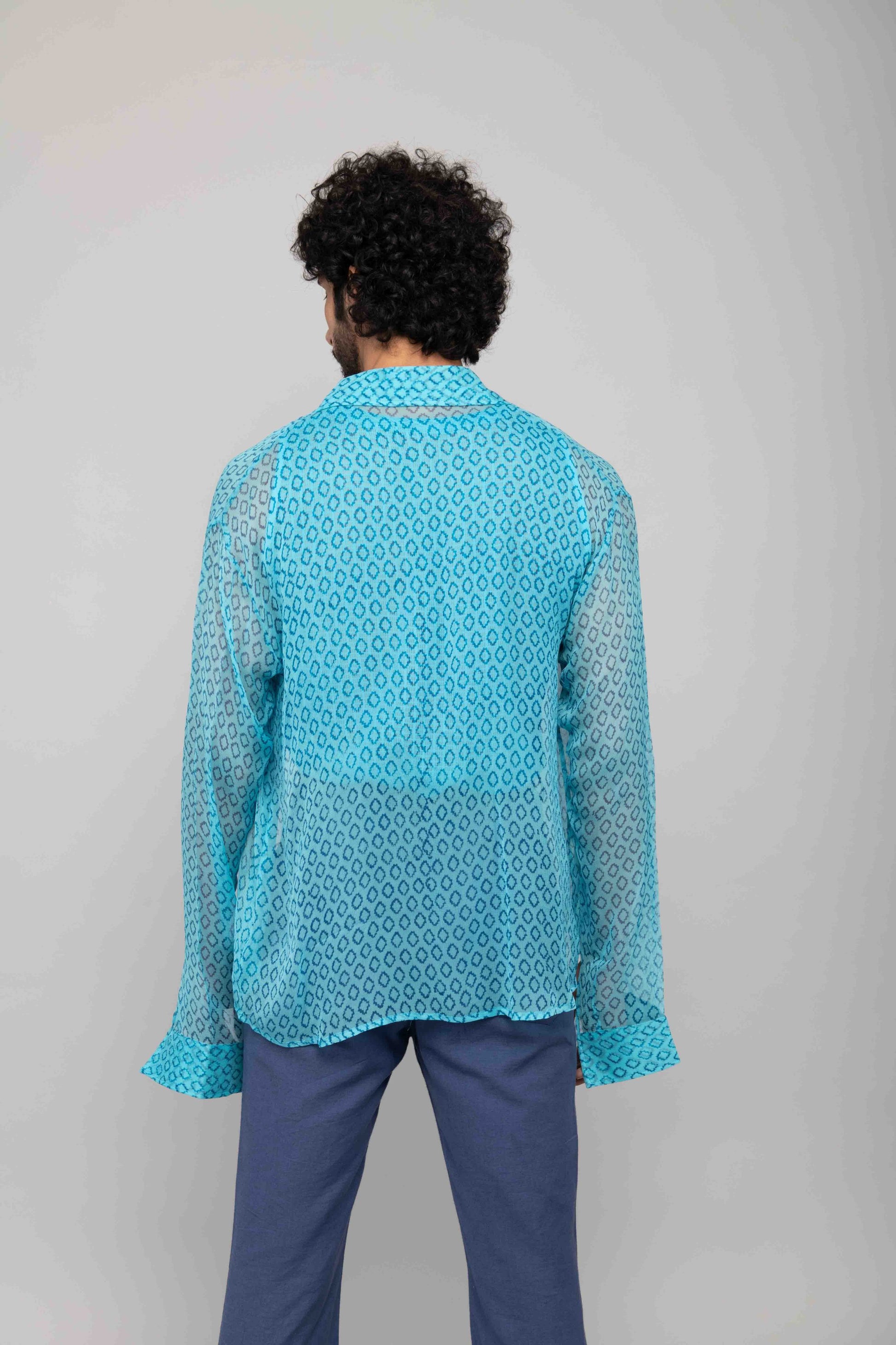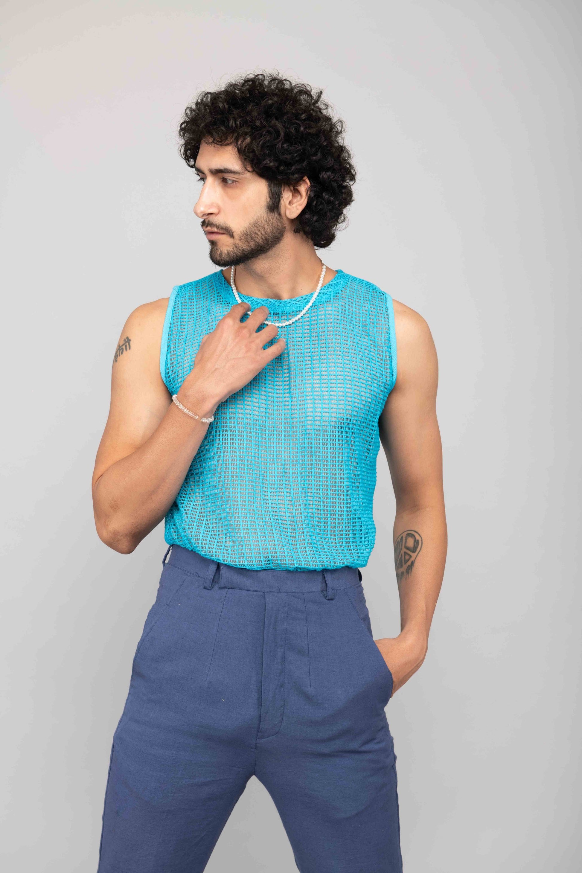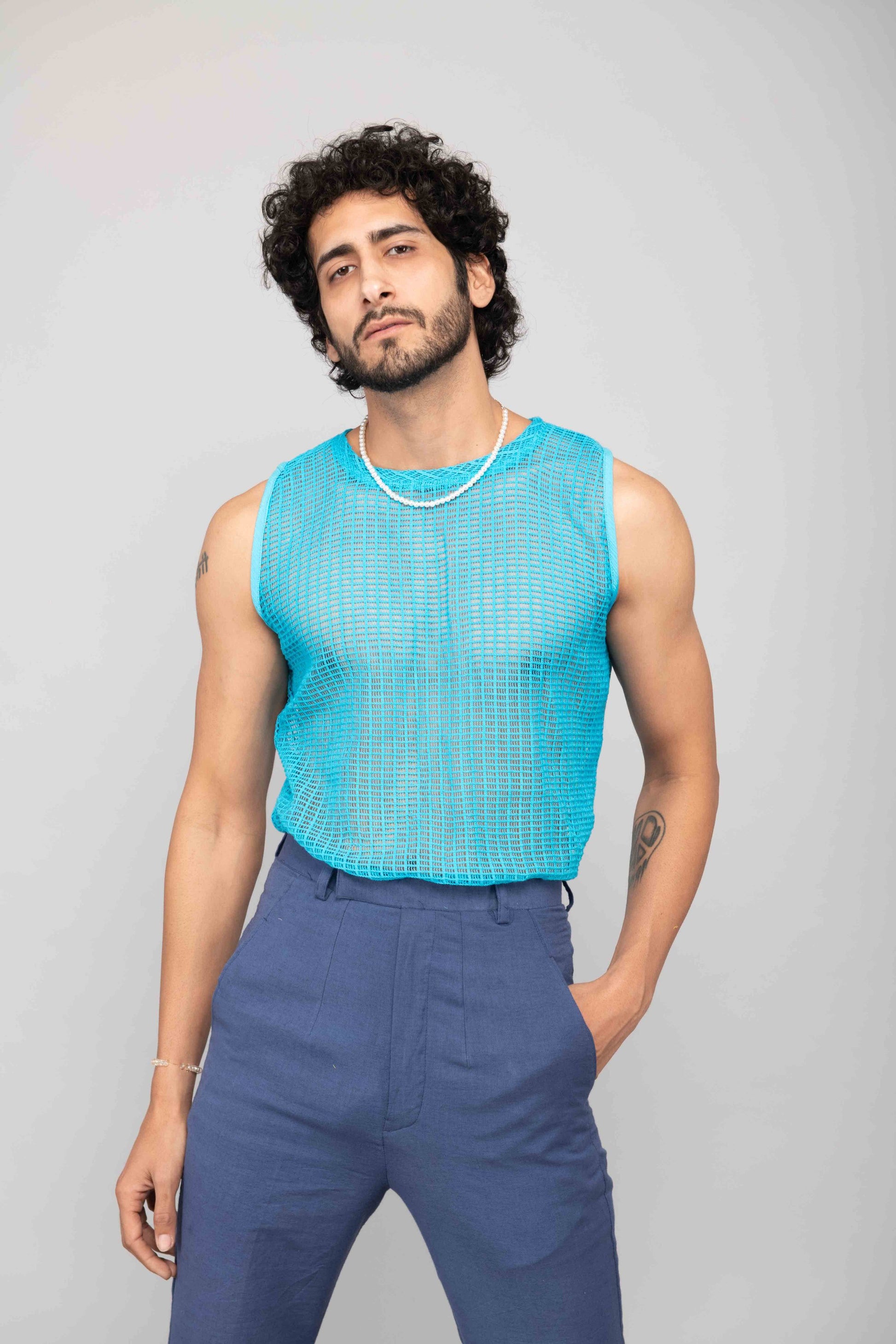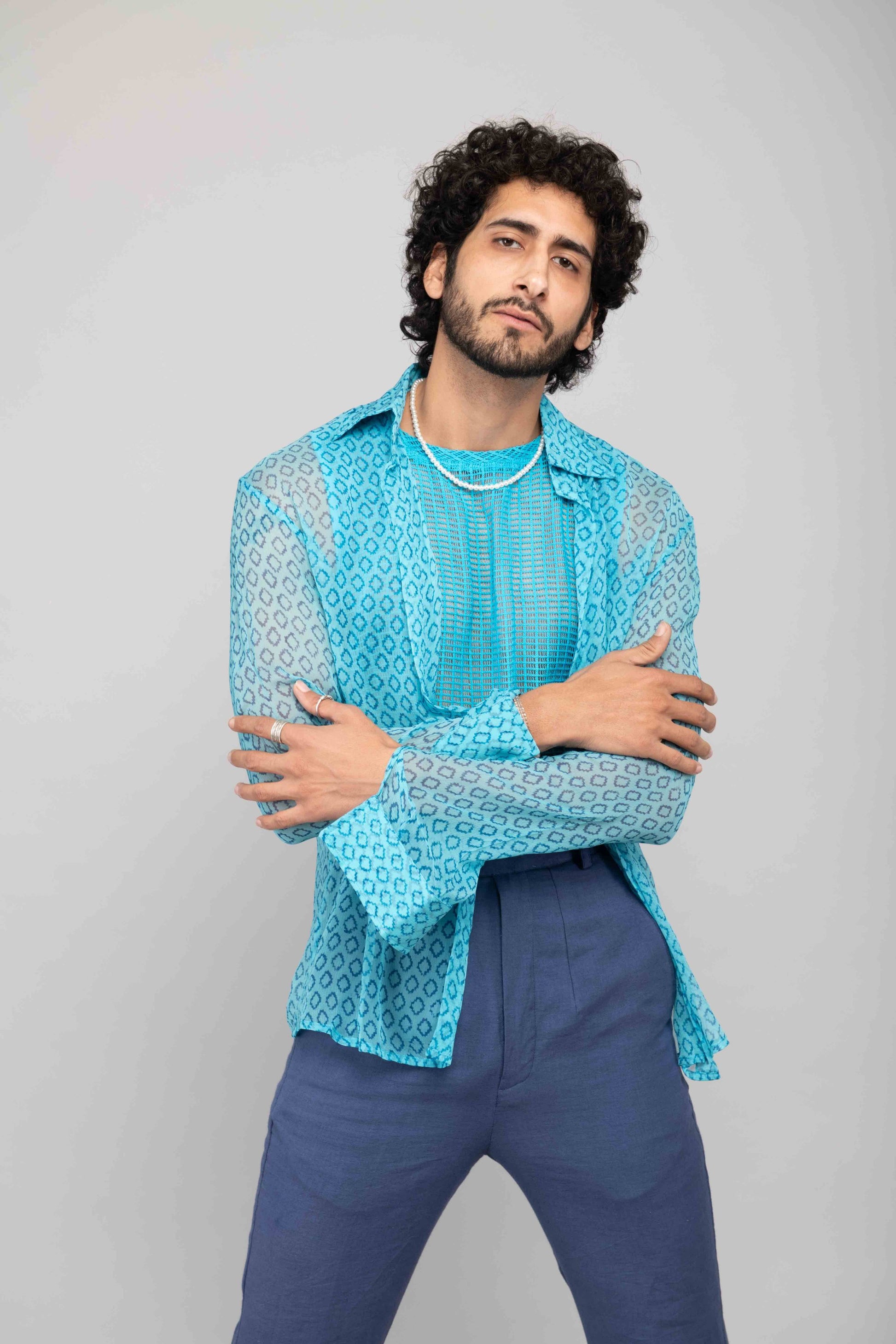 This turquoise mesh lace vest is paired with navy blue bell bottoms and a chiffon handblock printed shirt. A playful and stylish outfit perfect for daytime or casual evening outings.