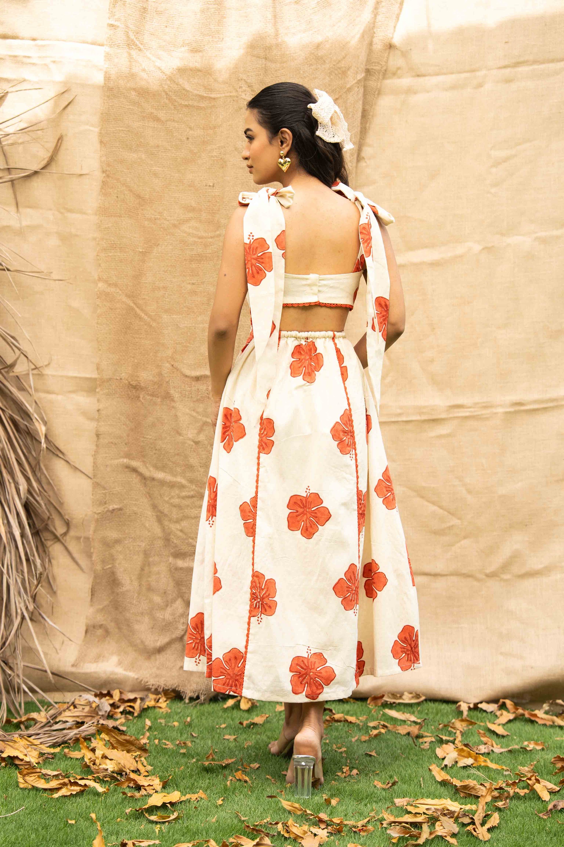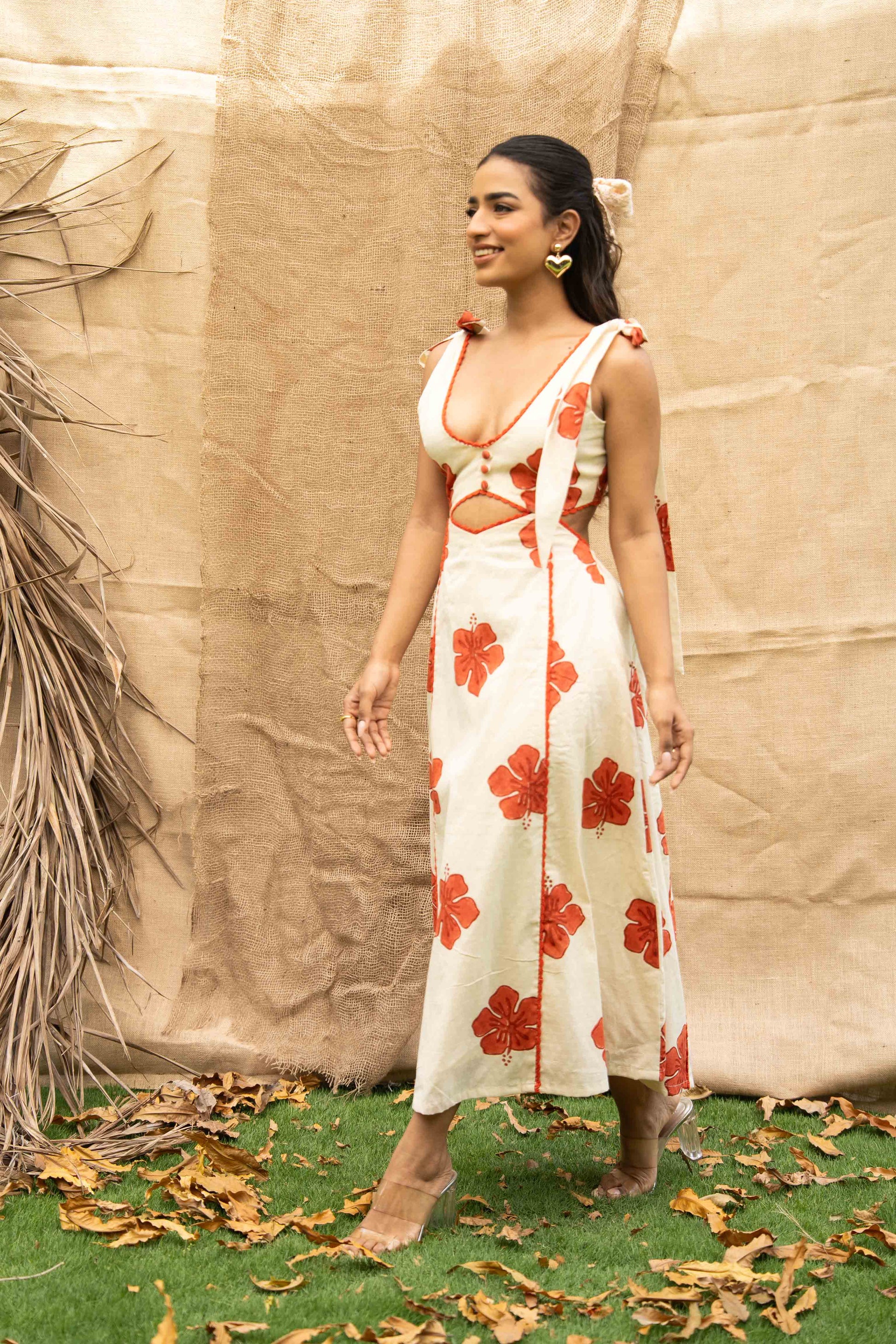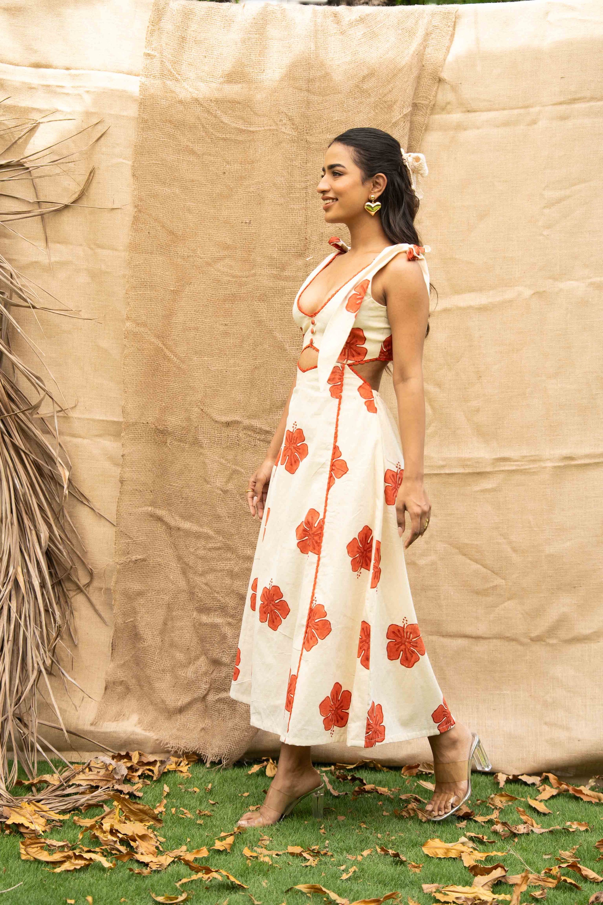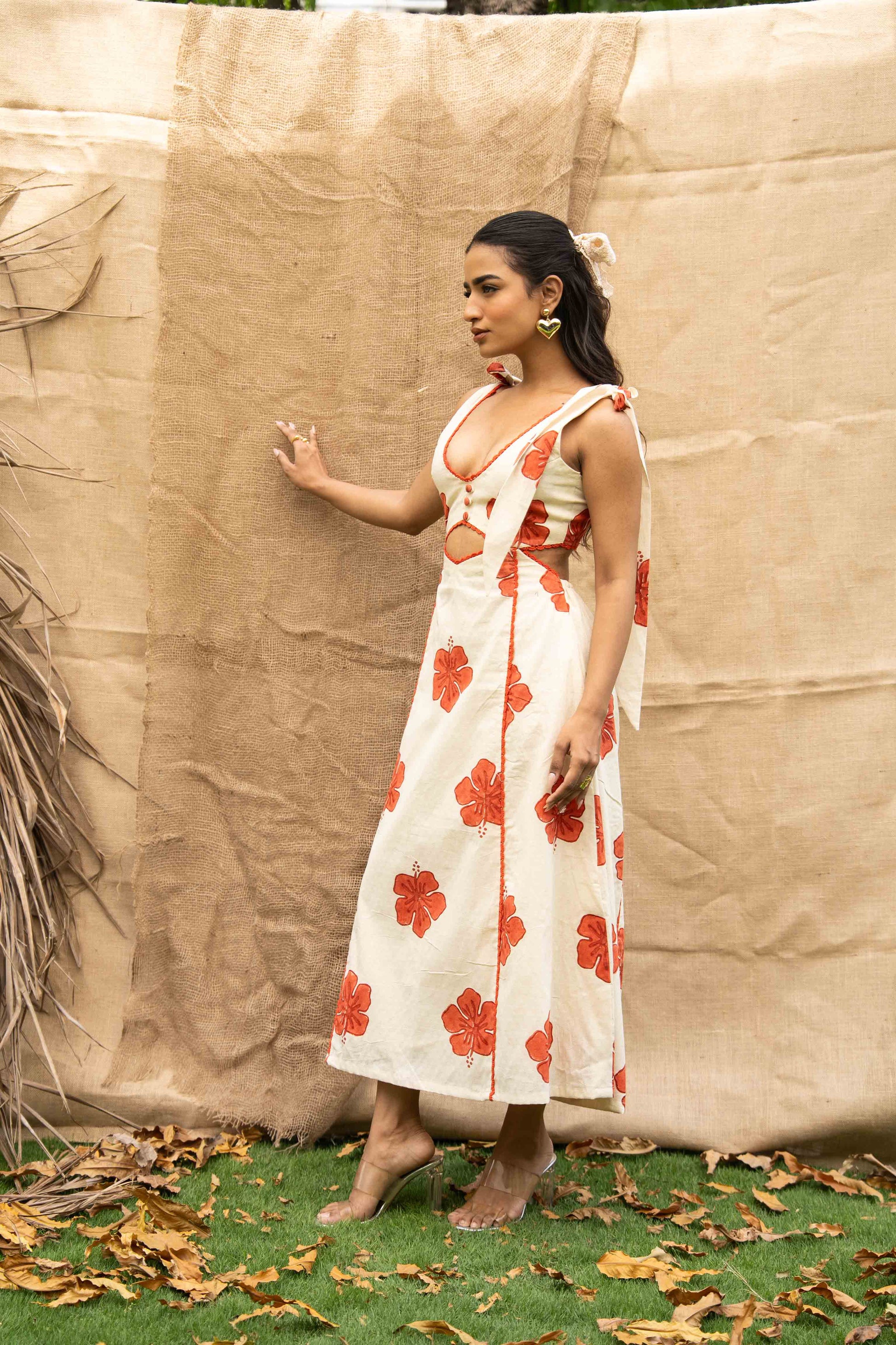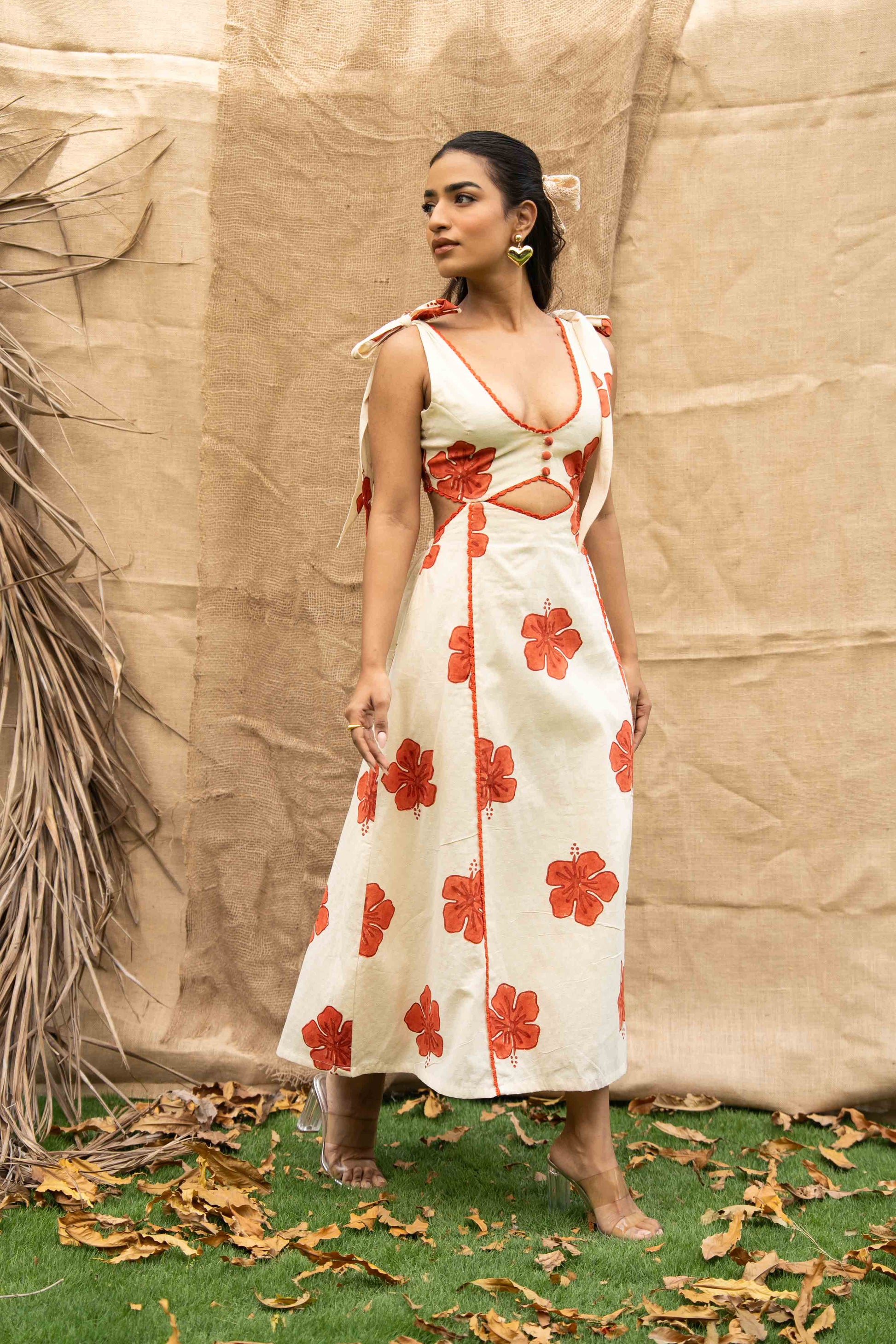 The JULIA Dress is a fit-and-flare midi crafted from breathable cotton with delicate crochet and lace detailing. Featuring playful cutouts and a vibrant floral print in orange, this dress brings artisanal charm to your summer daywear collection.