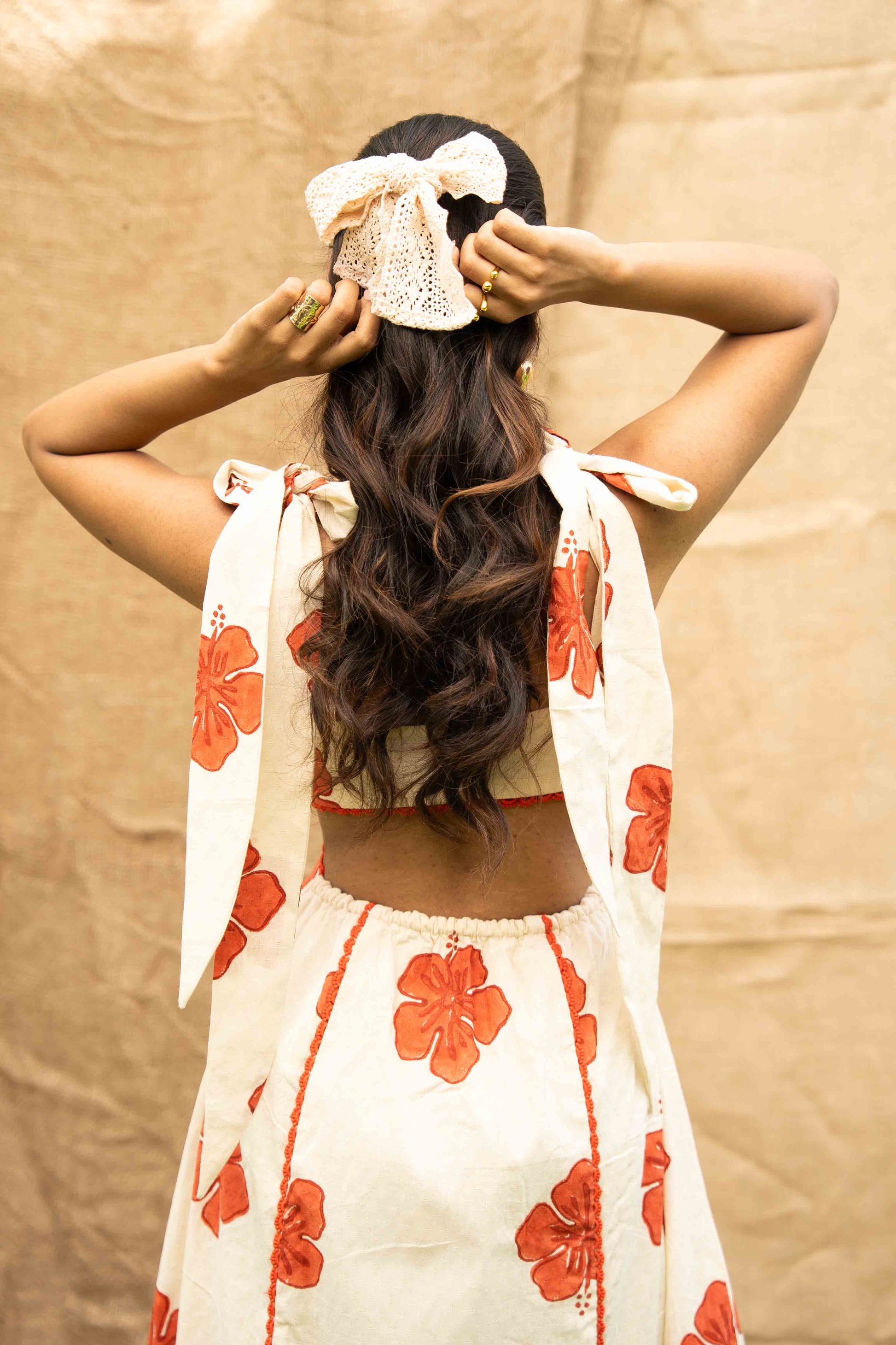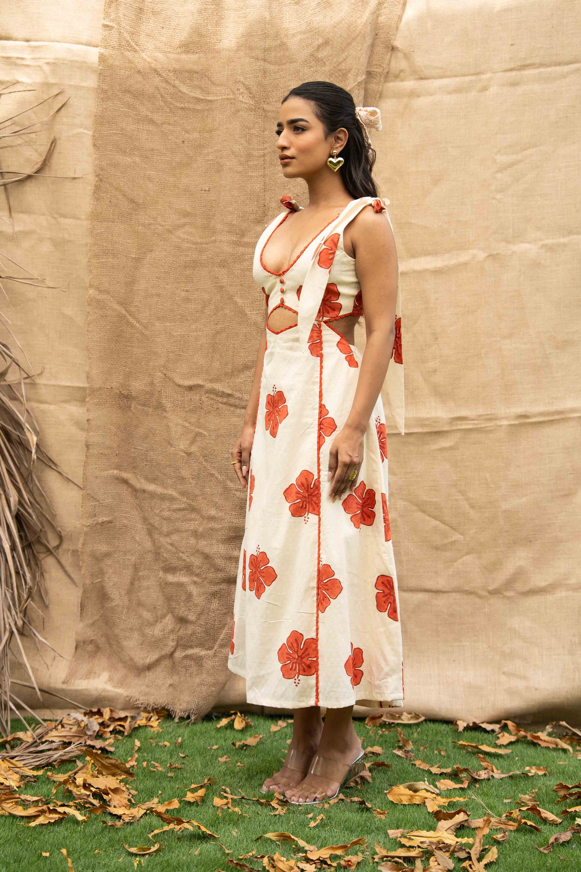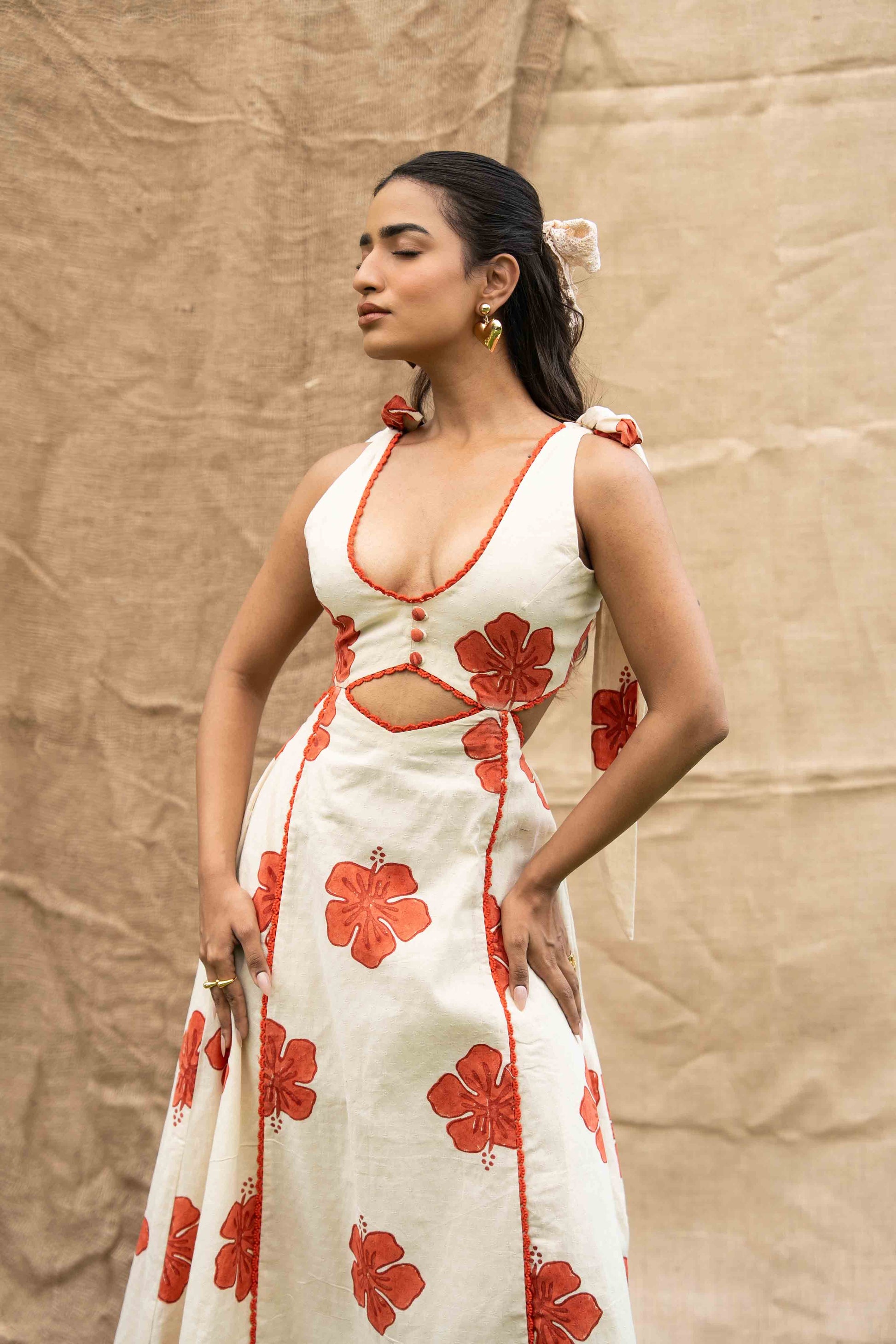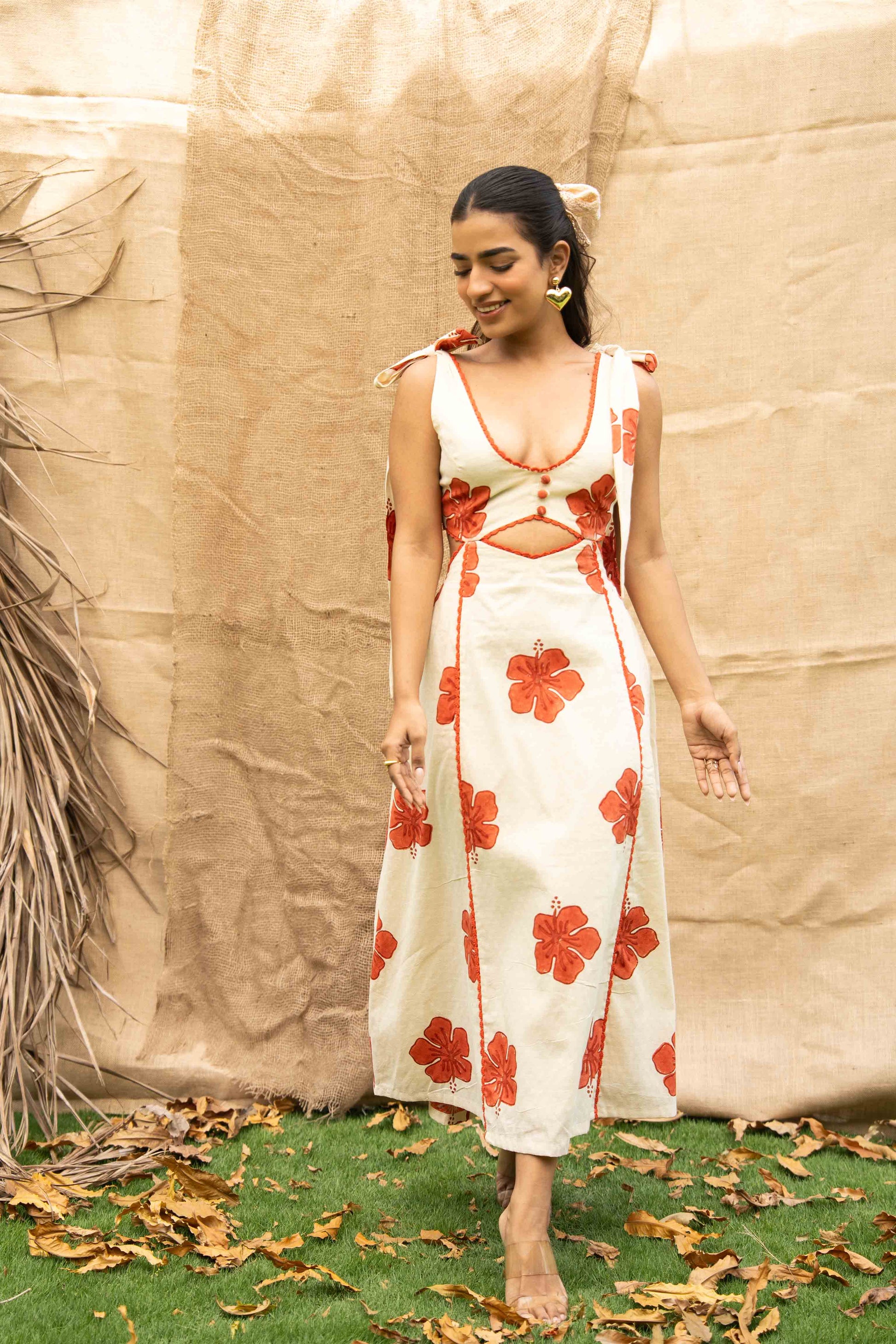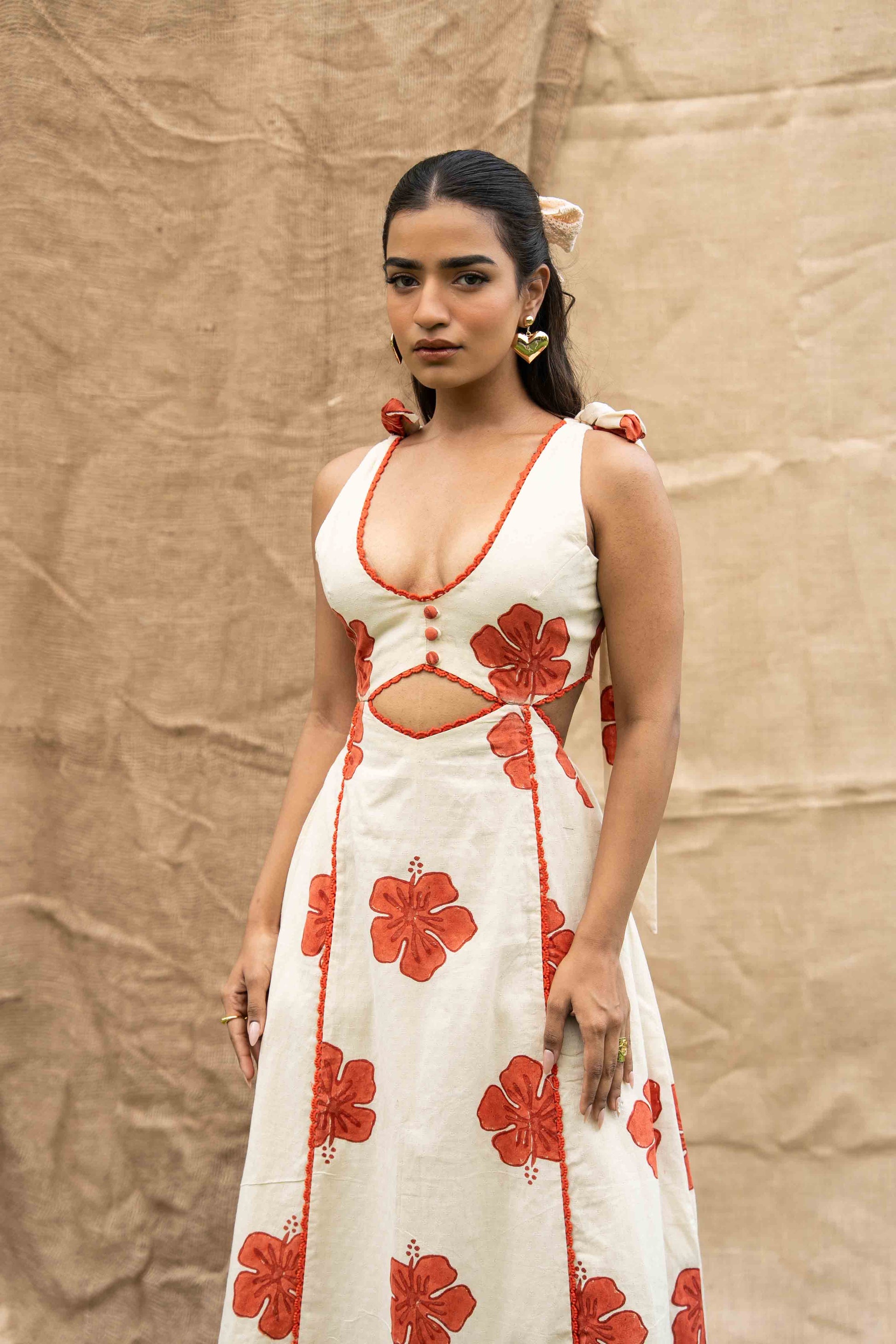 The JULIA Dress is a fit-and-flare midi crafted from breathable cotton with delicate crochet and lace detailing. Featuring playful cutouts and a vibrant floral print in orange, this dress brings artisanal charm to your summer daywear collection.