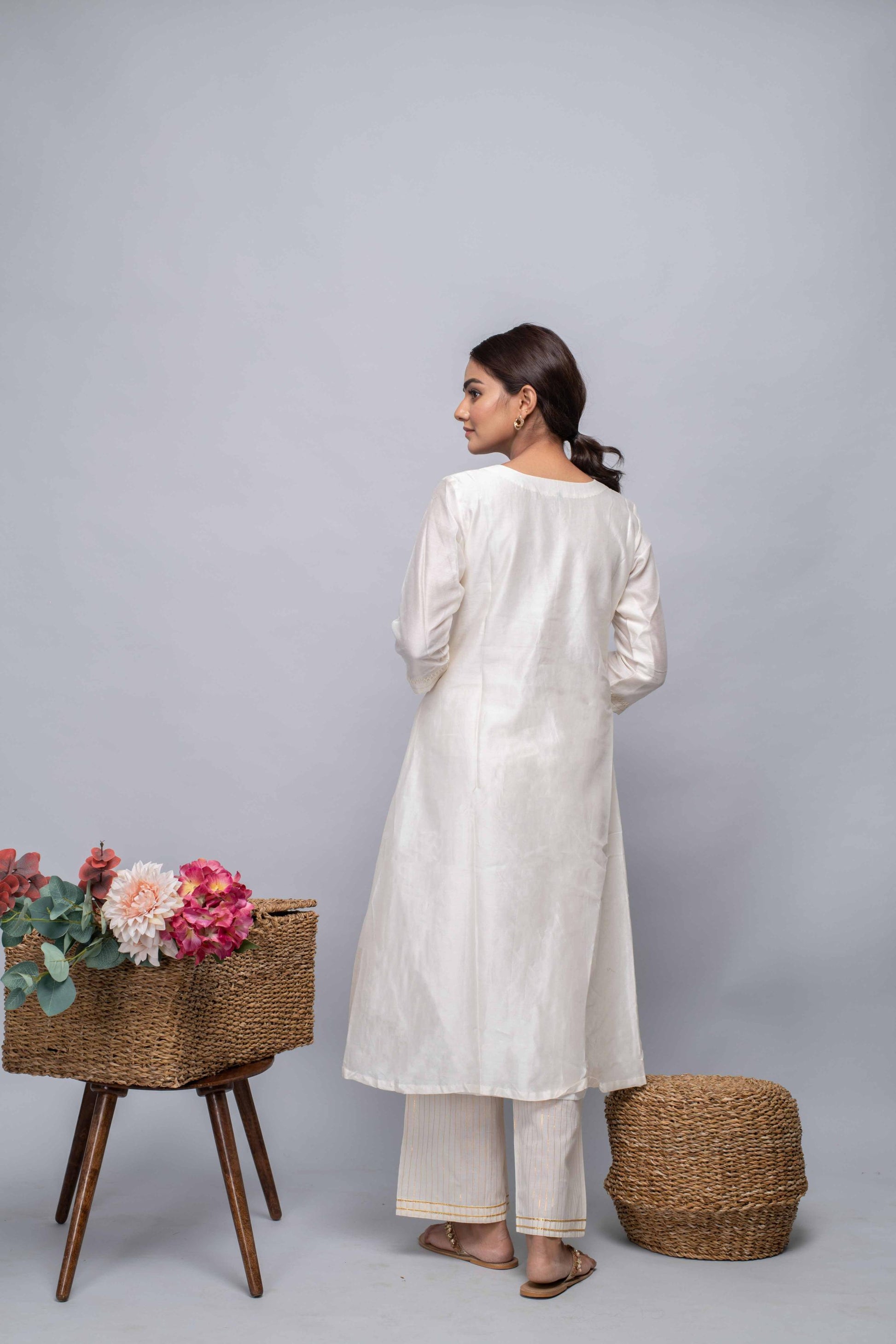 This off-white chanderi suit set features a kurta with lurex lines and handwork, paired with luxe cotton pants and a kota doria dupatta with gota on the borders. The soft off-white shade adds a touch of sophistication.