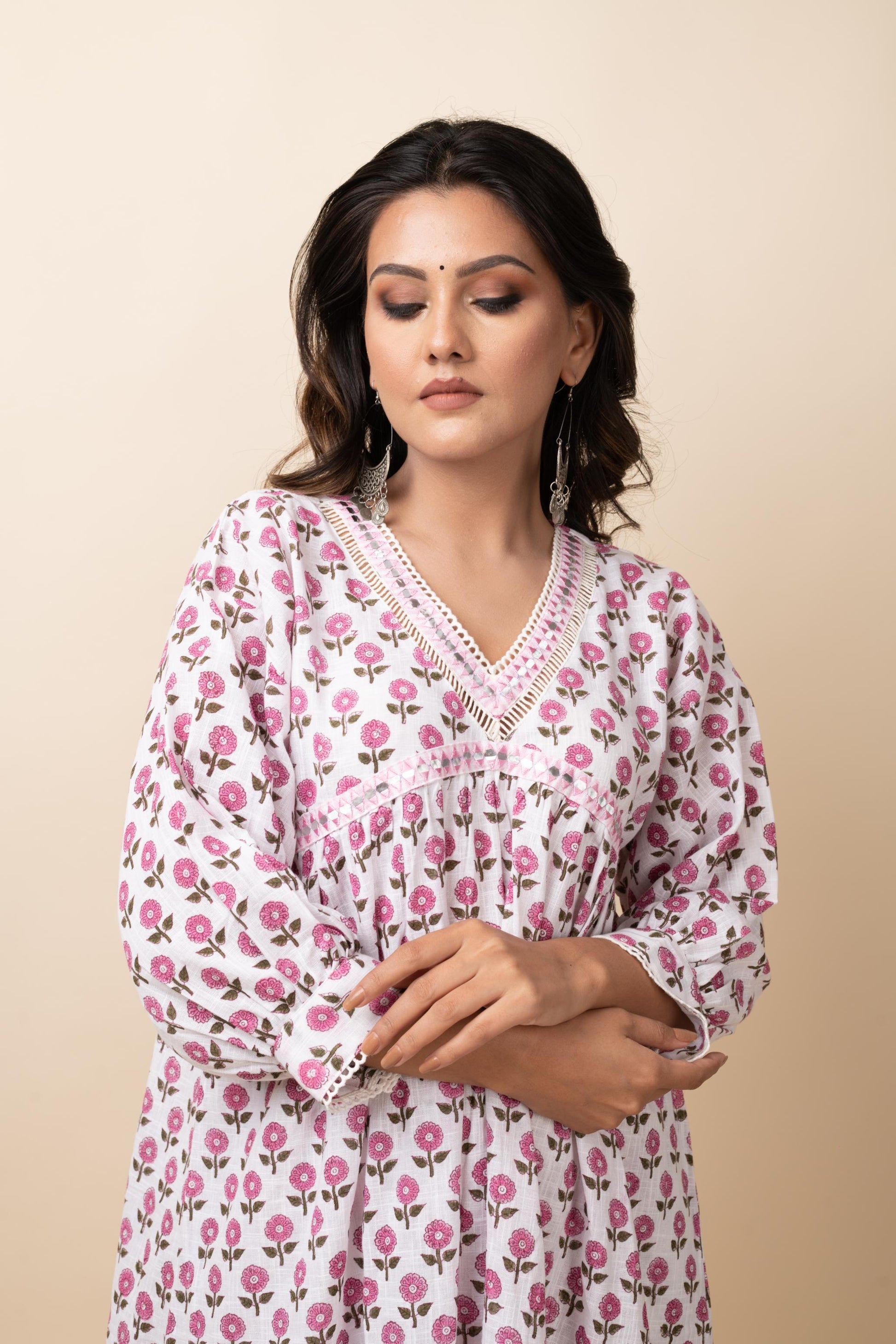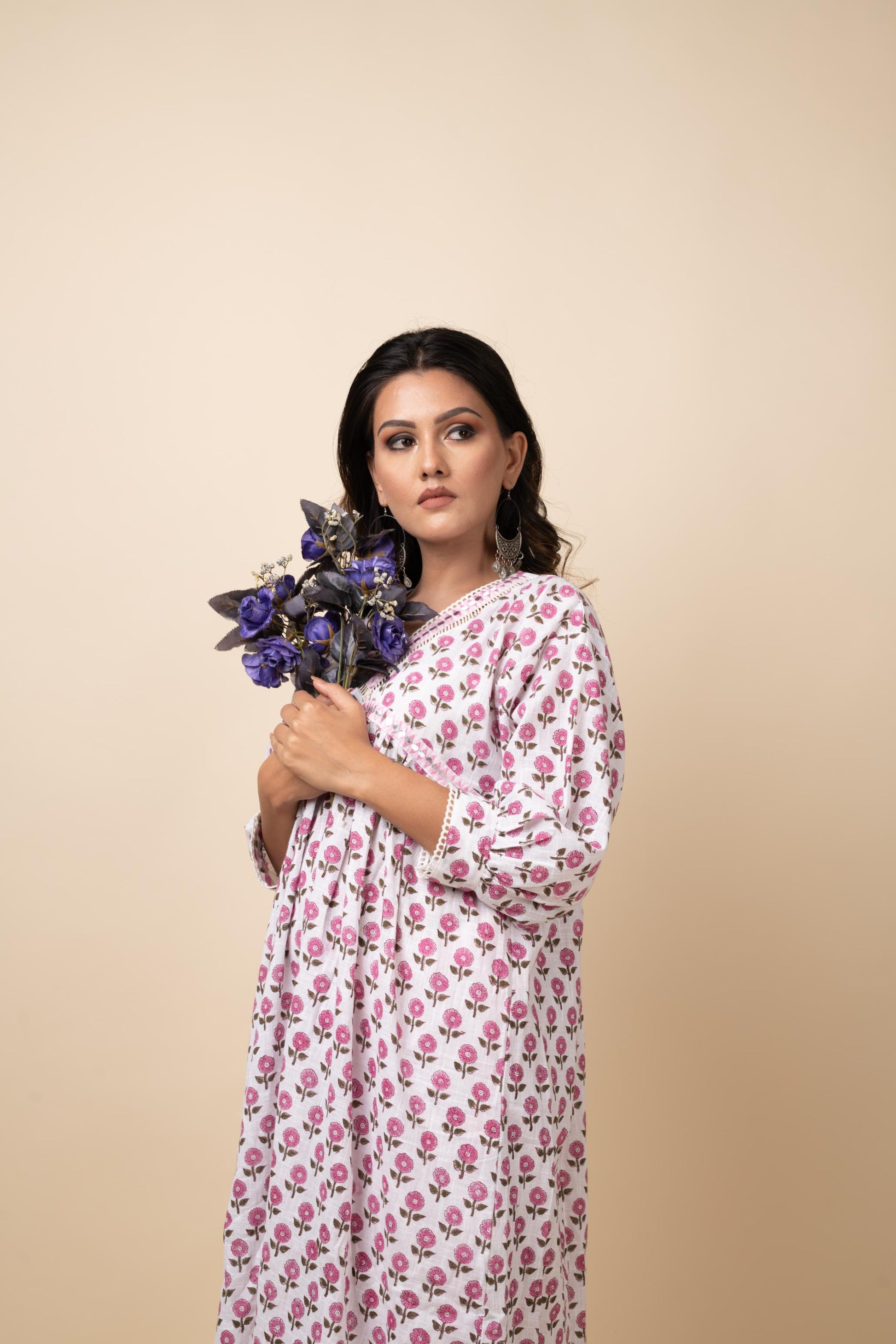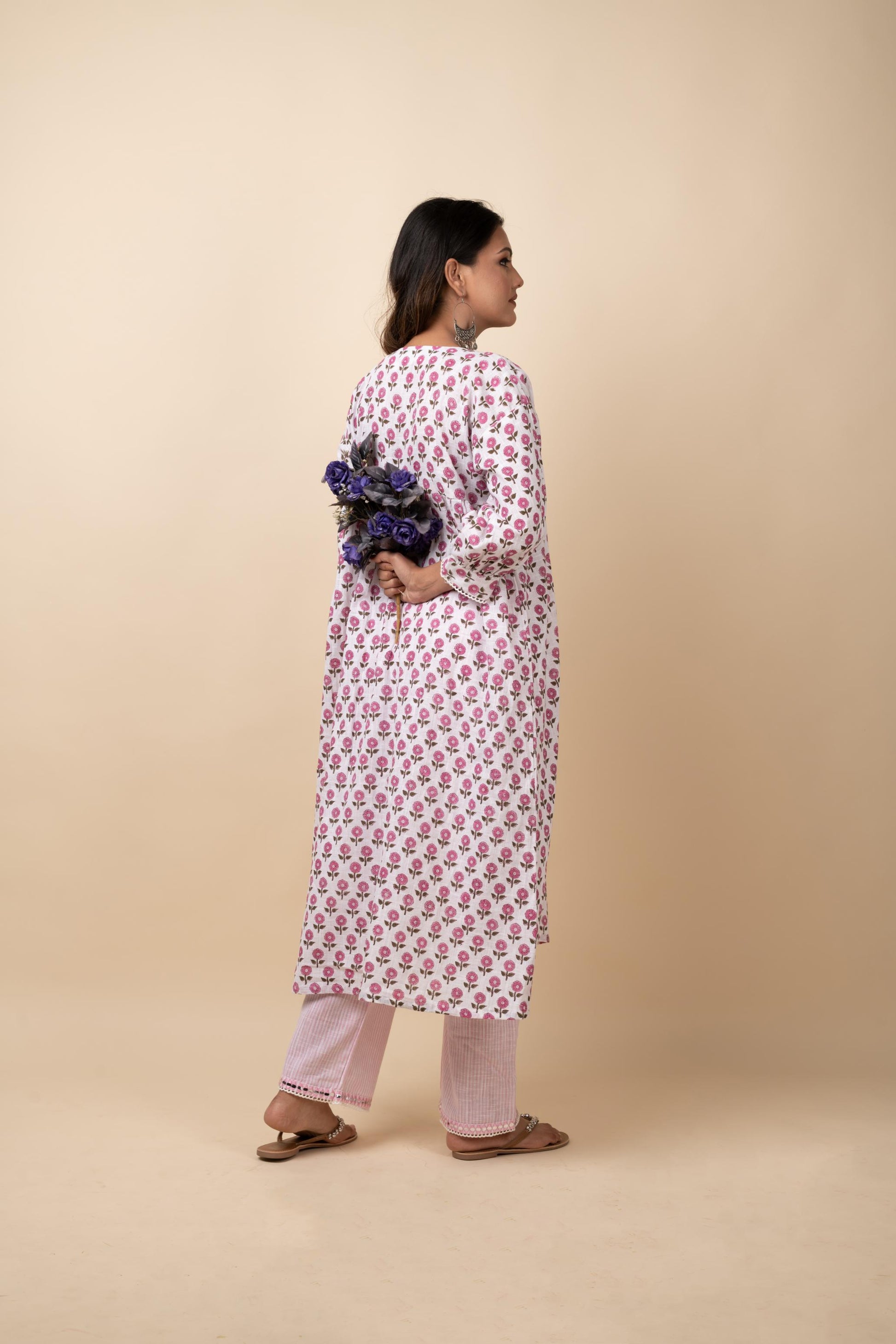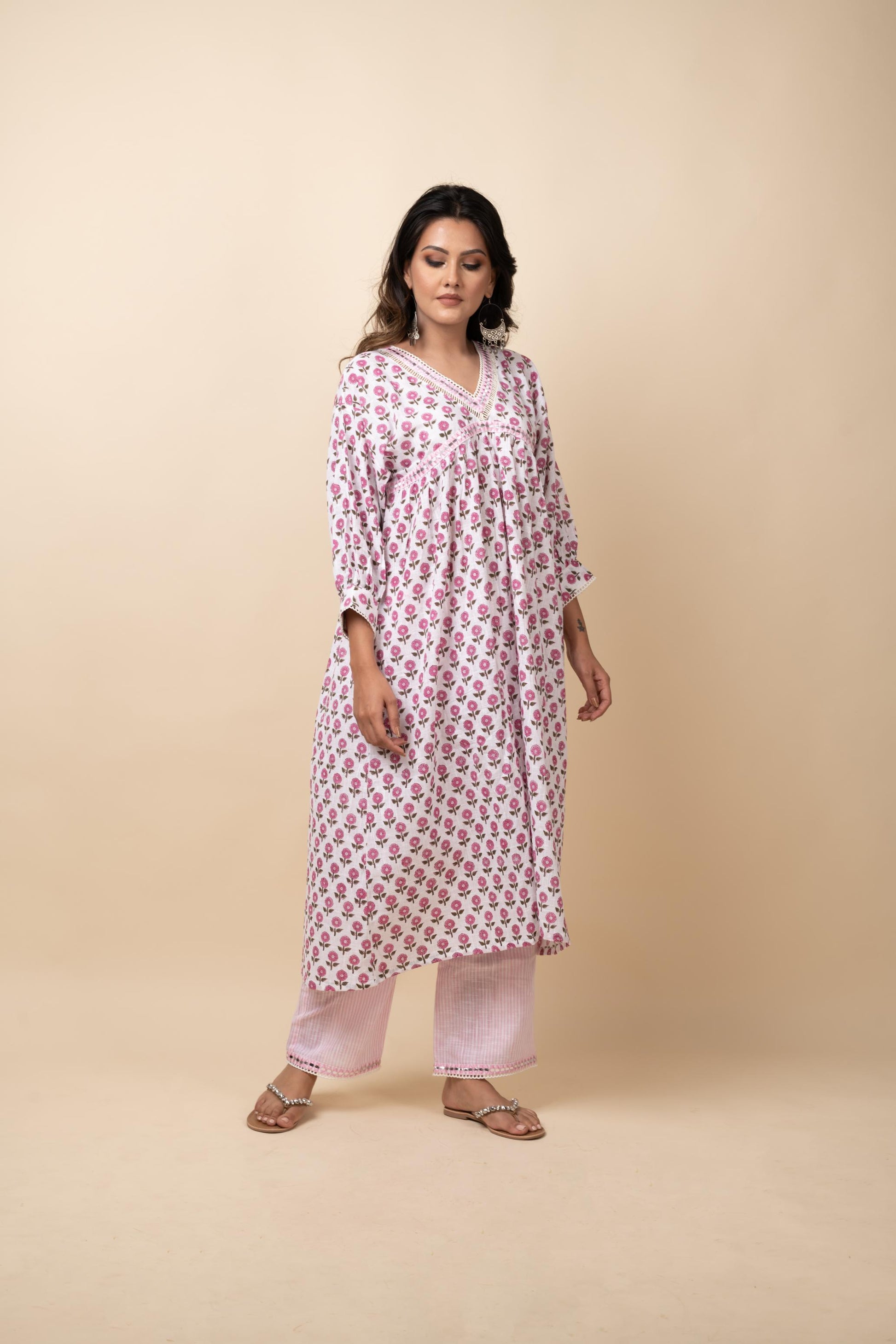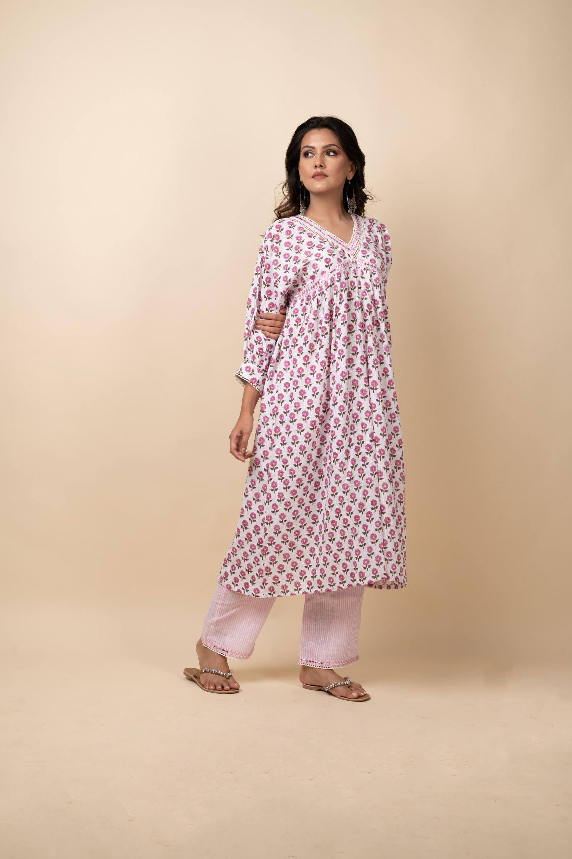 PINK PRINTED BUTTI GATHERED KURTA SET