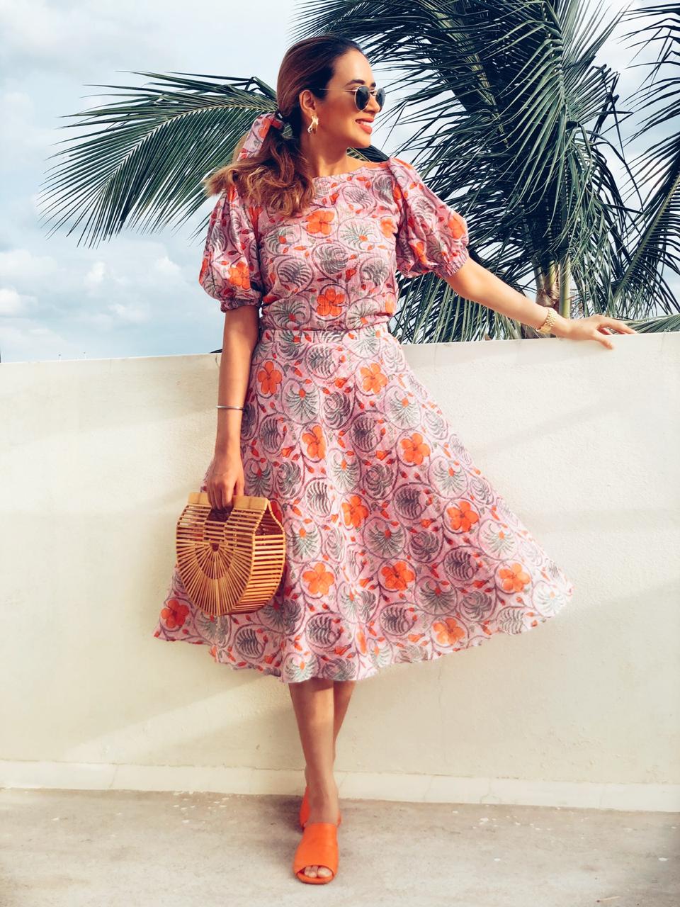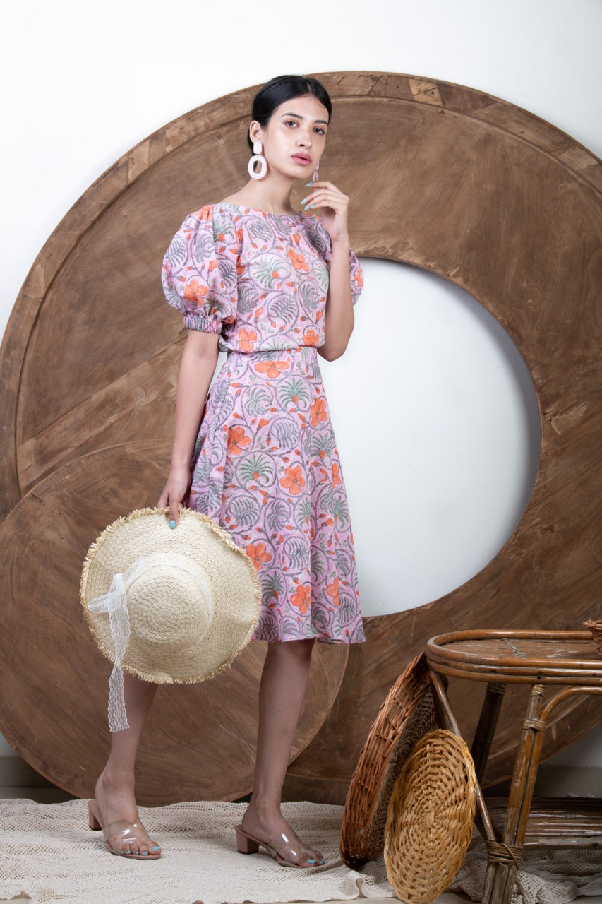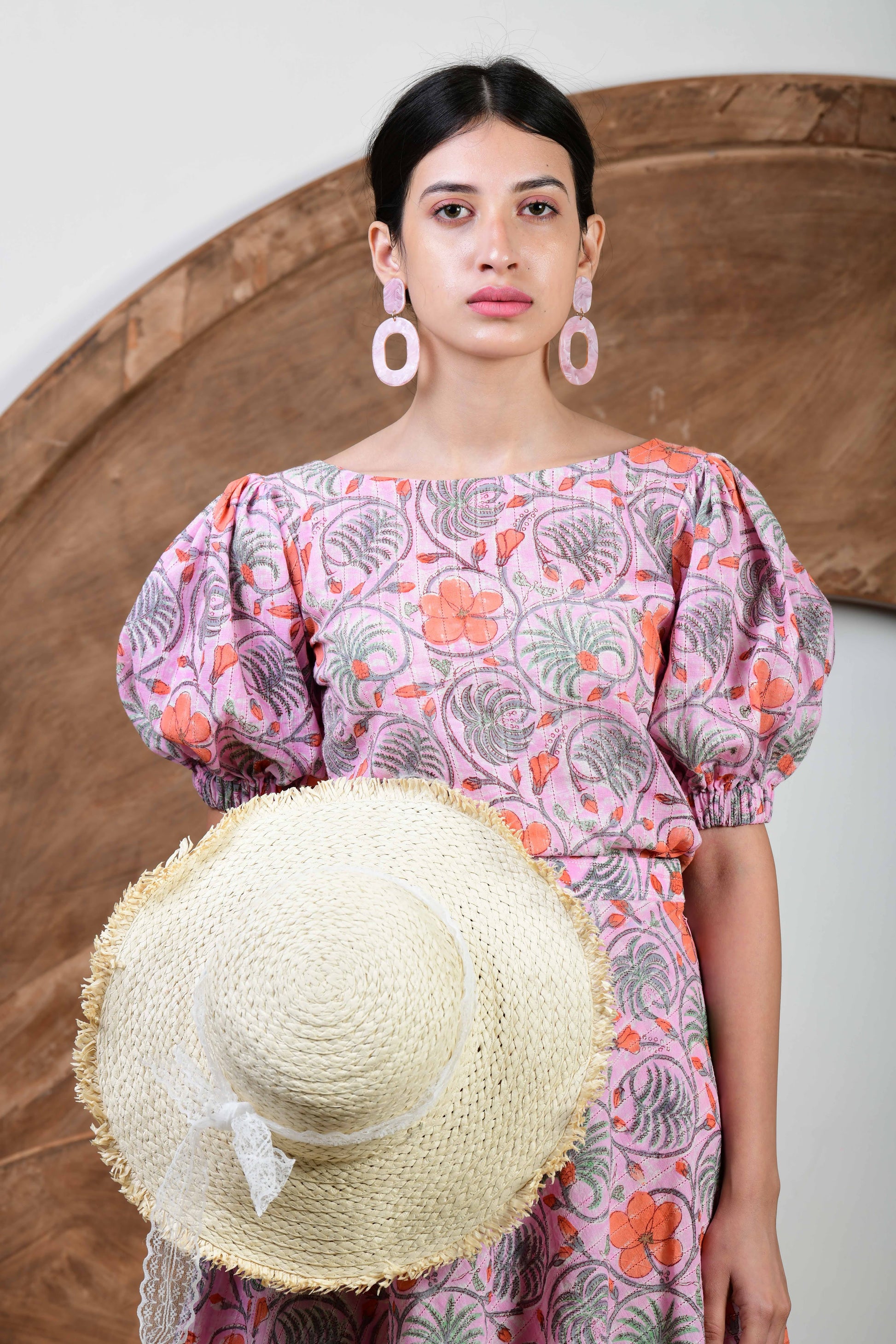 This cotton pink puffed sleeves top with fishnet detailing is paired with a circular printed skirt, offering a unique and fashionable look perfect for summer.