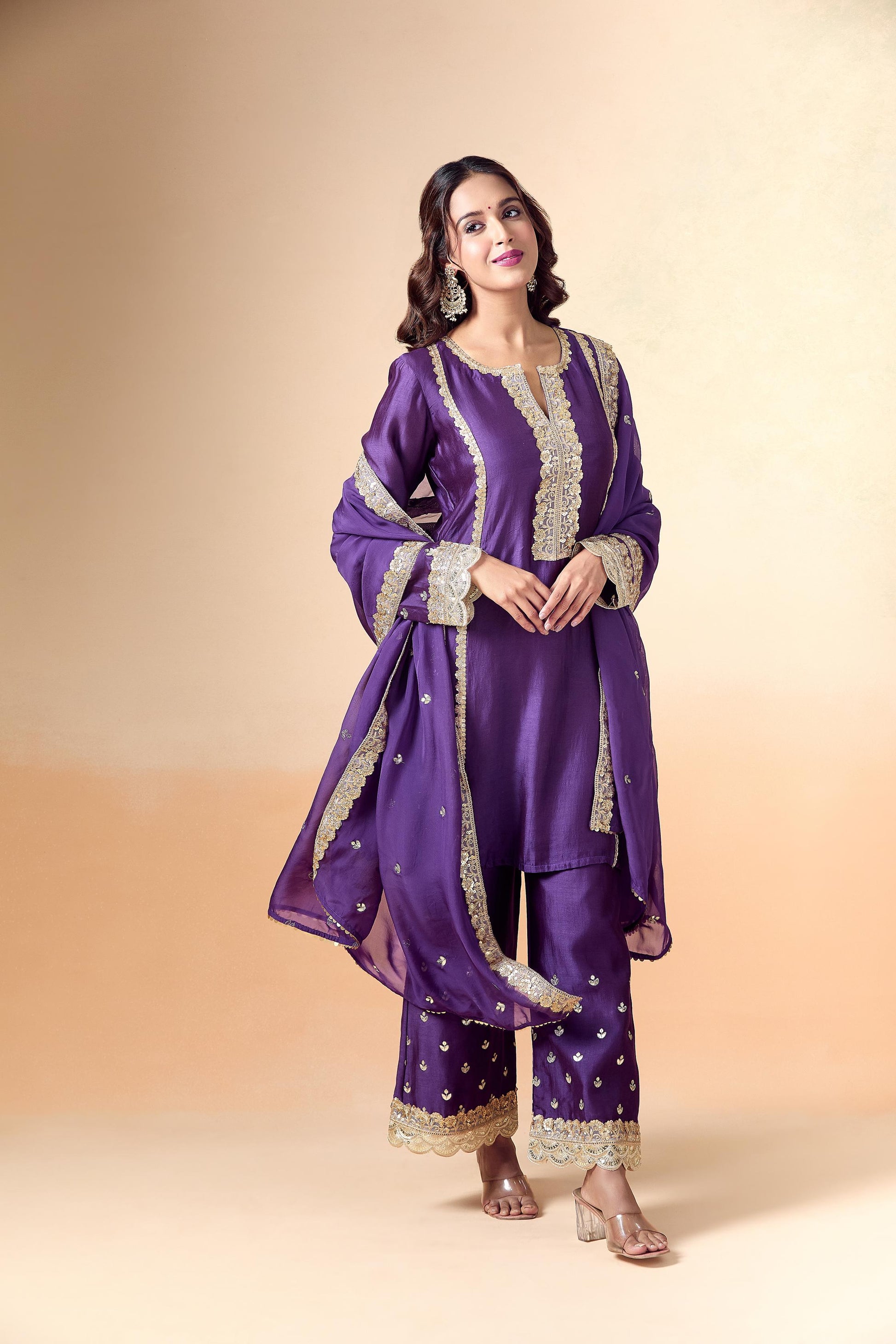 This purple chanderi kurta and pants set is embellished with hand embroidery, gota work, and a short kurta with an embellished neck yoke. The pants feature hand embroidery on the bottom, paired with a matching organza dupatta with gota work.