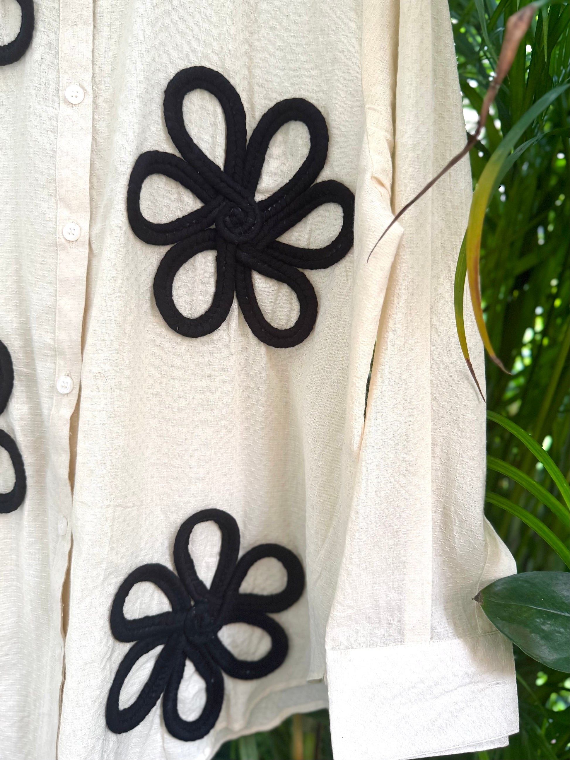 offwhite cotton dobby shirt adorned with embroidered black braided lace florals all over.