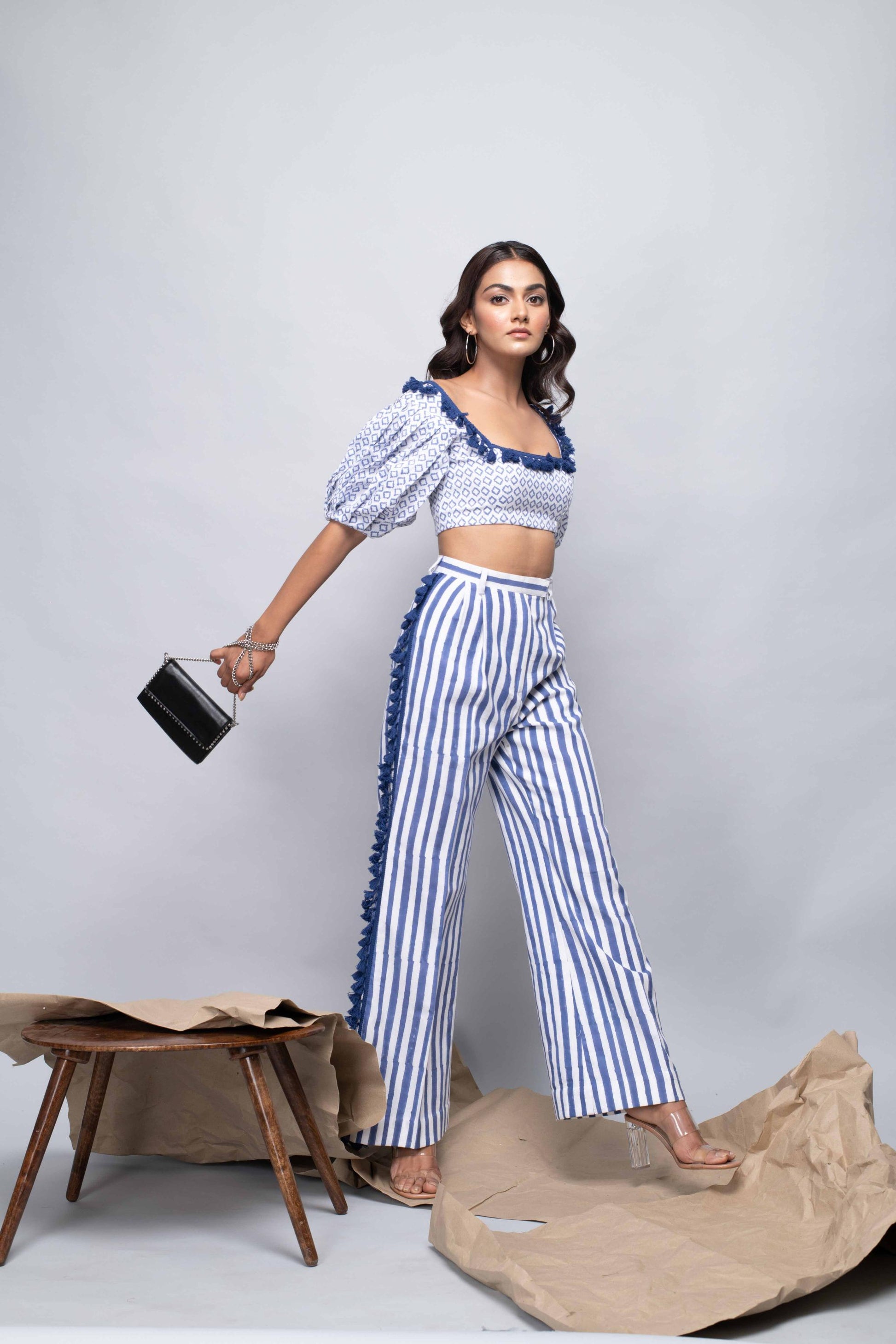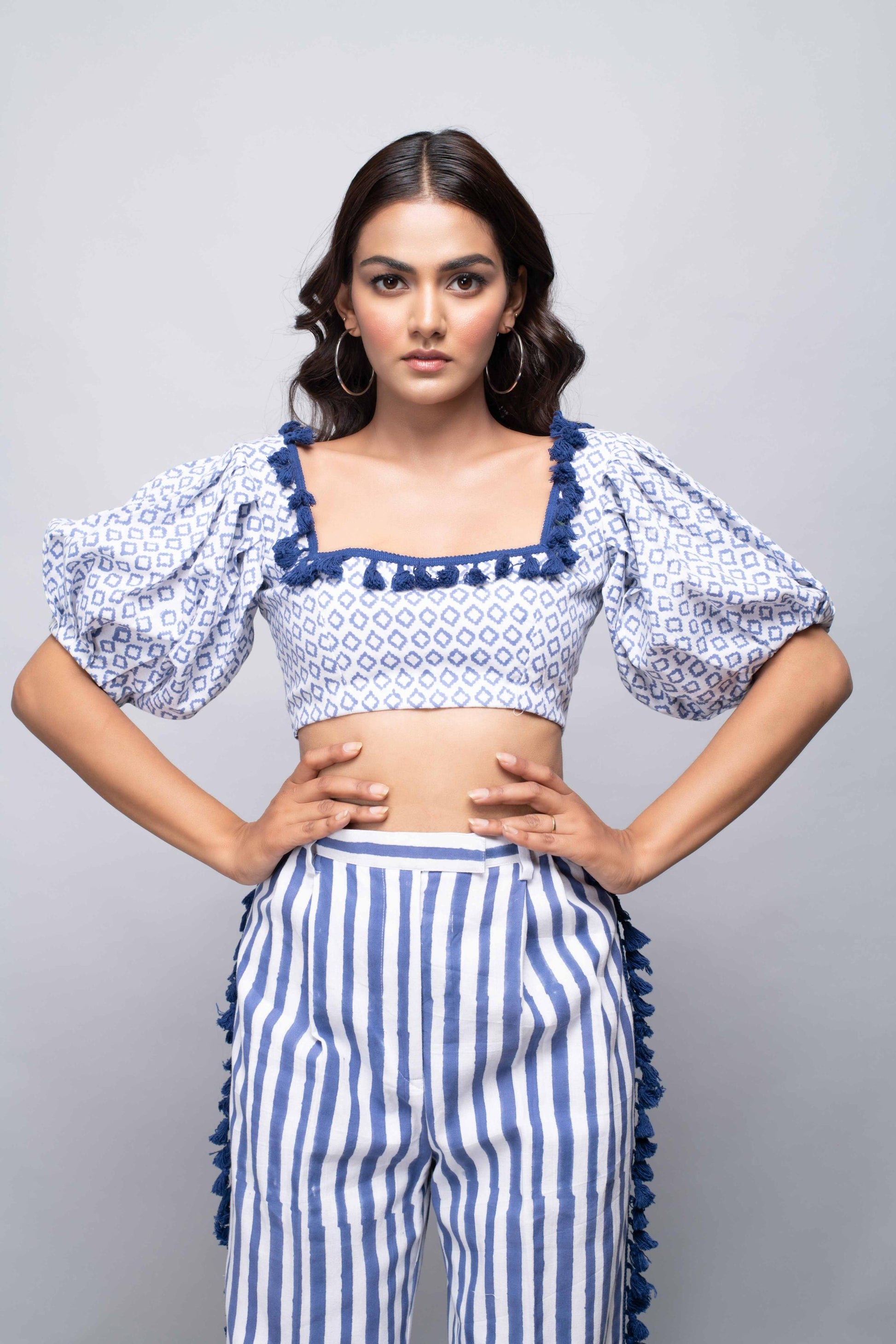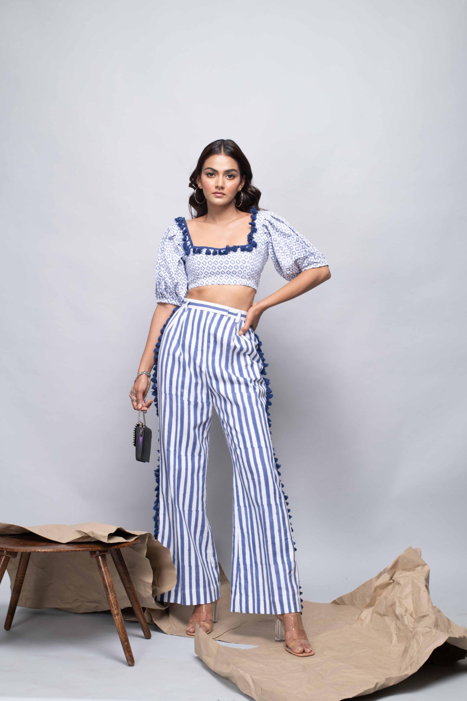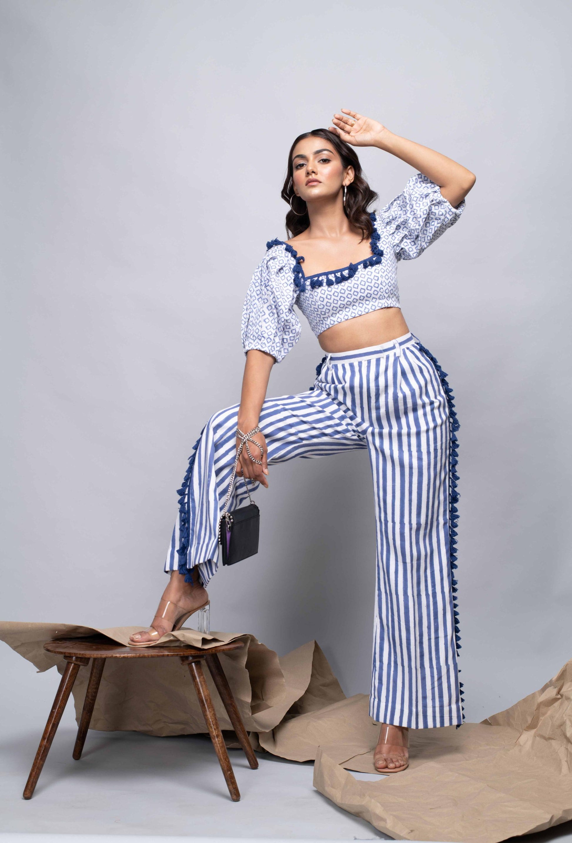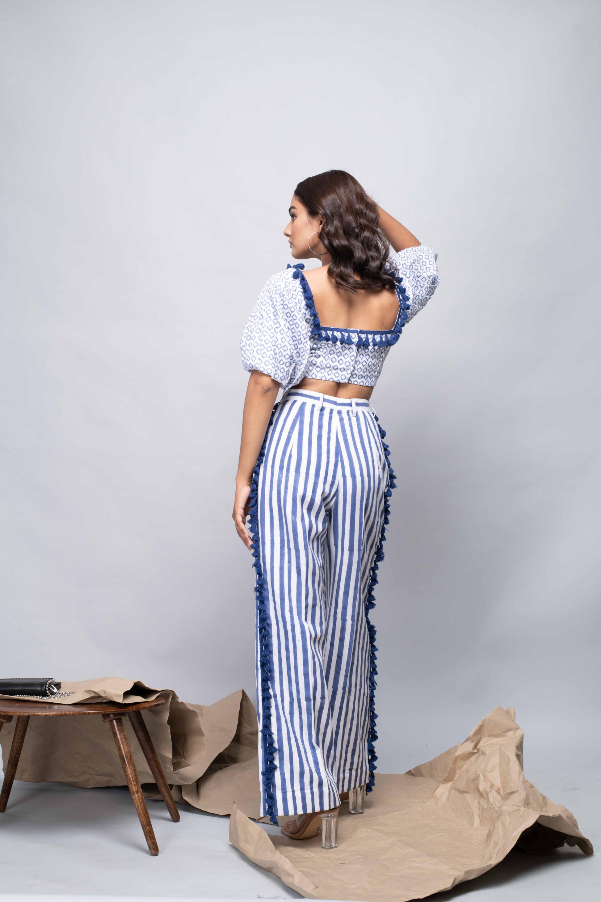 This print-on-print white and blue geometric print cotton blouse features tassel detailing, paired with high-waisted striped pants. The chic, coordinated set is perfect for casual yet trendy outings.