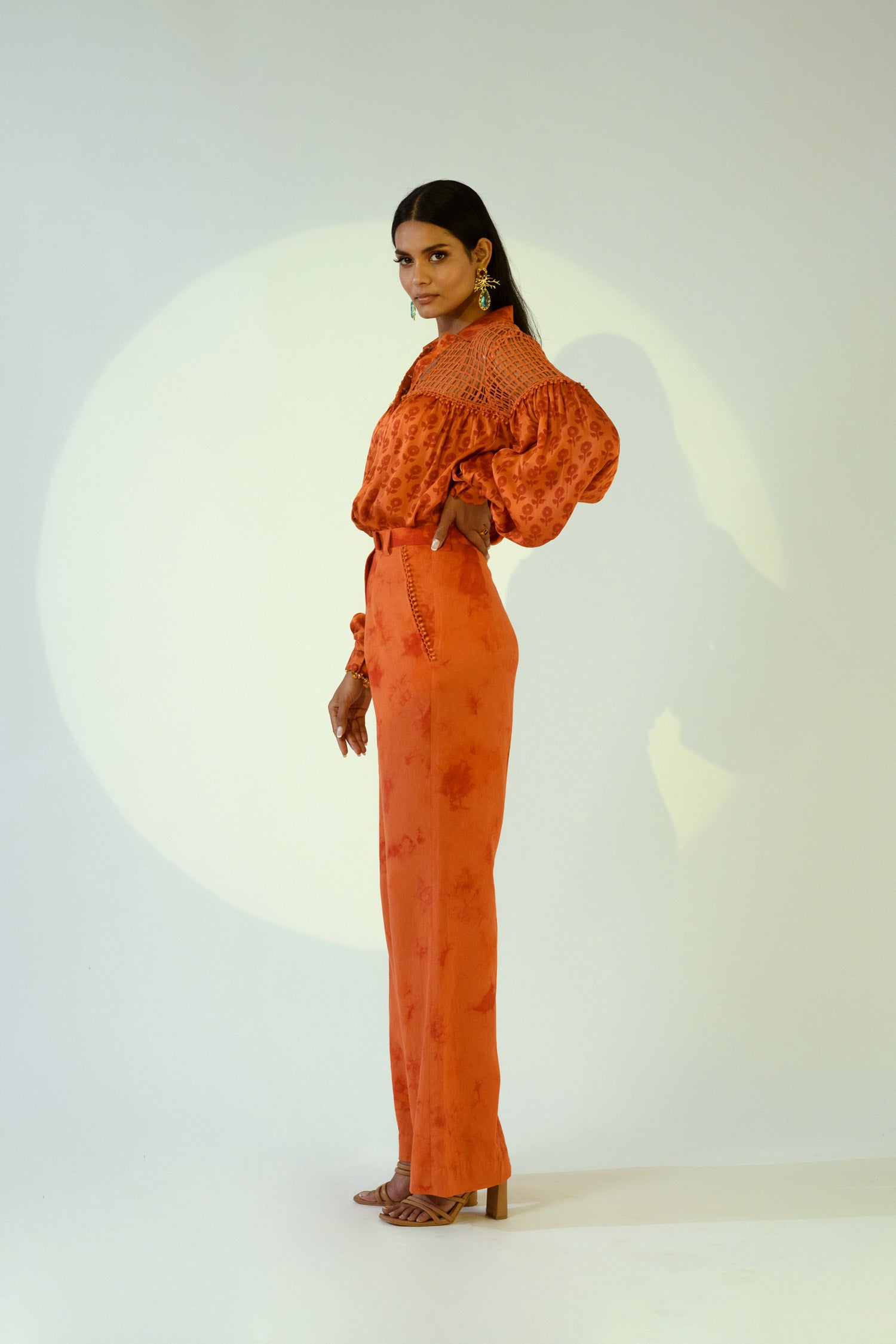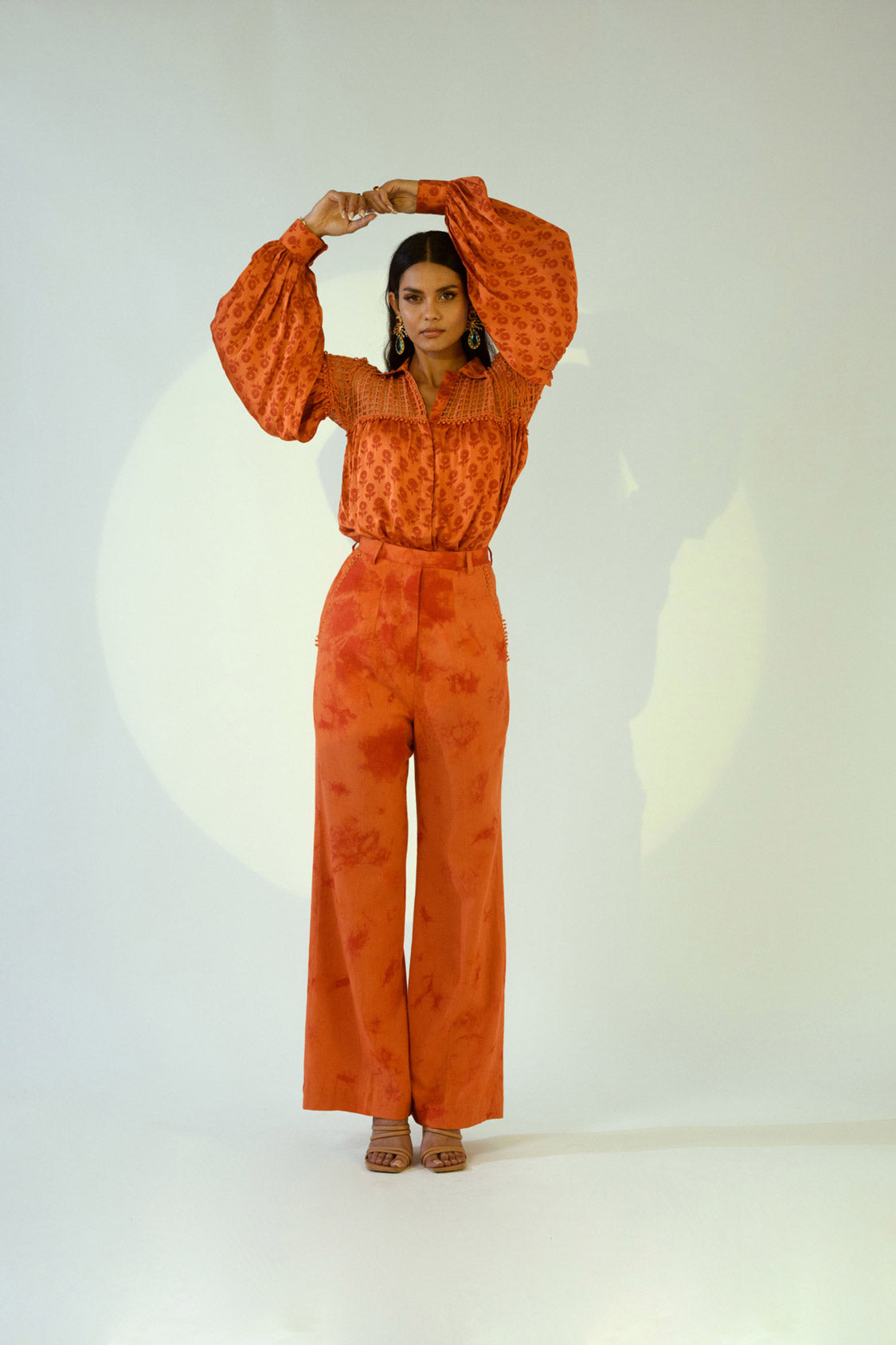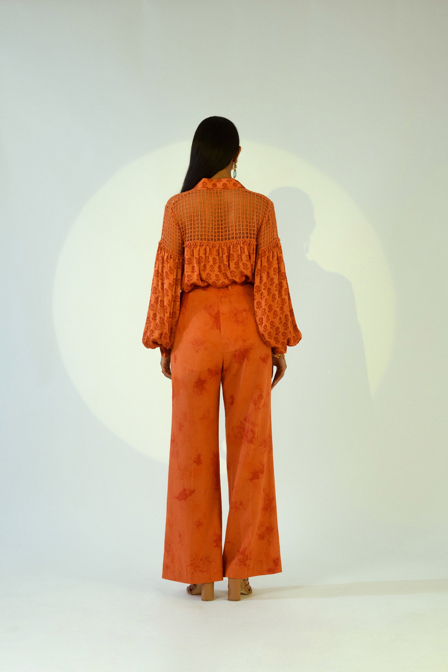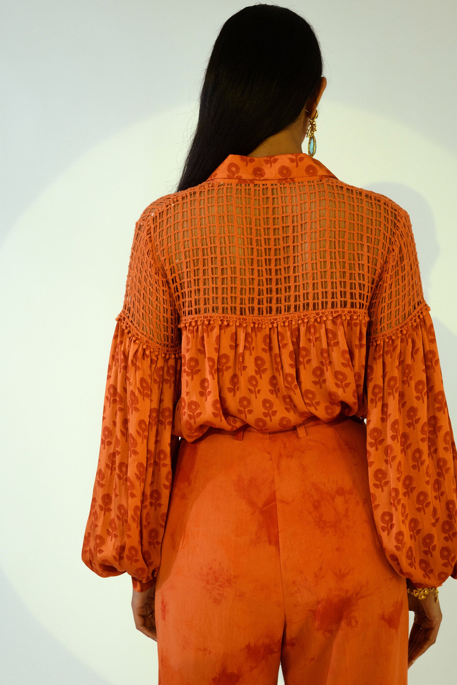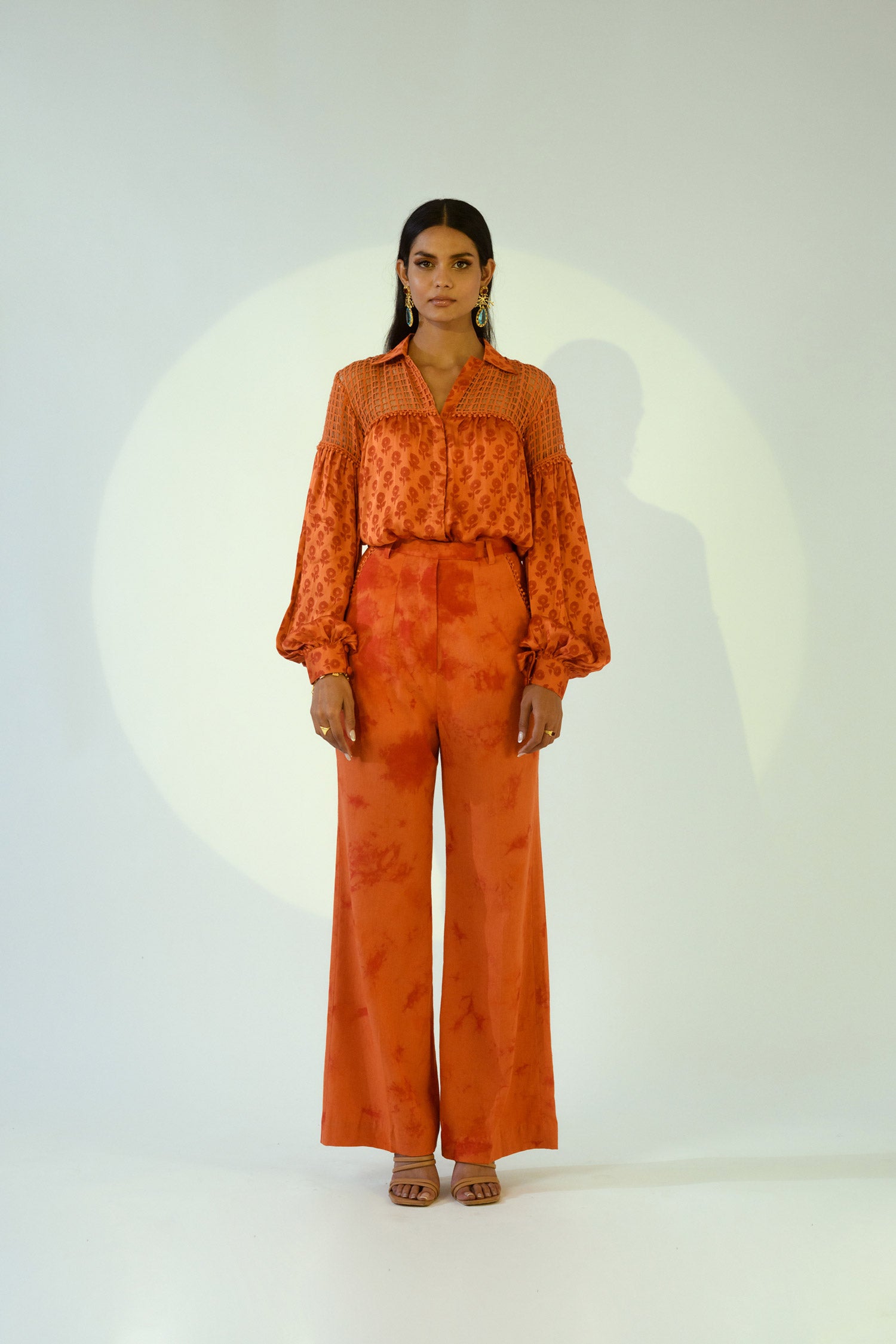 This rust silk printed shirt features lace detailing, paired with tie-dye pants. The stylish combination creates a modern and comfortable look ideal for semi-formal gatherings.