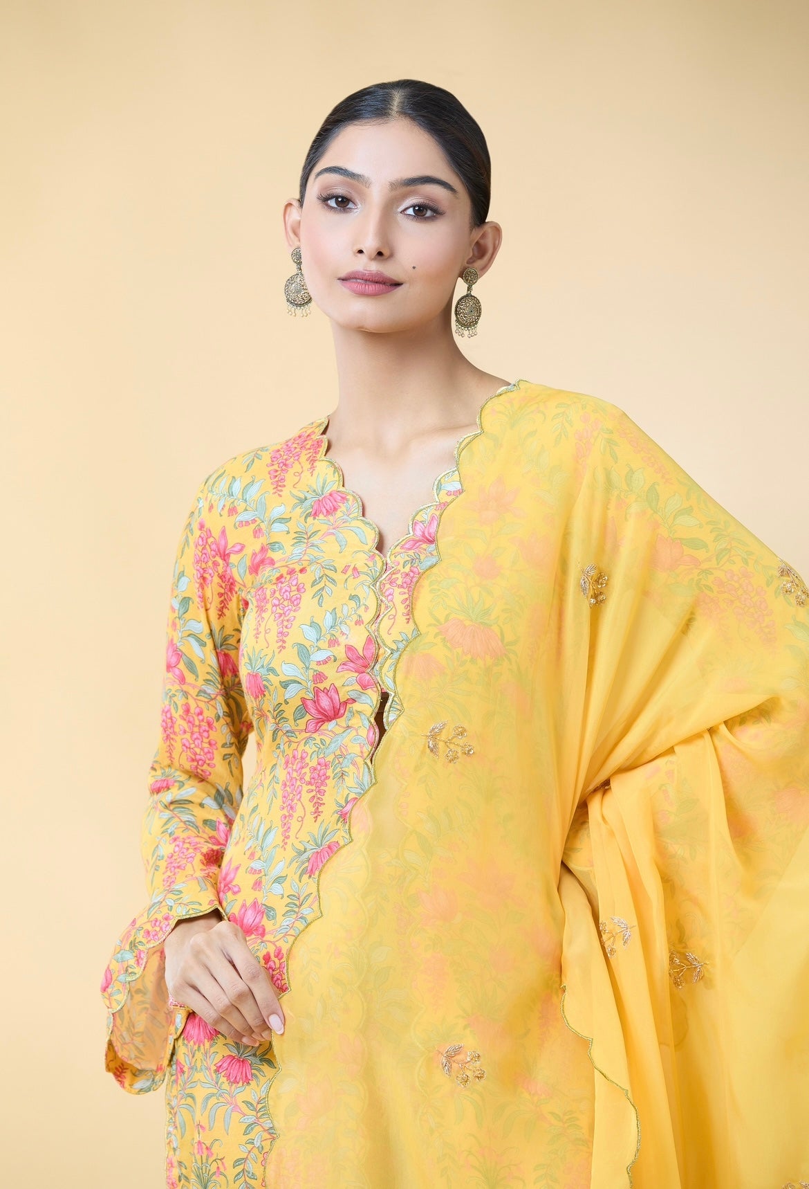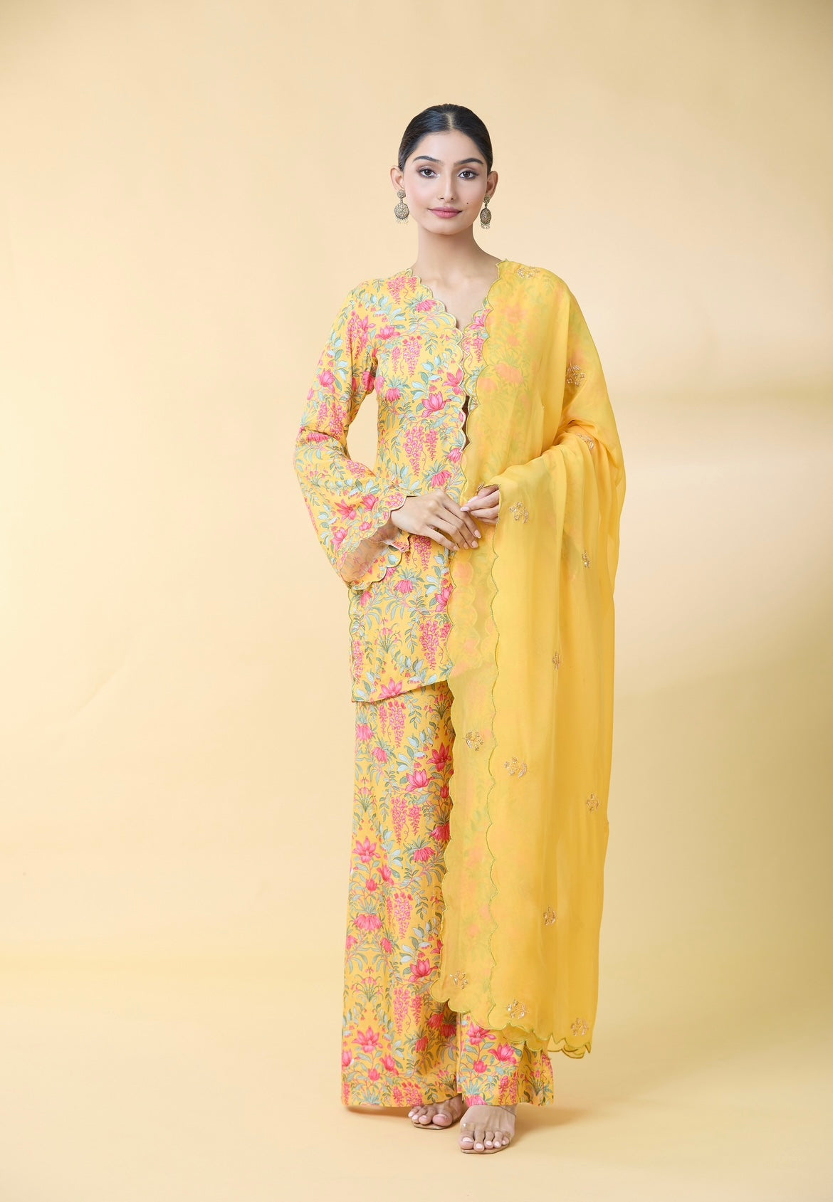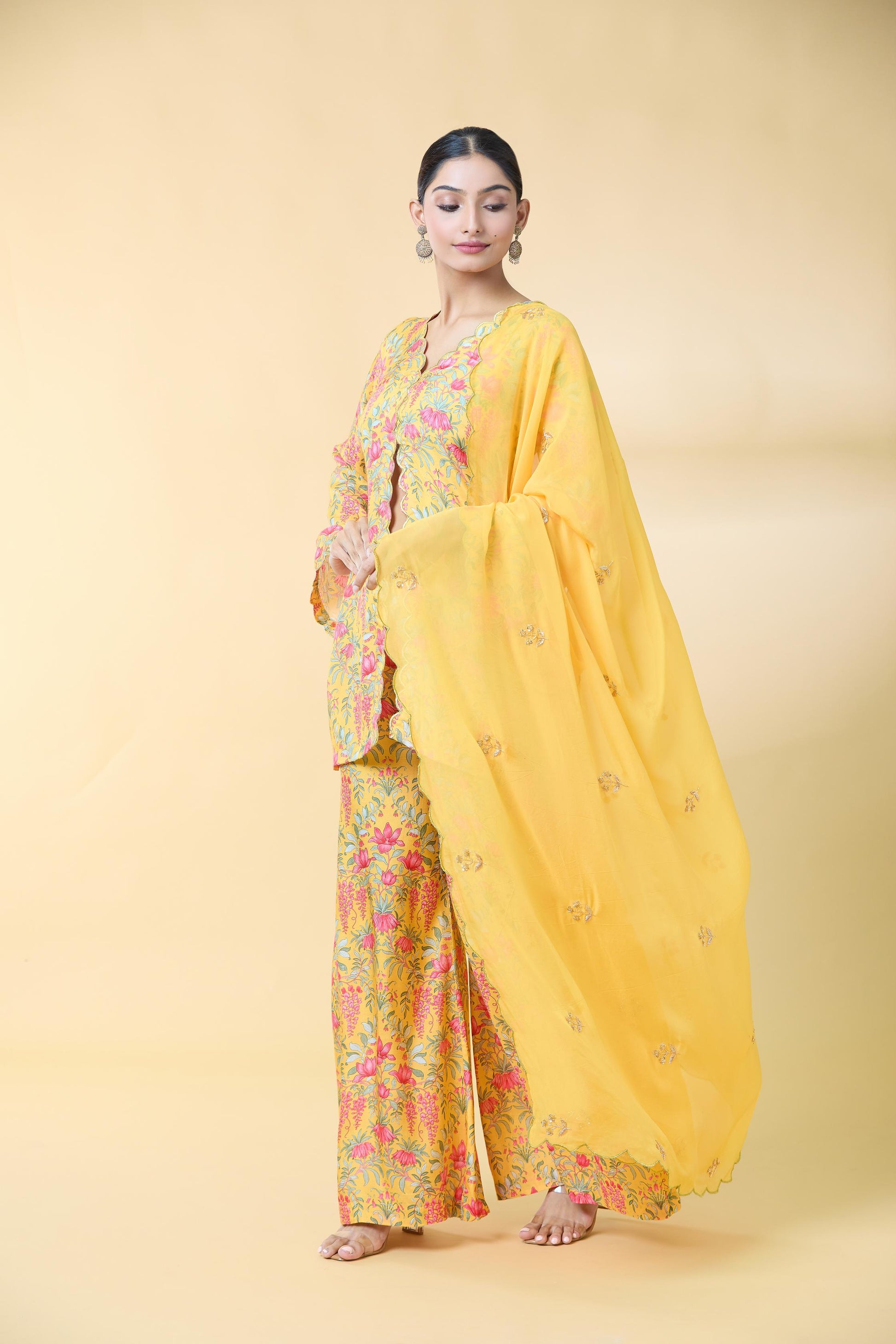 YELLOW FLORAL PRINTED SUIT SET features floral bloom prints with scallop trim. Paired with matching palazzo pants and a dupatta adorned with scattered aari and zardosi hand embroidery, perfect for festive occasions.