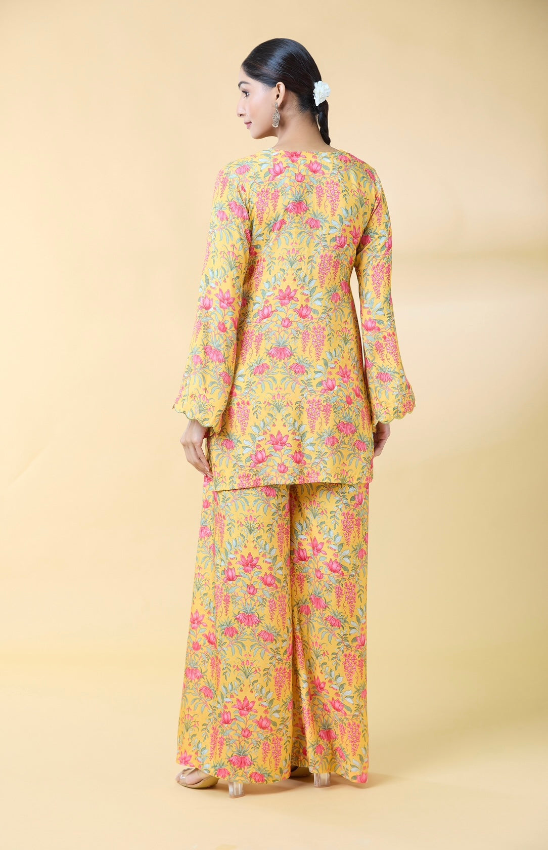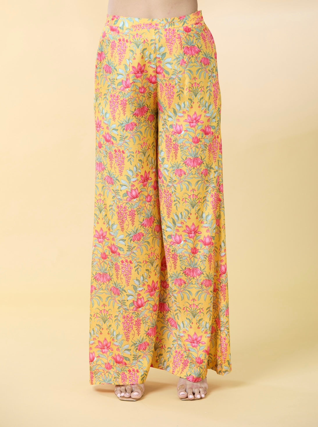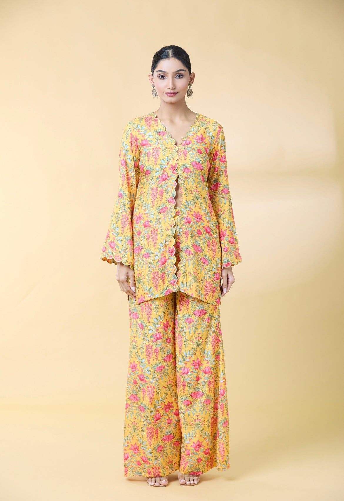 YELLOW FLORAL PRINTED SUIT SET features floral bloom prints with scallop trim. Paired with matching palazzo pants and a dupatta adorned with scattered aari and zardosi hand embroidery, perfect for festive occasions.