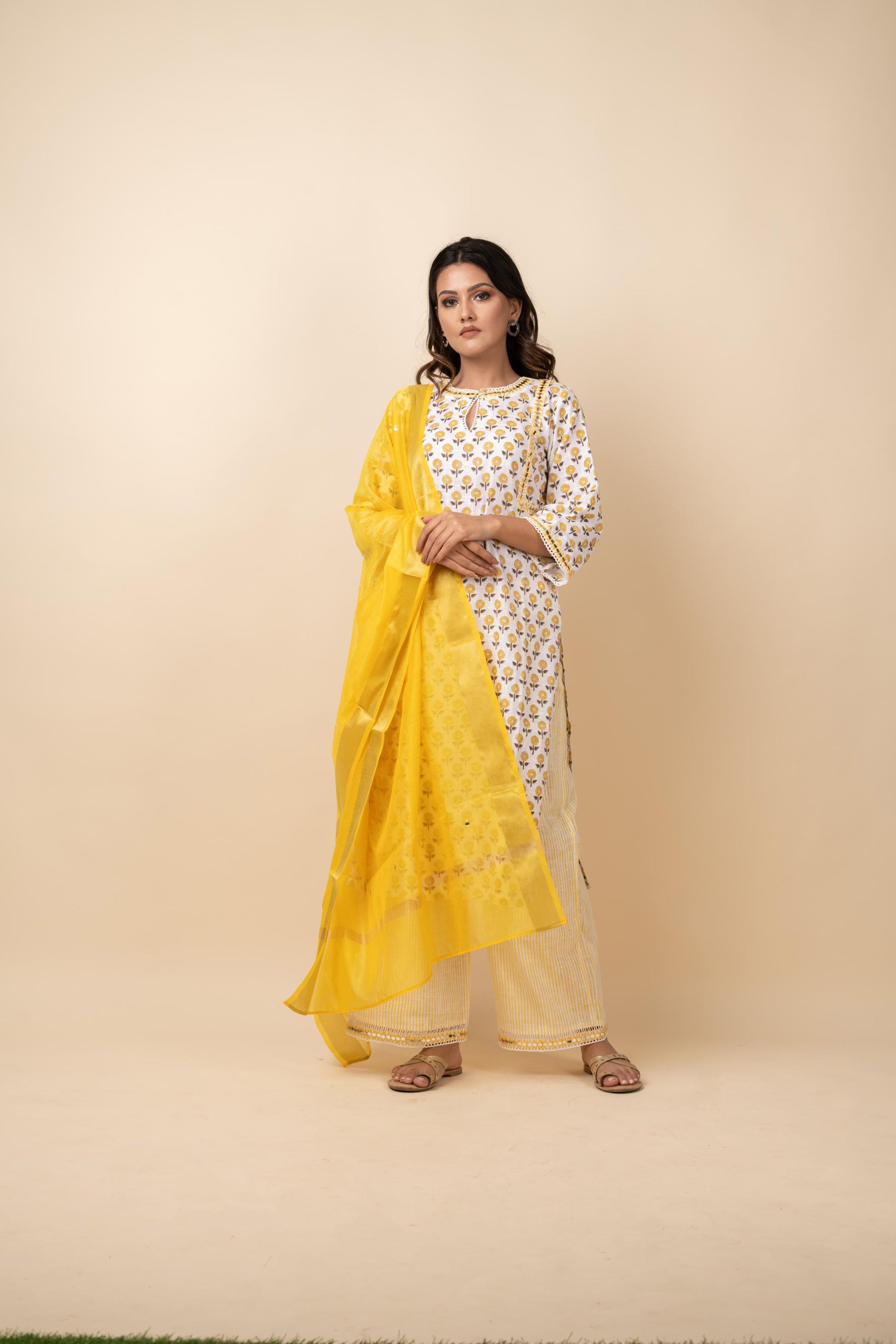This yellow butti printed suit set is decorated with mirrorwork and lace detailing, paired with a yellow mirrorwork chanderi dupatta. A perfect choice for those looking for traditional elegance with a modern twist.