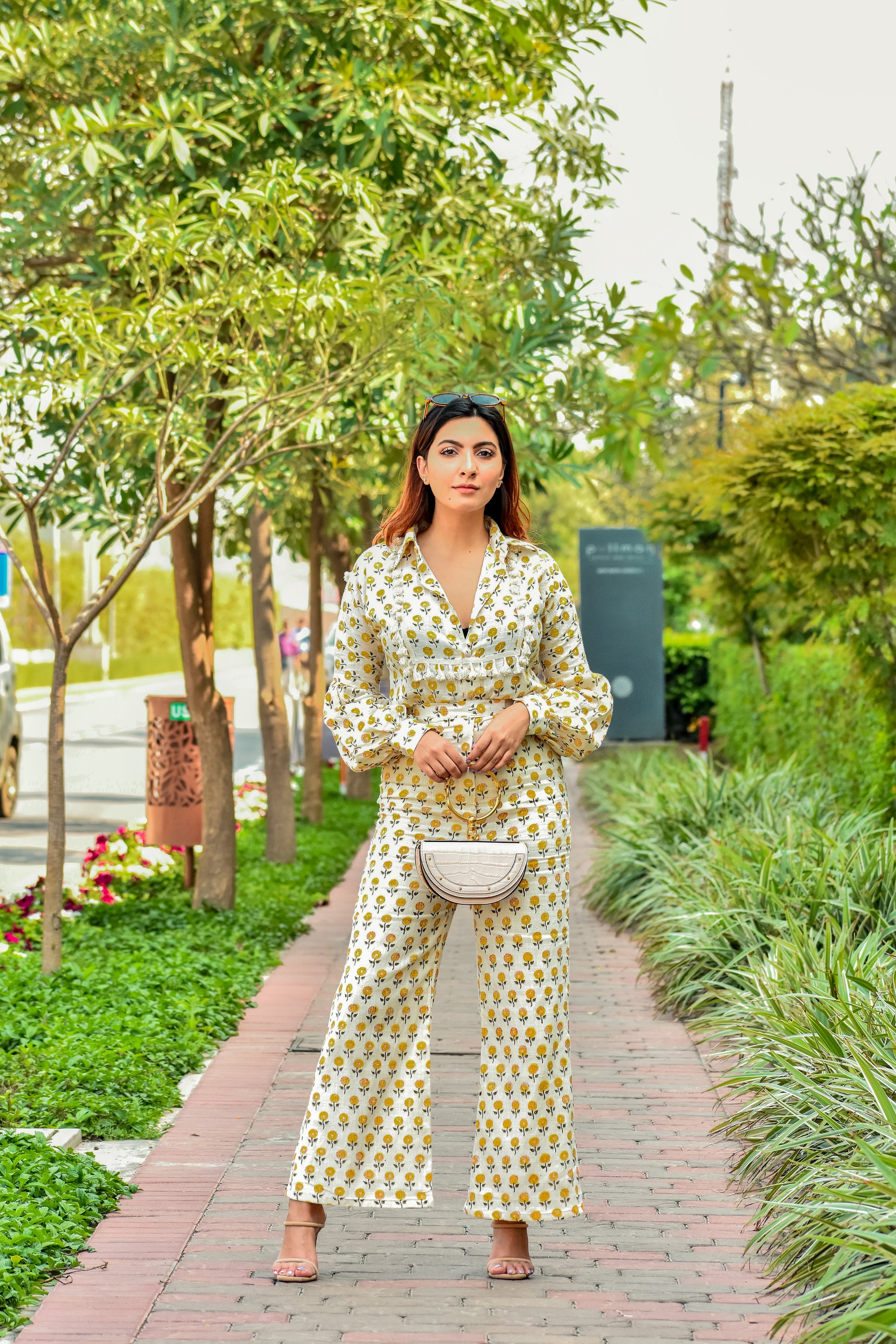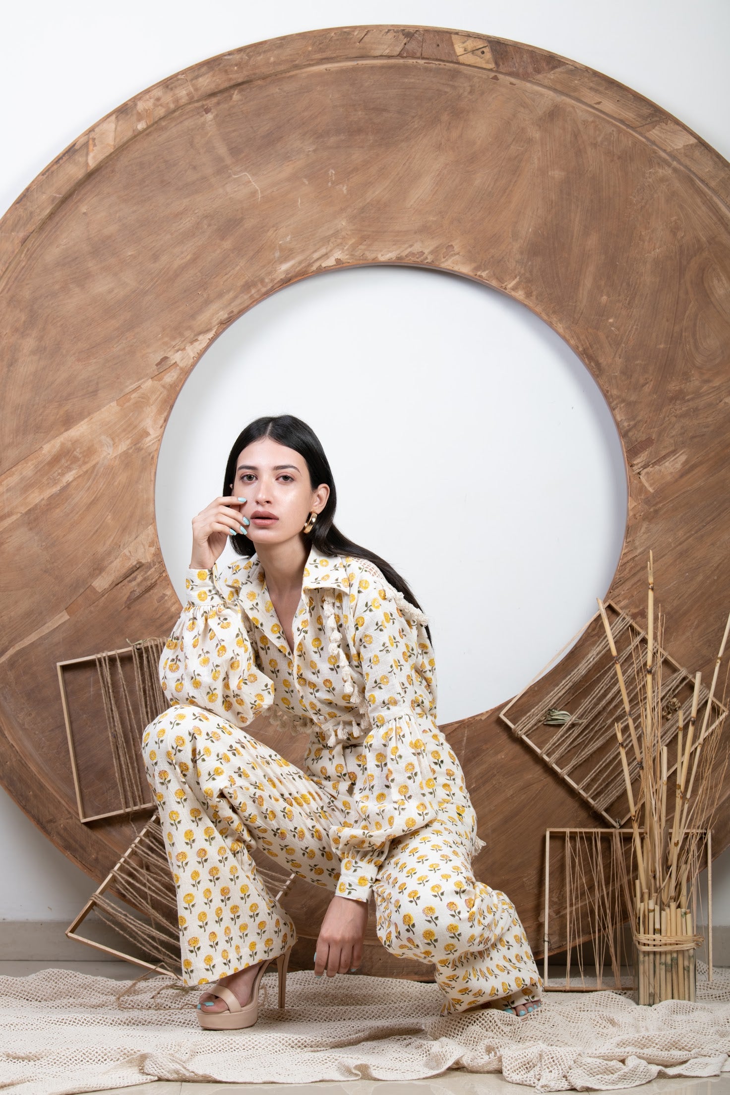 This cotton yellow floral shirt with lace detailing is paired with matching high-waisted pants, offering a stylish and coordinated look that’s perfect for warm, casual occasions.