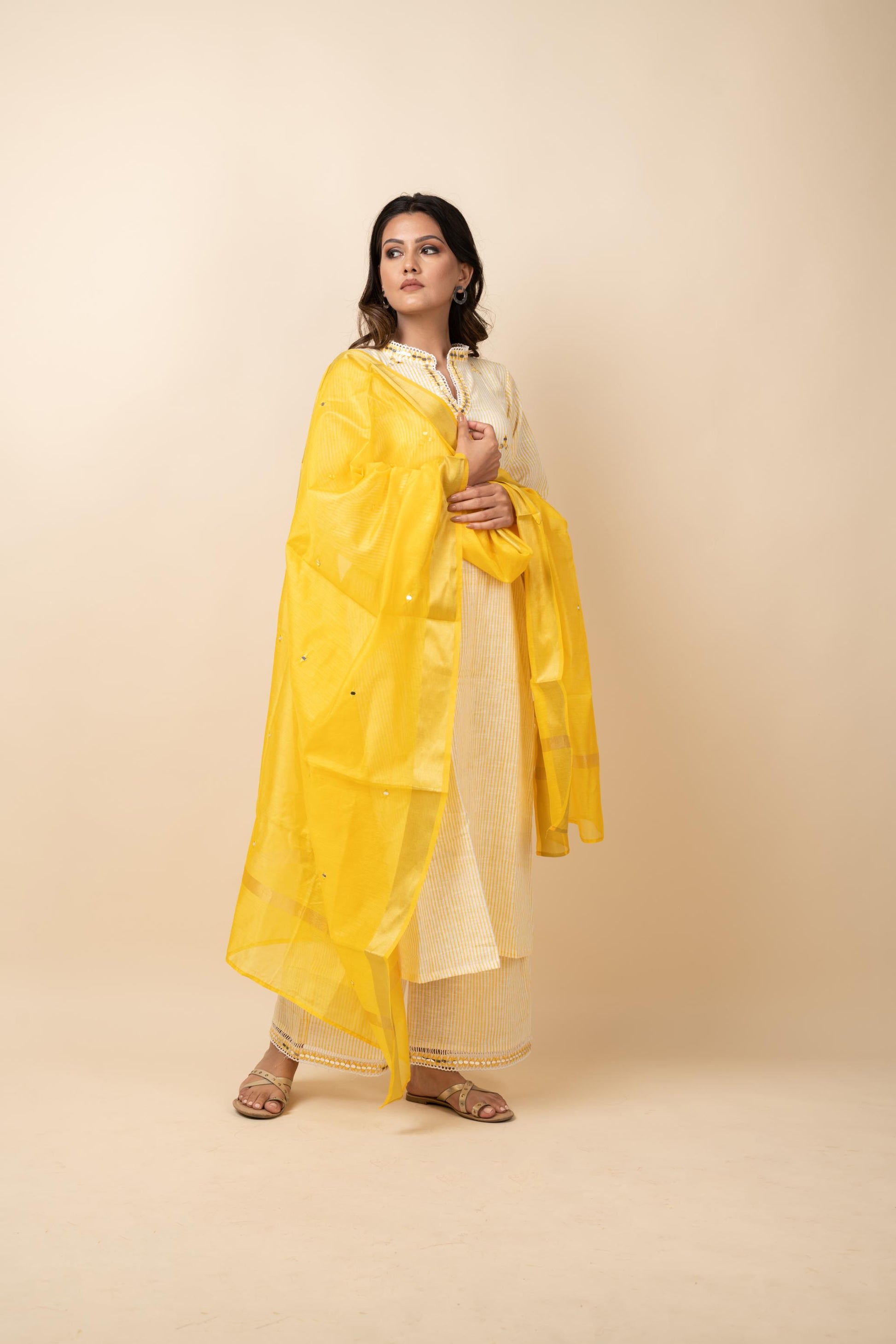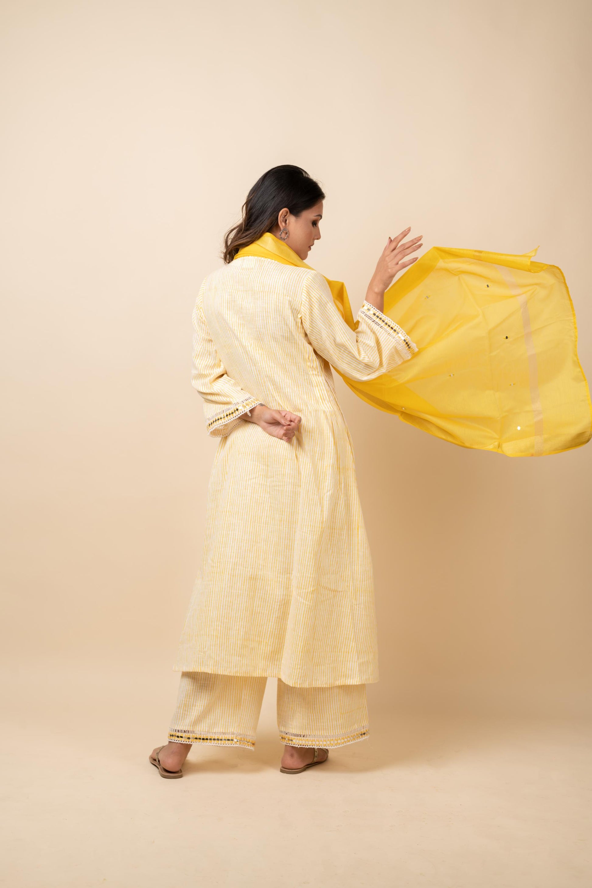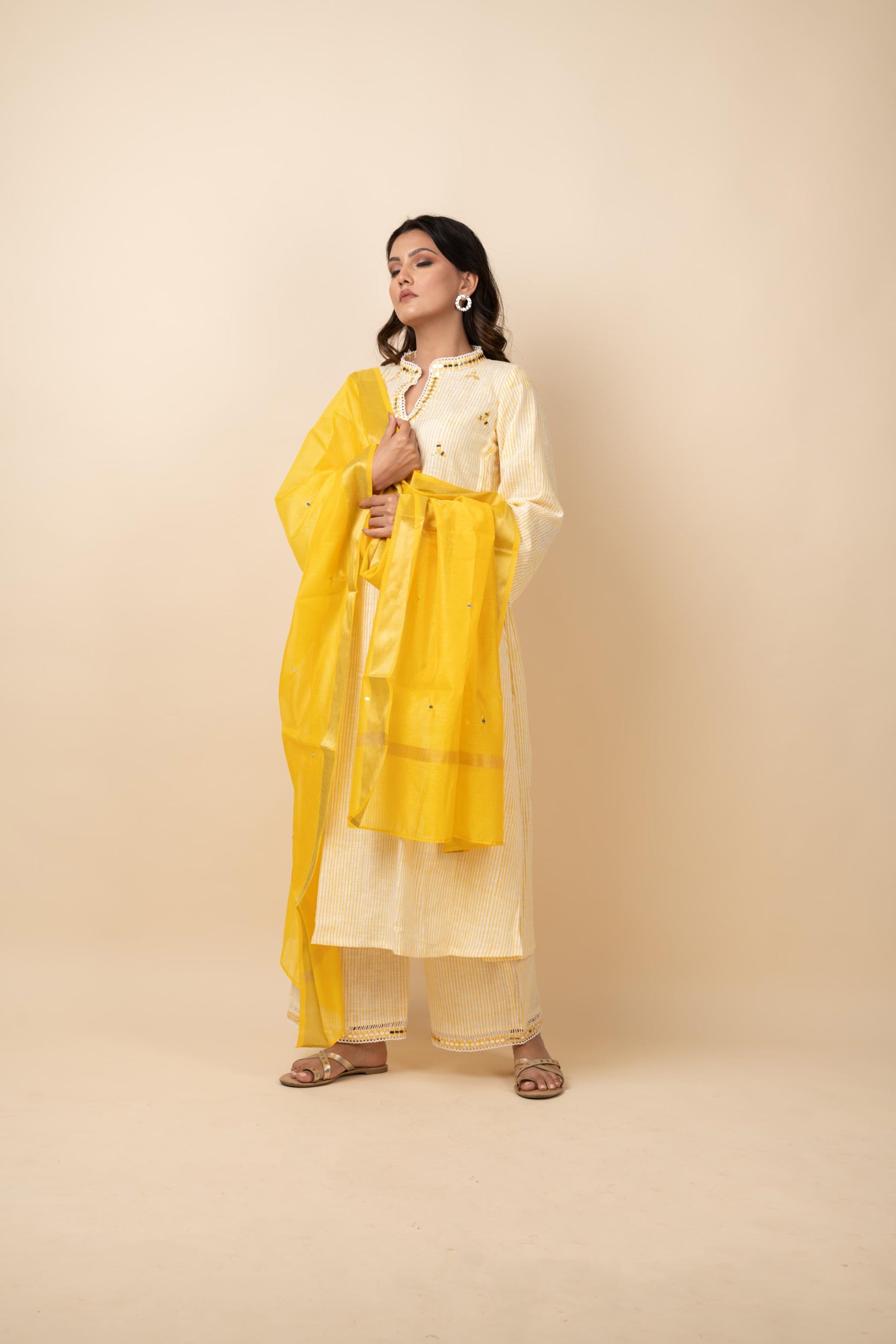 A yellow striped printed suit set, enhanced with mirrorwork and lace detailing, paired with a mirrorwork chanderi dupatta. This set combines traditional elements with contemporary style, ideal for festive occasions.