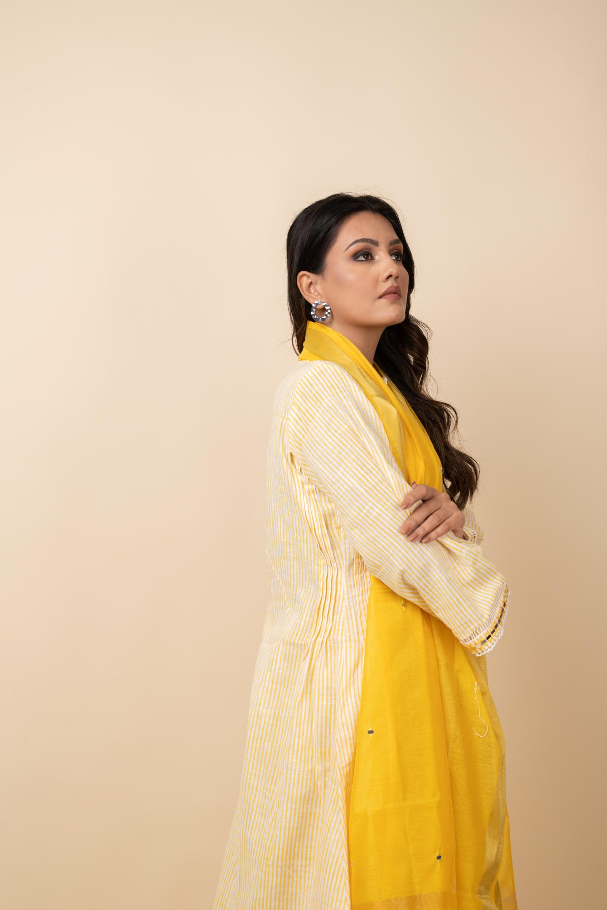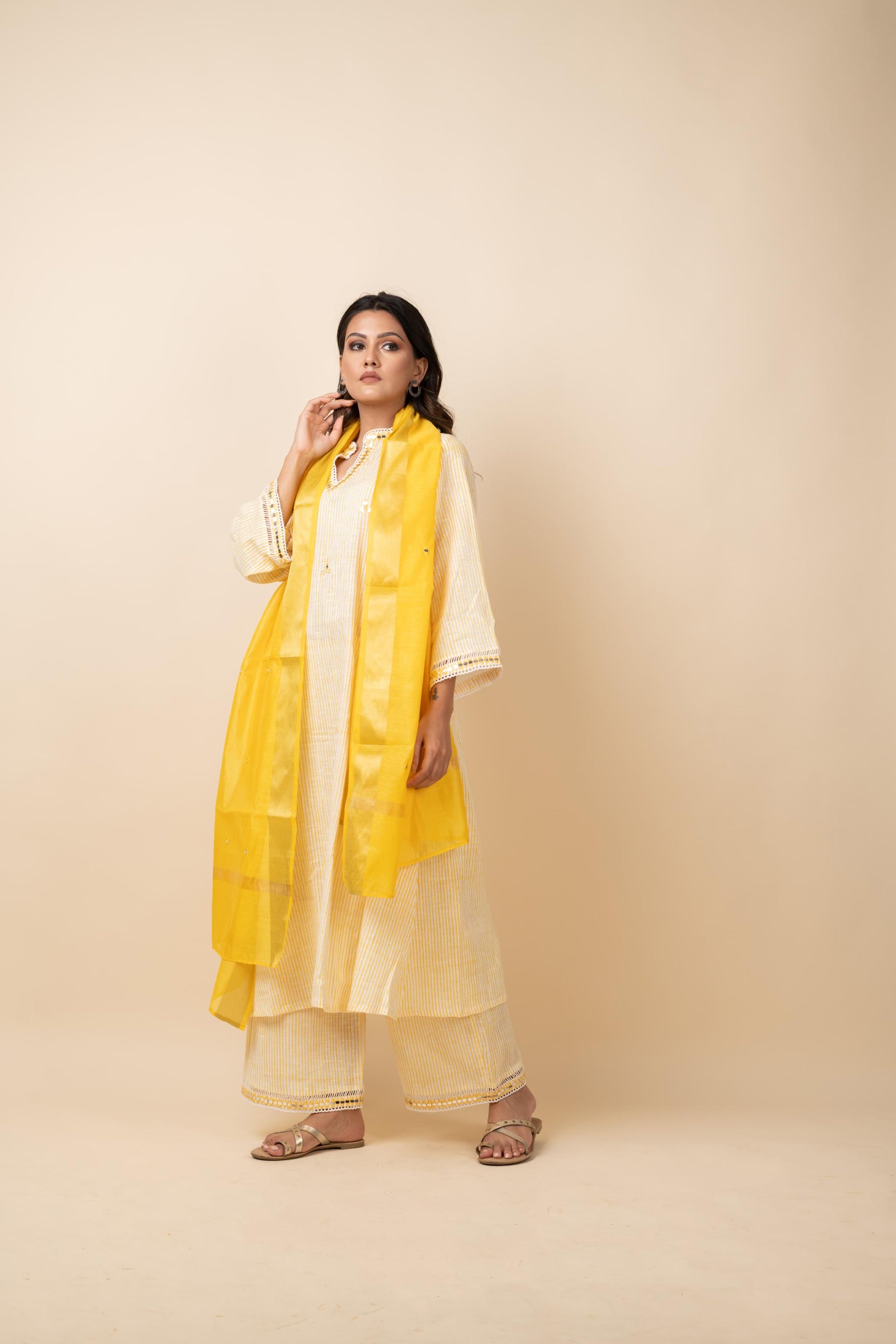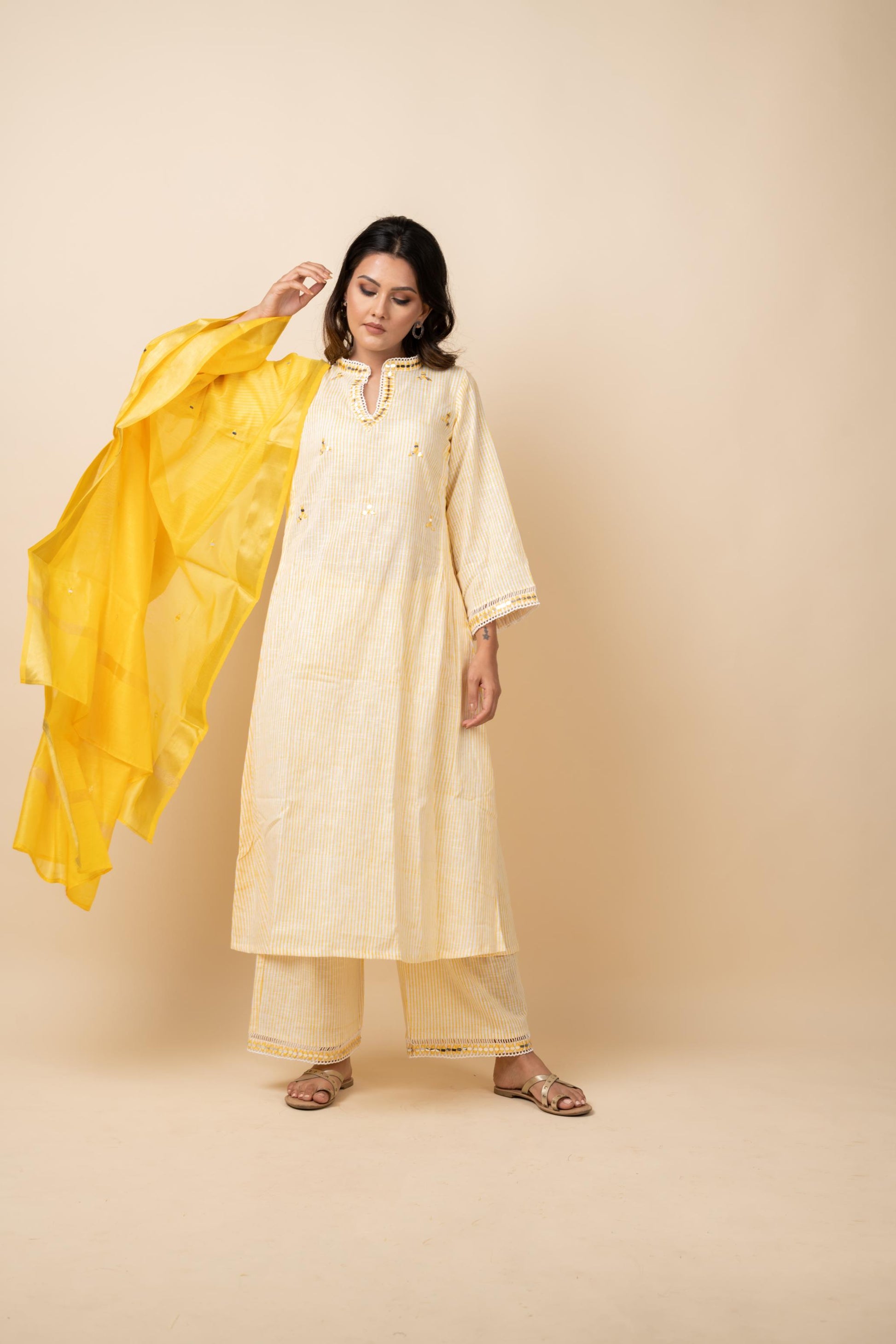 A yellow striped printed suit set, enhanced with mirrorwork and lace detailing, paired with a mirrorwork chanderi dupatta. This set combines traditional elements with contemporary style, ideal for festive occasions.